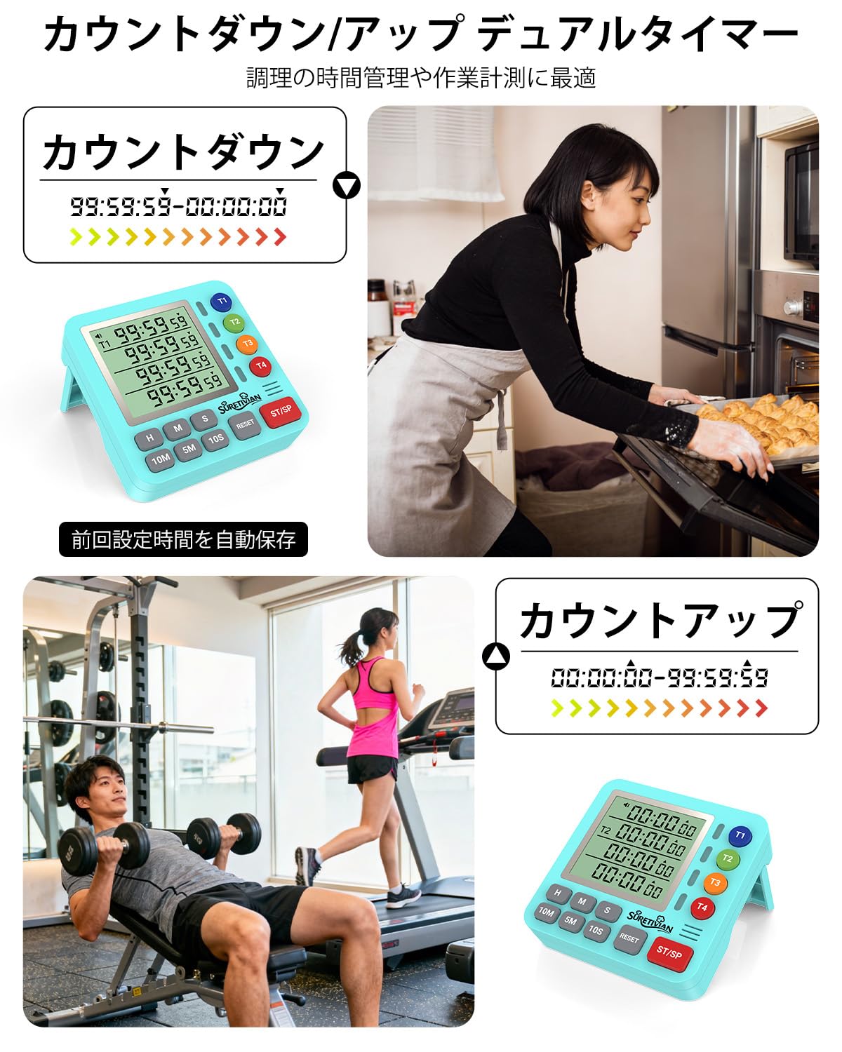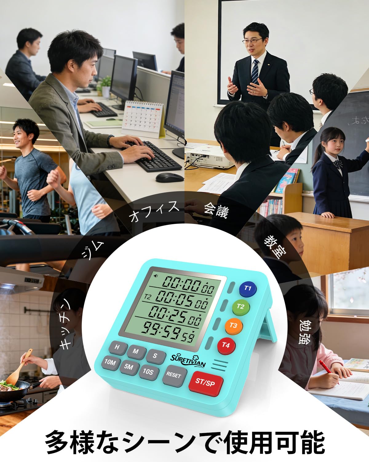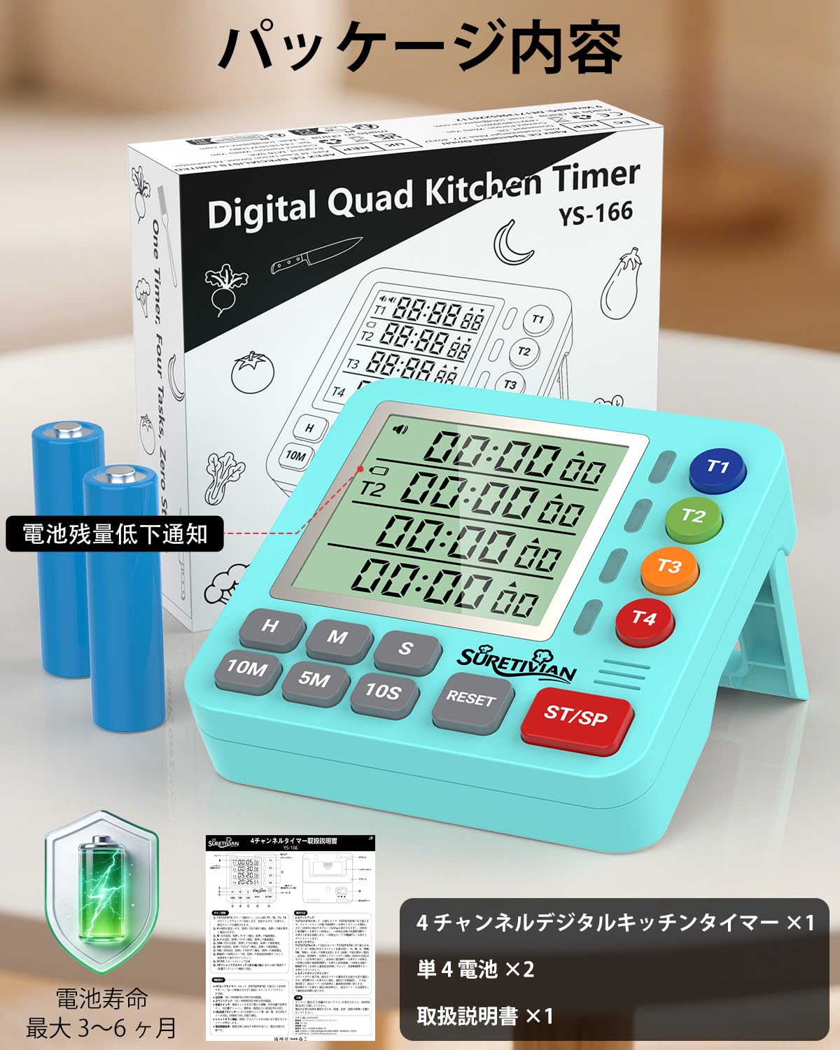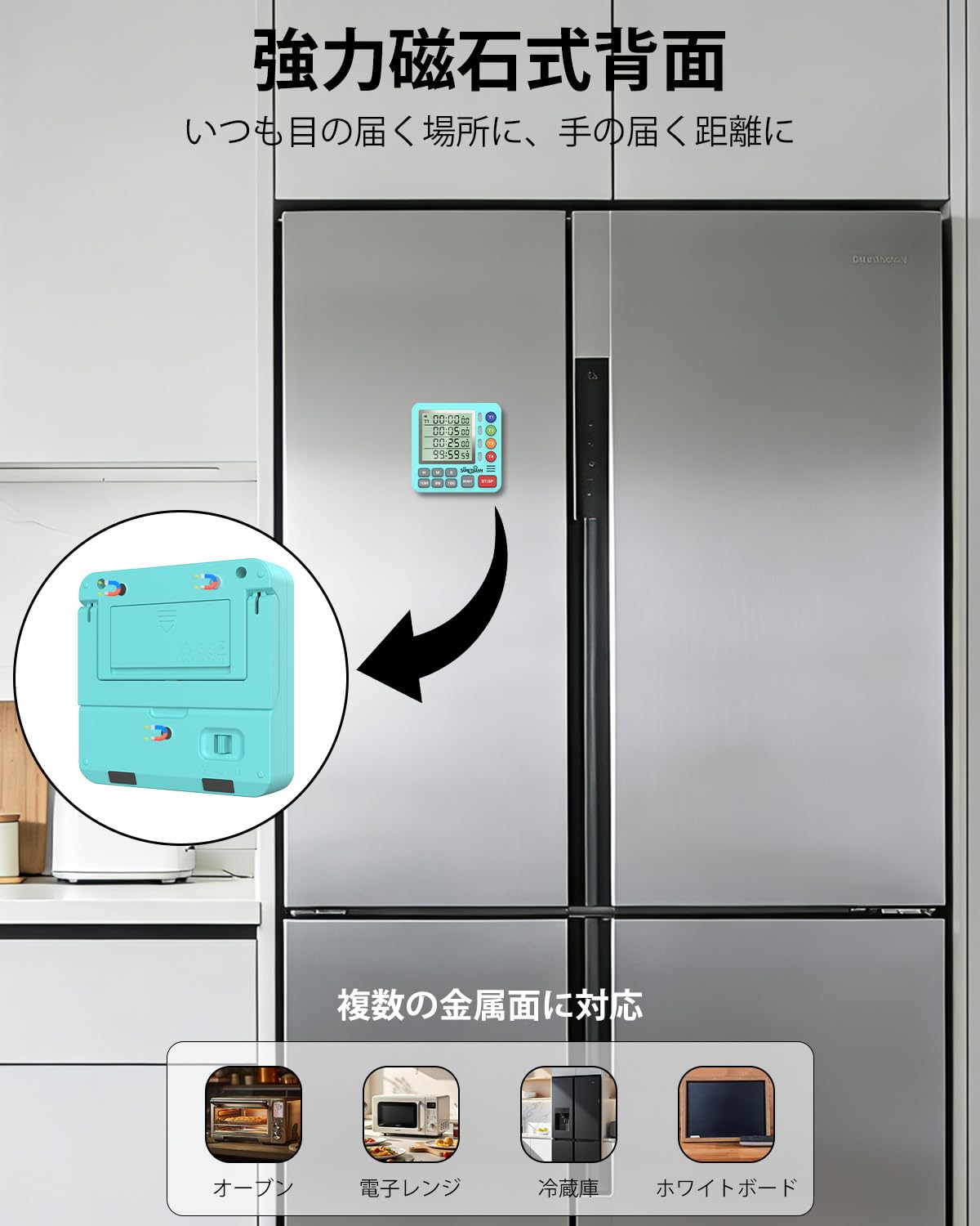 キッチンタイマー 4チャンネル デジタルタイマー 大画面 アラーム・静音切替 カウントアップ/カウントダウン タイマー ・卵・勉強・教室・運動用 電池付 (ミントグリーン)