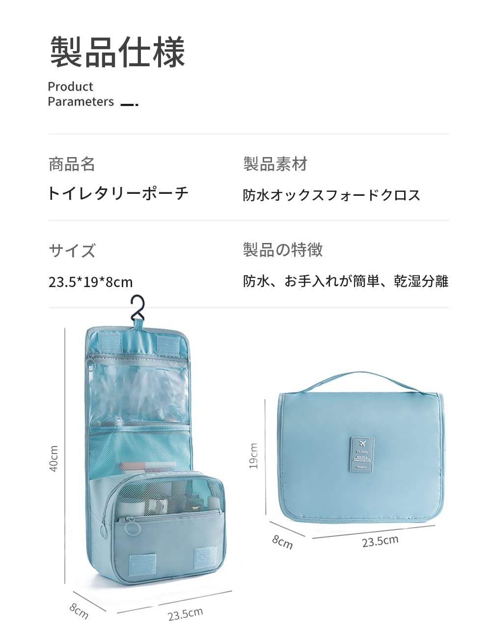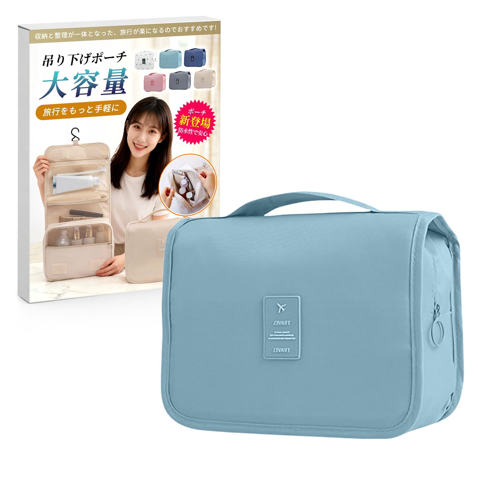 ALLMIRA トラベルポーチ 吊り下げ ポーチ 旅行用 洗面用具 トイレタリーバッグ 大容量 防水 フック付き 旅行 バッグ トラベル おしゃれ (ライトブルー)