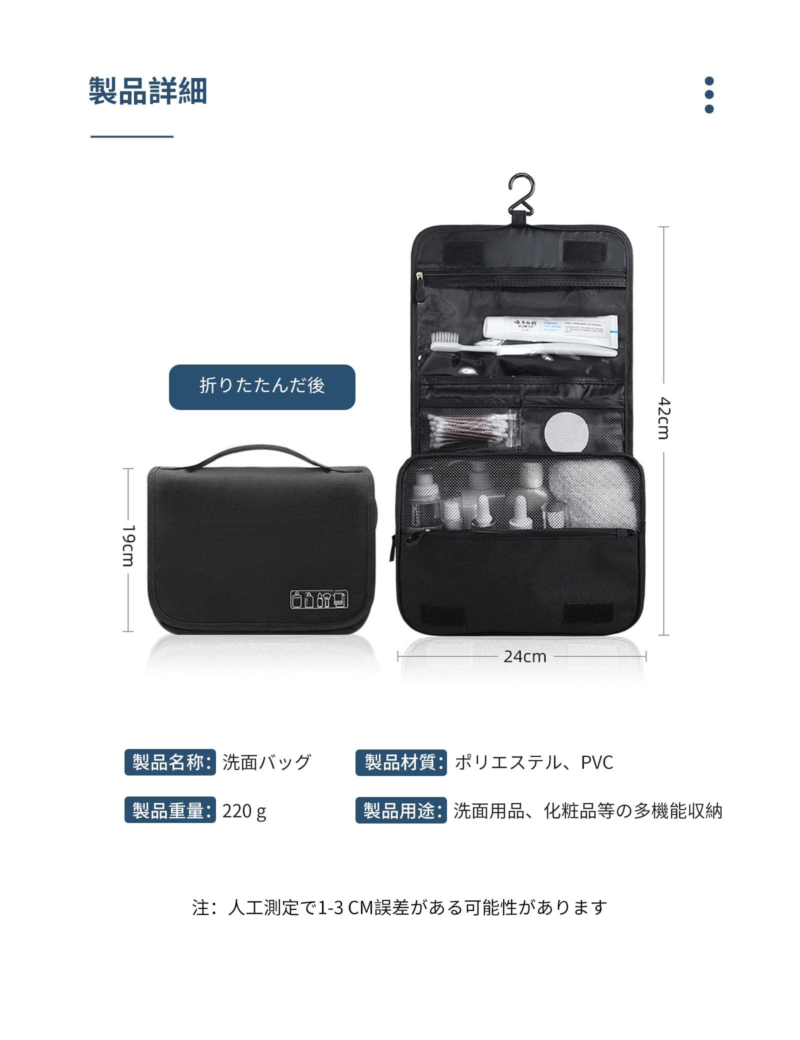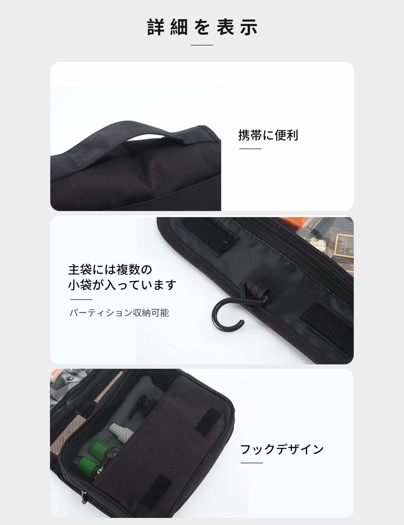 説明【メイン素材】: 高品質のオックスフォード生地,はあなたの洗面用具の清潔と乾燥をさせます。通気性が良く異臭はなく、防水性、防塵性と耐用性もあります。 【収納力に優れる】化粧品、ヘアアクセサリー、シェービングツール、小物などの小物を収納できる3層ポケットを装備。前面が開放され、中身が一目でわかり、出入りがスムーズ。小型ドライヤーも快適に収納できます。 メインポケットは広いスペースがあり、ゴムバンドで仕切られており、化粧品ボトルを直立させて液体化粧品の漏れを防ぐことができます。 背面にはマスクを収納するためのポケットもあります。 【壁掛け可能】吊り下げ用の360°回転フック付きなので、壁に引っ掛けておけば物を取り出すのは楽々、物を取ったり置いたり便利です。それに、丁寧に縫製された手提げも付いているので、どこにも持ち運ぶ可能です。 【広い用途】出張やレジャー、旅行用にはぴったりとして、スポーツジム、アウトドア、ゴルフ場、キャンプ、温泉、アウトドア、自動車や家のトイレ中などの様々なシーンで大活躍します。