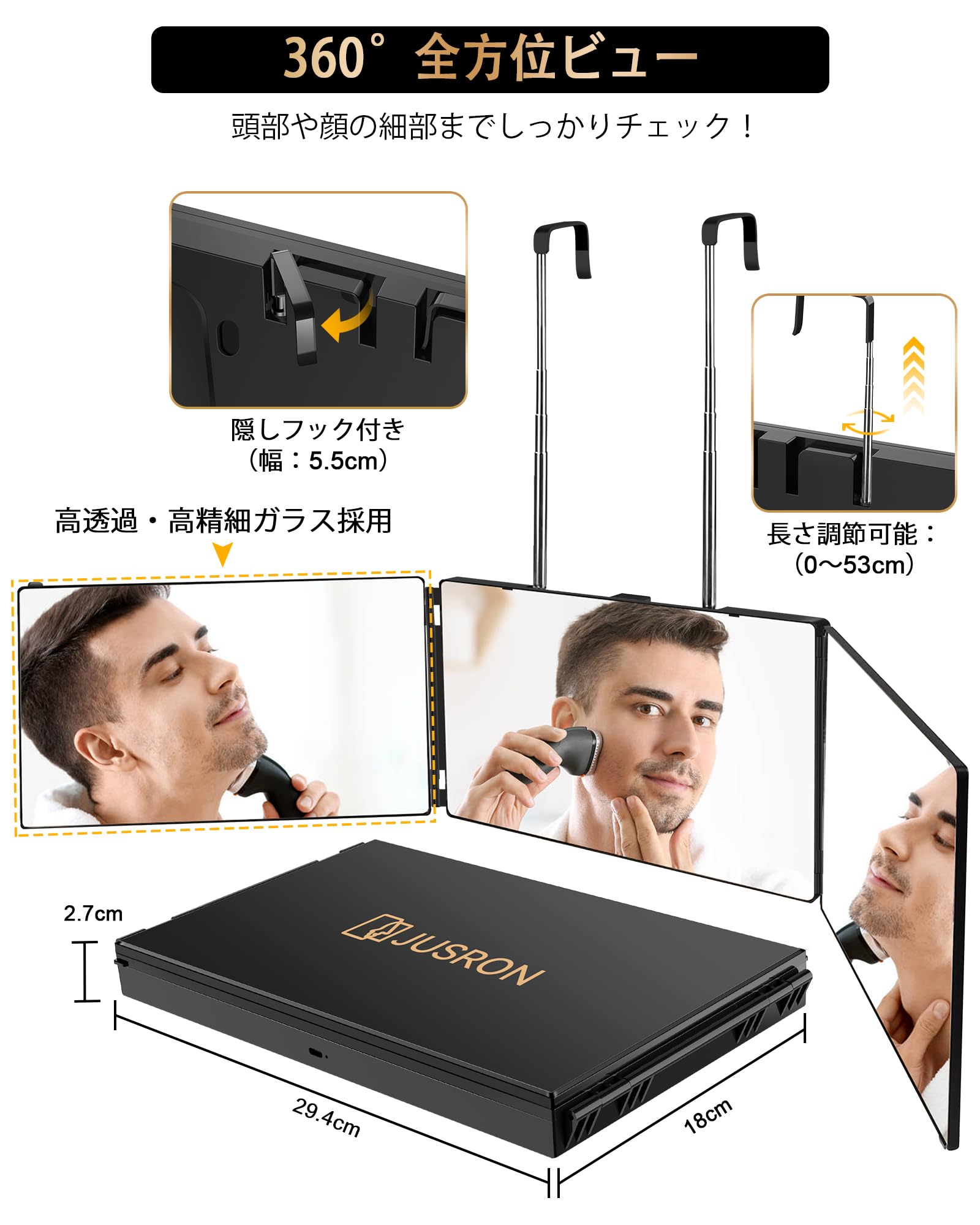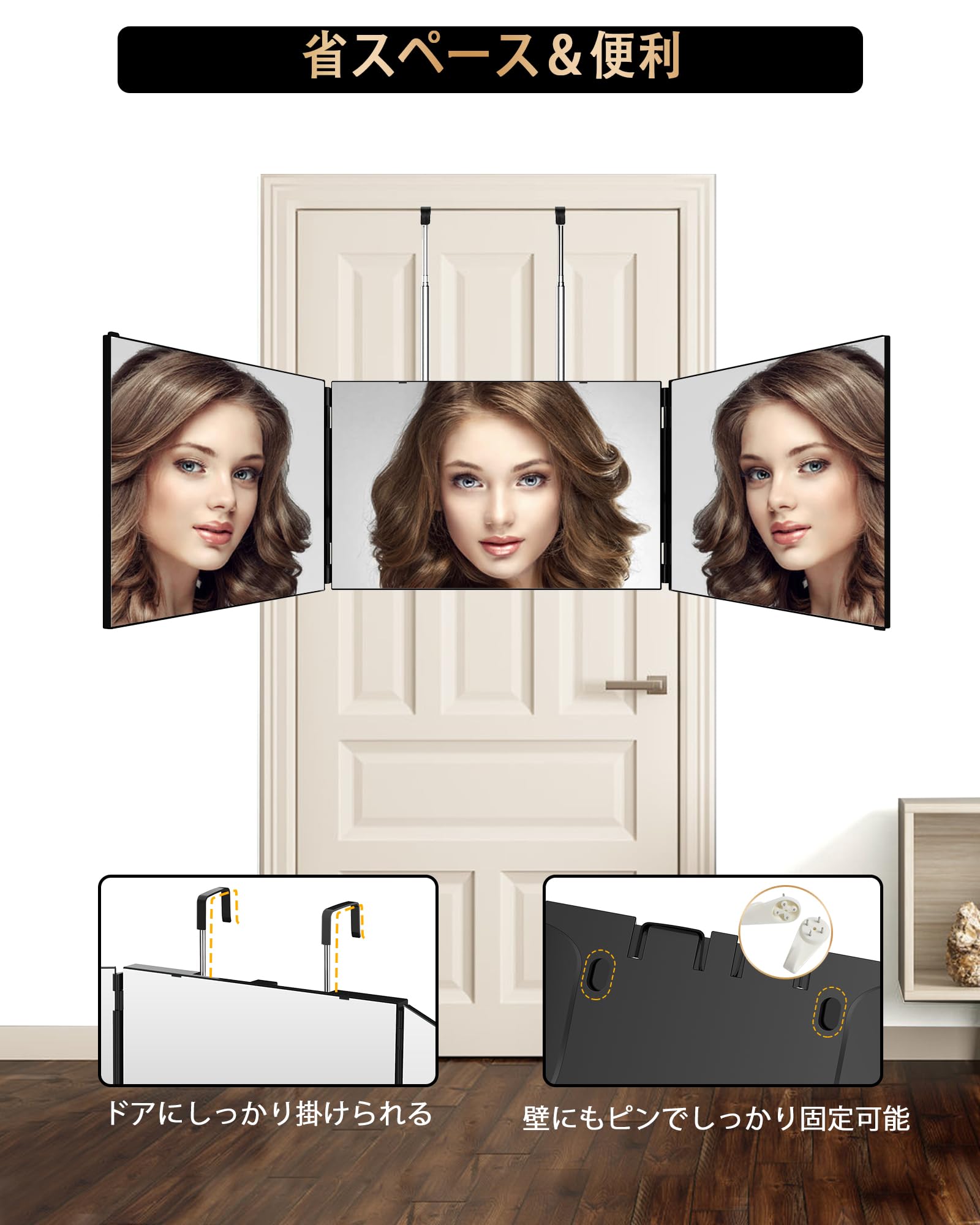 【後頭部も見える!】 三面鏡 JUSRON 卓上 セルフカット 3面鏡 女優ミラー 持ち運び 360°角度自在調整 高さ調節可能 折りたたみ可能 鏡 立体三面鏡 広い視野角 後頭部が見える 壁掛けミラー セルフカット 3ウェイミラー 安定して使い 誕生日 記念日 クリスマス プレゼント