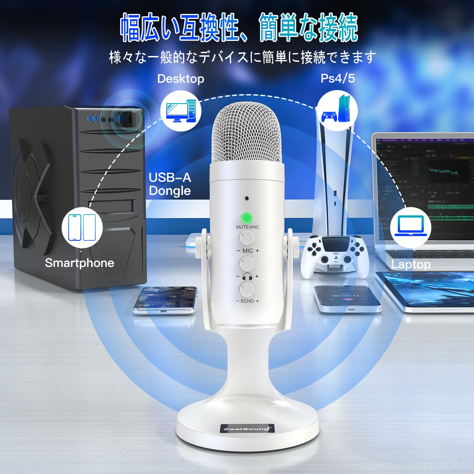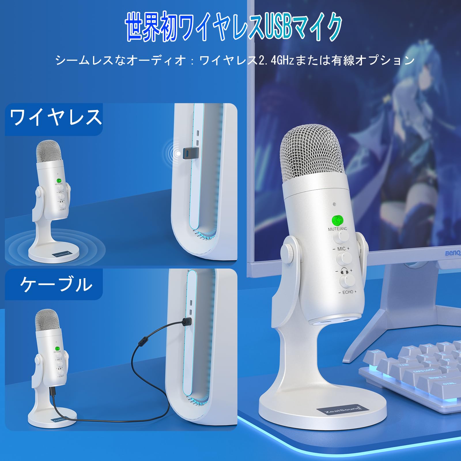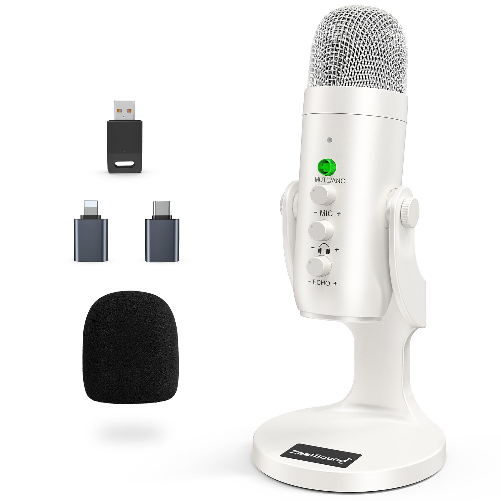 ZealSound ワイヤレスマイク、*Phone PC iPad Android Phone用USBマイク、ミュートエコーモニターボリュームゲインBluetooth 2.4GHz付きコードレスコンデンサーデスクトップマイク、ポッドキャスト、ASMR、ゲーム、YouTubeビデオ用(白)