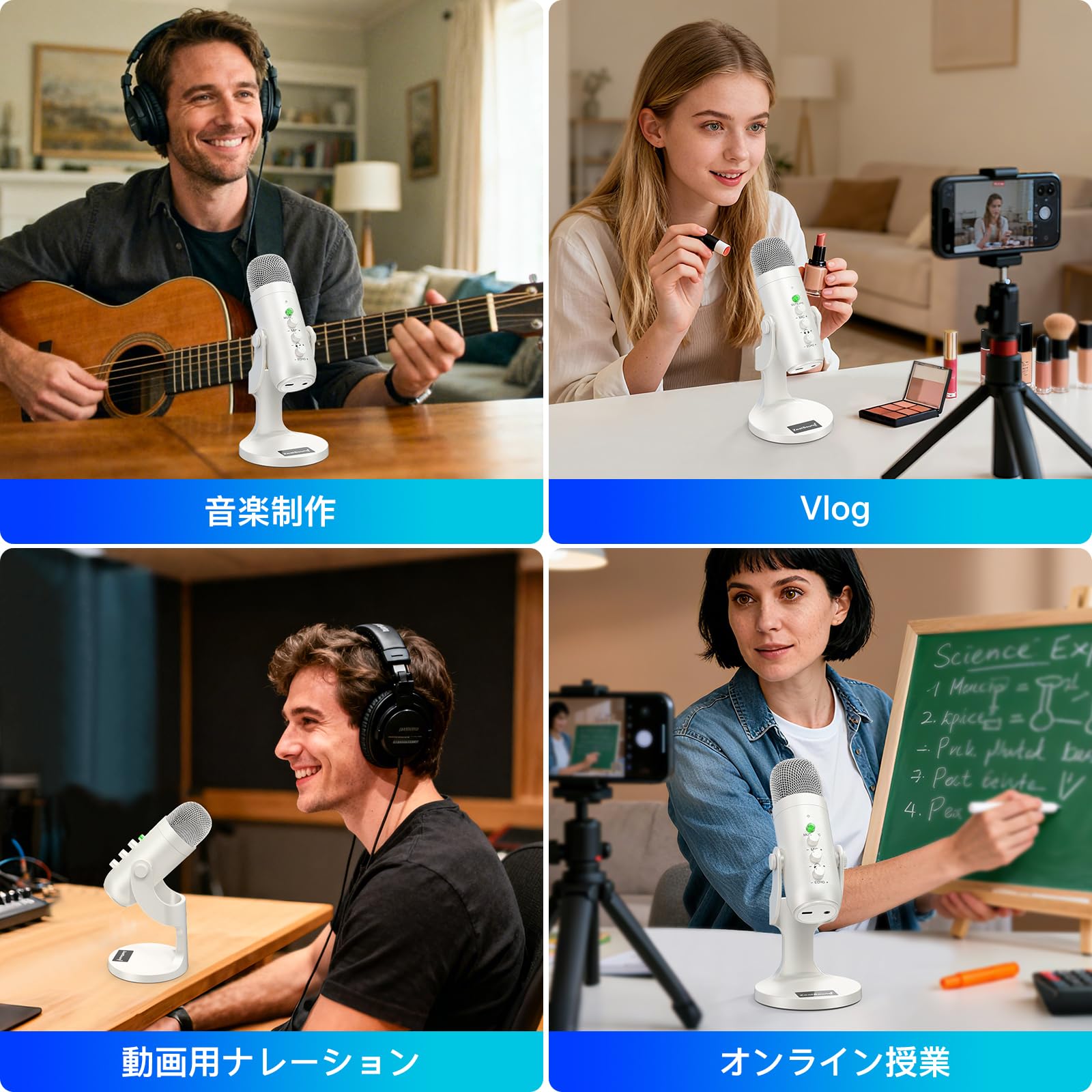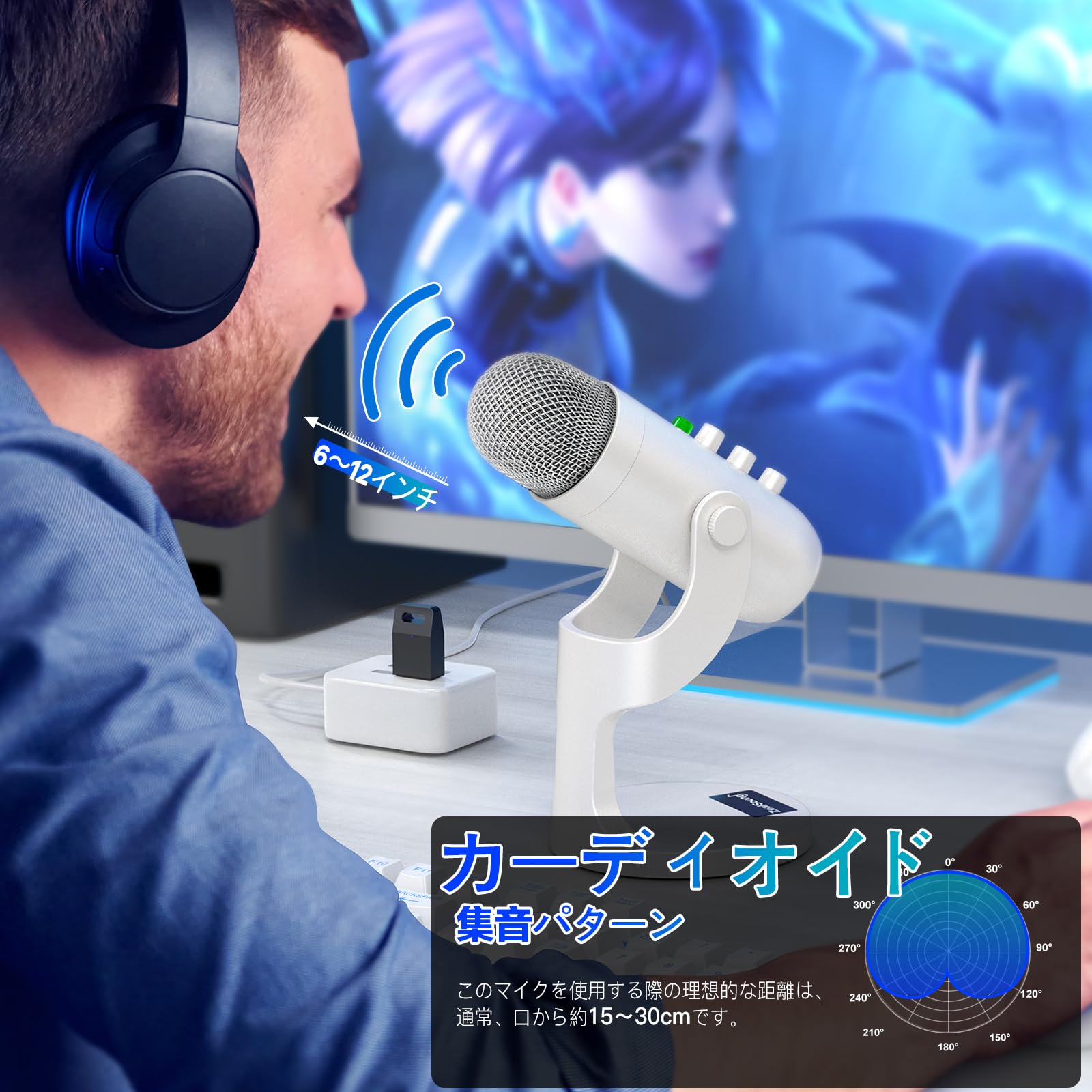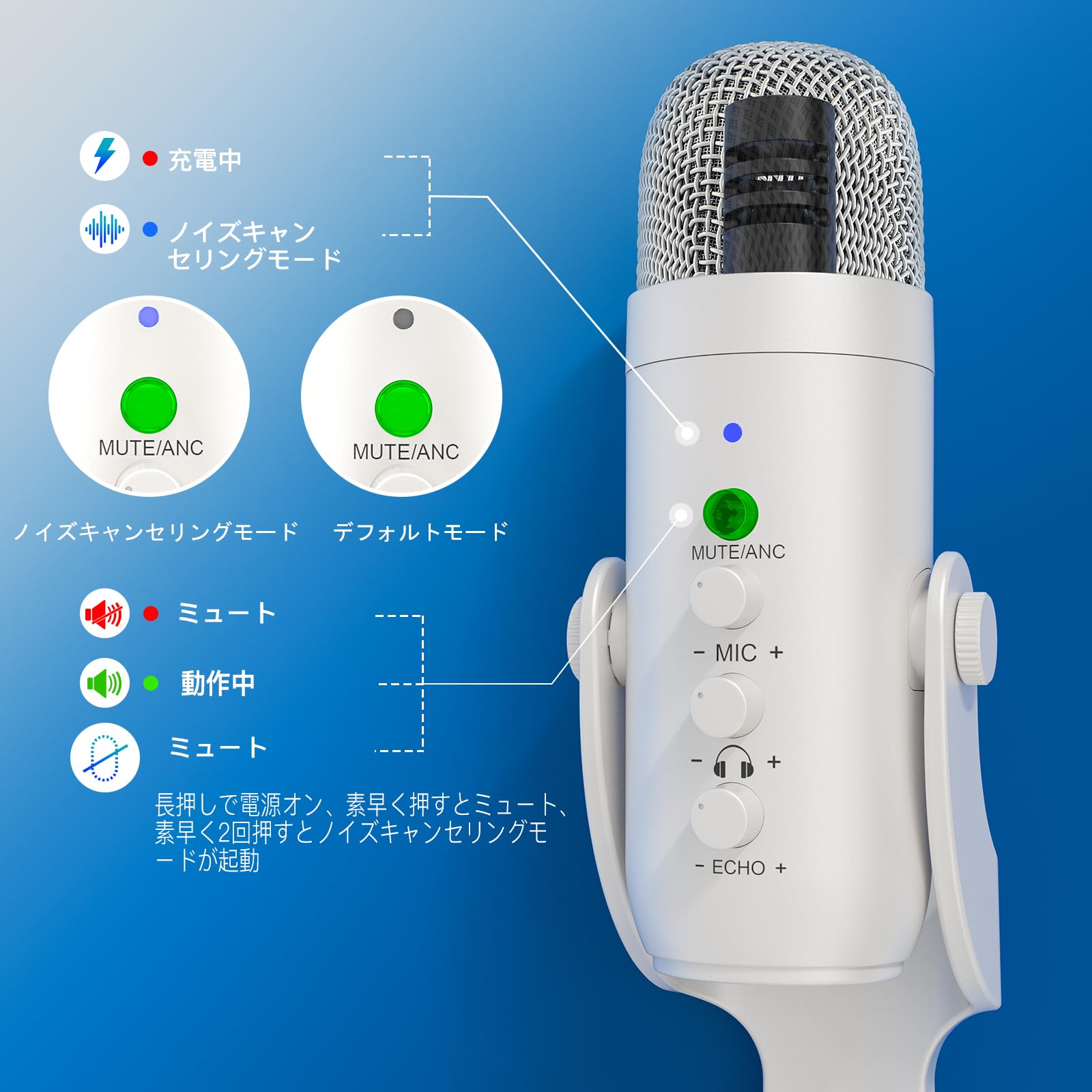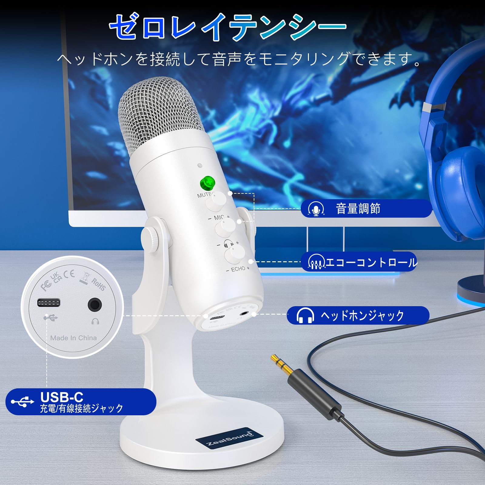 ZealSound ワイヤレスマイク、*Phone PC iPad Android Phone用USBマイク、ミュートエコーモニターボリュームゲインBluetooth 2.4GHz付きコードレスコンデンサーデスクトップマイク、ポッドキャスト、ASMR、ゲーム、YouTubeビデオ用(白)