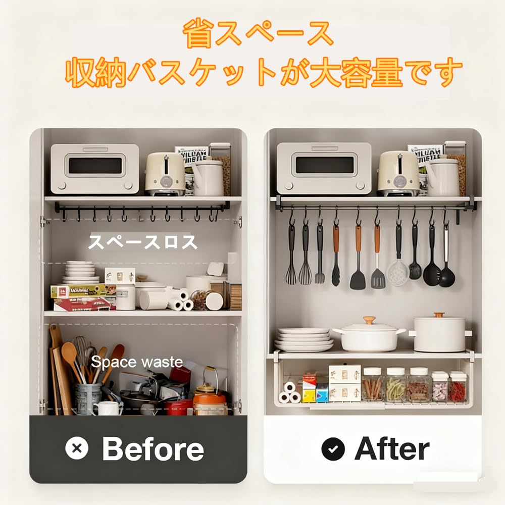 NATTY NING【吊り下げ収納バスケット 折りたたみ可能 積み重ね可能】 穴あけ不要 キッチン収納ラック 省スペース 落下防止設計 戸棚/キッチン収納用 (ブラック, 1個セット)
