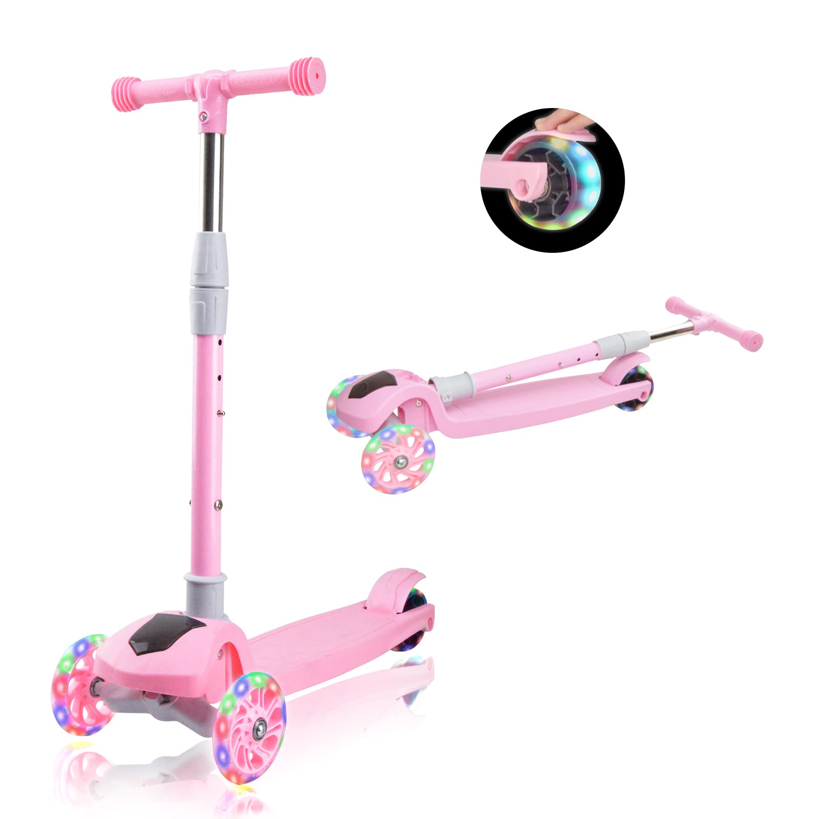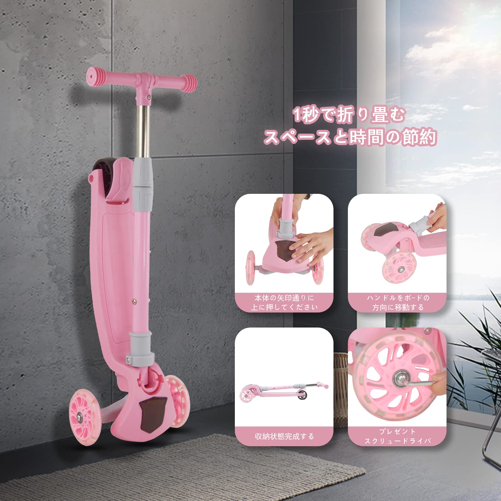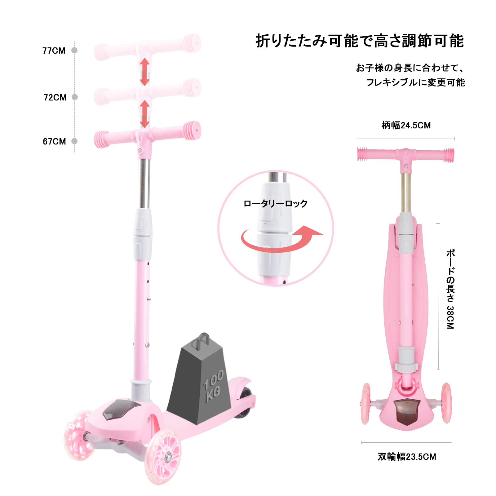 67i キックスクーター 幼児 子供用 3輪キックボード 4段階調節可能 2-10歳に向け キッズ スクーター 軽量 LED 光るホイール フットブレーキ付 ギフトに最適 (ライトピンク)