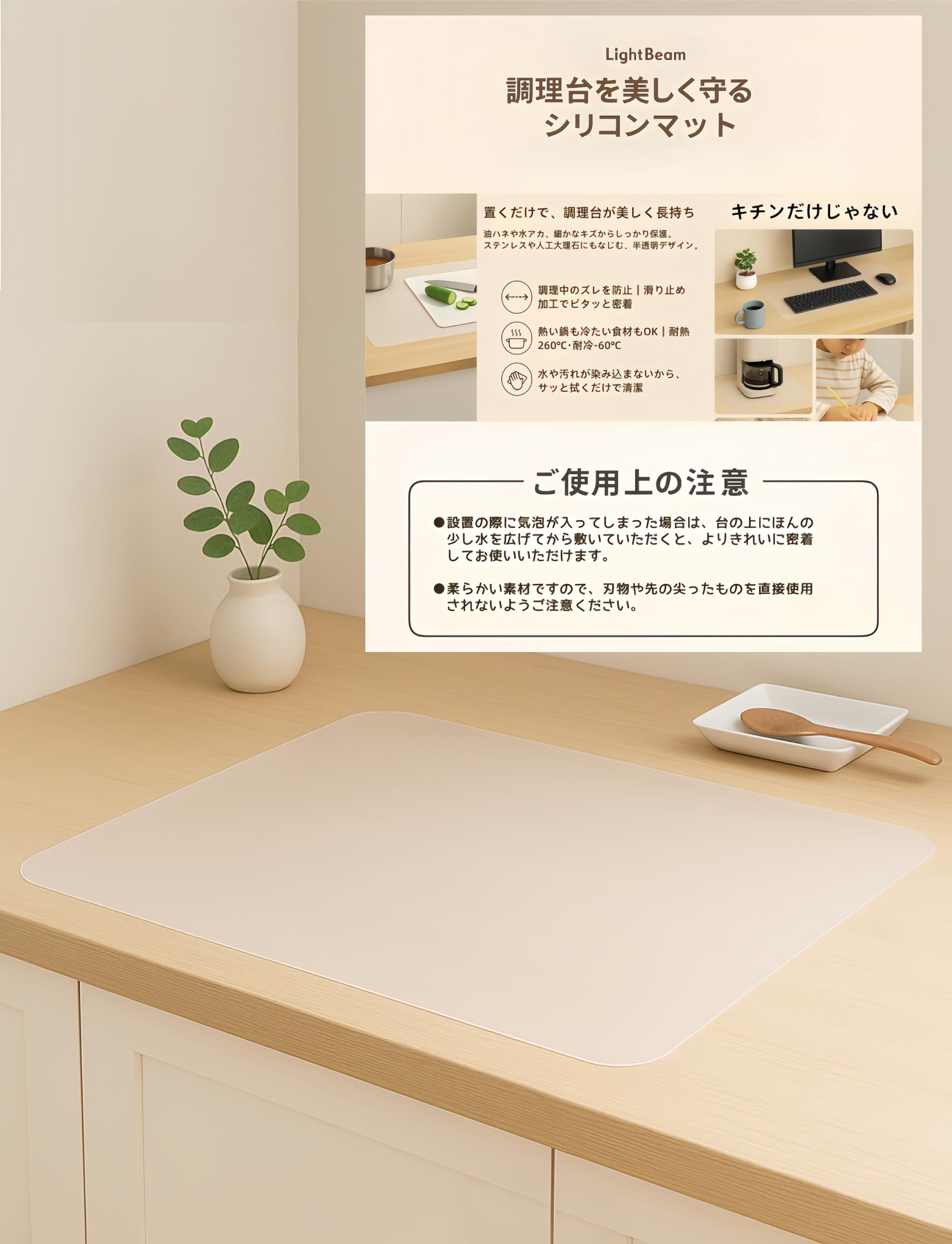 LightBeam 【特大 60×80cm 半透明】シリコンマット 大判 調理台 保護マット【耐熱260℃・滑り止め】目立たない 傷防止 拭ける 台所作業 効率アップ