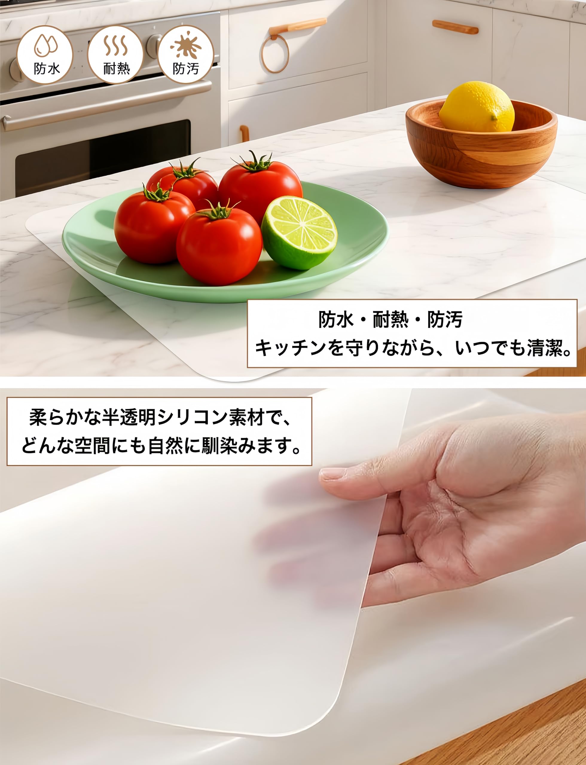 シリコンマット キッチン 耐熱マット 【耐熱230℃・耐冷-60℃・5サイズ/11色展開】 調理台 保護 カウンター シンク 作業台 大判サイズ 厚手 人工大理石 拭ける キズ 汚れ シミ 防止 滑り止め 吸音 静音 作業台 台所 保護シート 半透明 カットOK Silicone Mat (乳白色(半透明), 50×60cm)