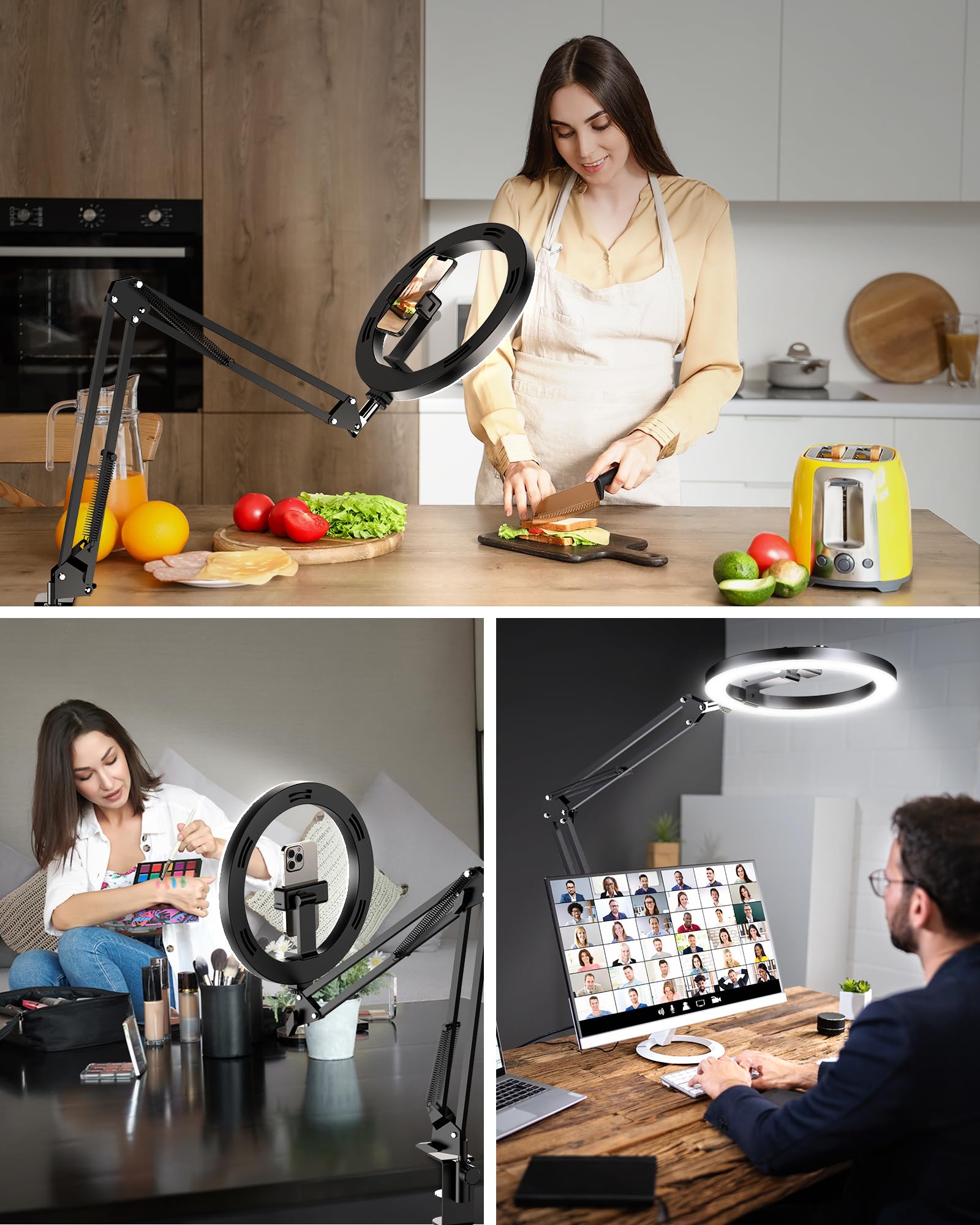 【ライト・撮影・俯瞰・動画照明用】リングライト 10インチ アーム式 スマホ撮影スタンド - Evershop 自撮り・動画撮影用照明ライト、360°調整可能、3色モード・30段階調光、PC・パソコン・オンライン会議・配信用ライト、メイク用・俯瞰撮影・手元撮影、カメラ・スマホ・LEDビデオライト、web会議用、化粧用スタンド付き