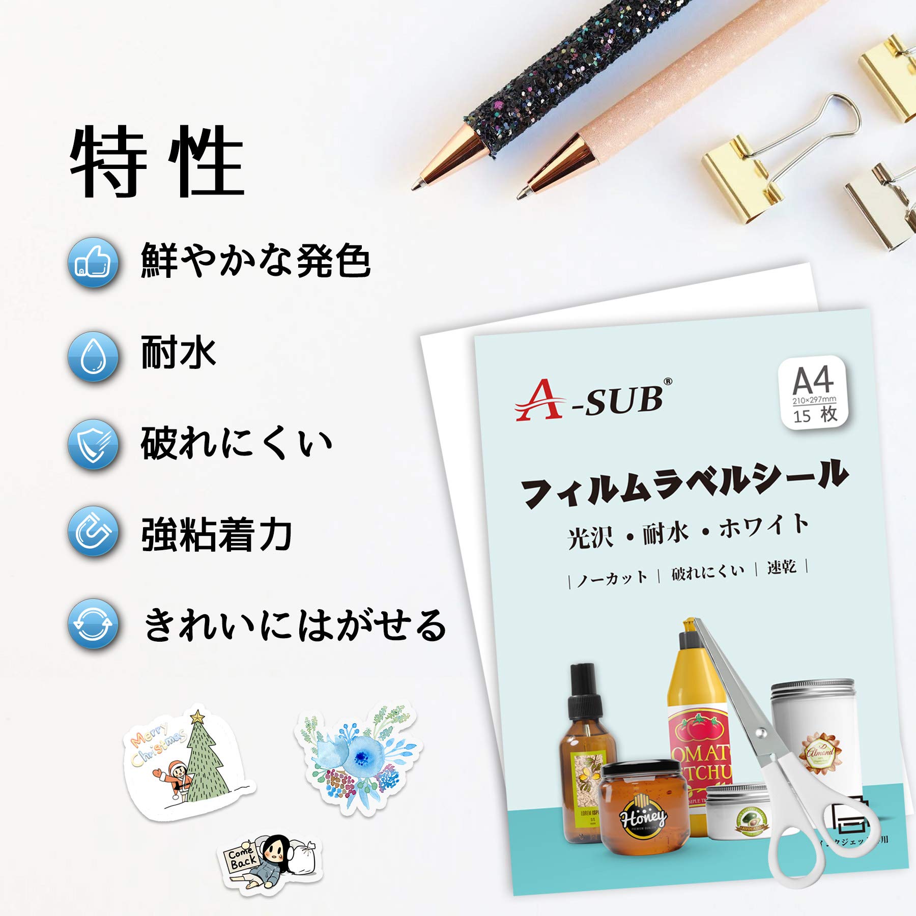 A-SUB ラベルシール 耐水 光沢 インクジェットフィルムラベル 防水15枚 A4ノーカット 貼ってはがせる 手作りステッカー ホワイト
