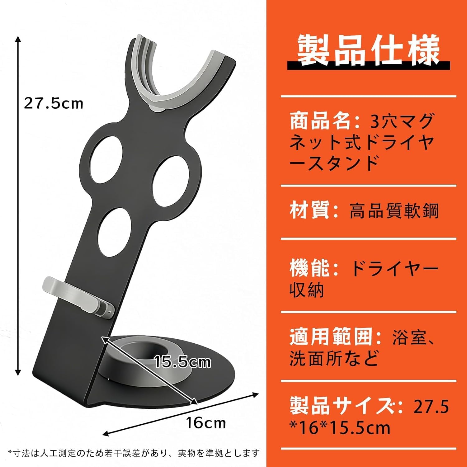 ウォールドライヤーホルダー ホルダー ドライヤースタンド 石こうボード壁対応 ドライヤー収納 ドライヤー収納 洗面所 脱衣所 寝室 シンプル 整う収納 24.3 x 10 x 6 cm ブラック