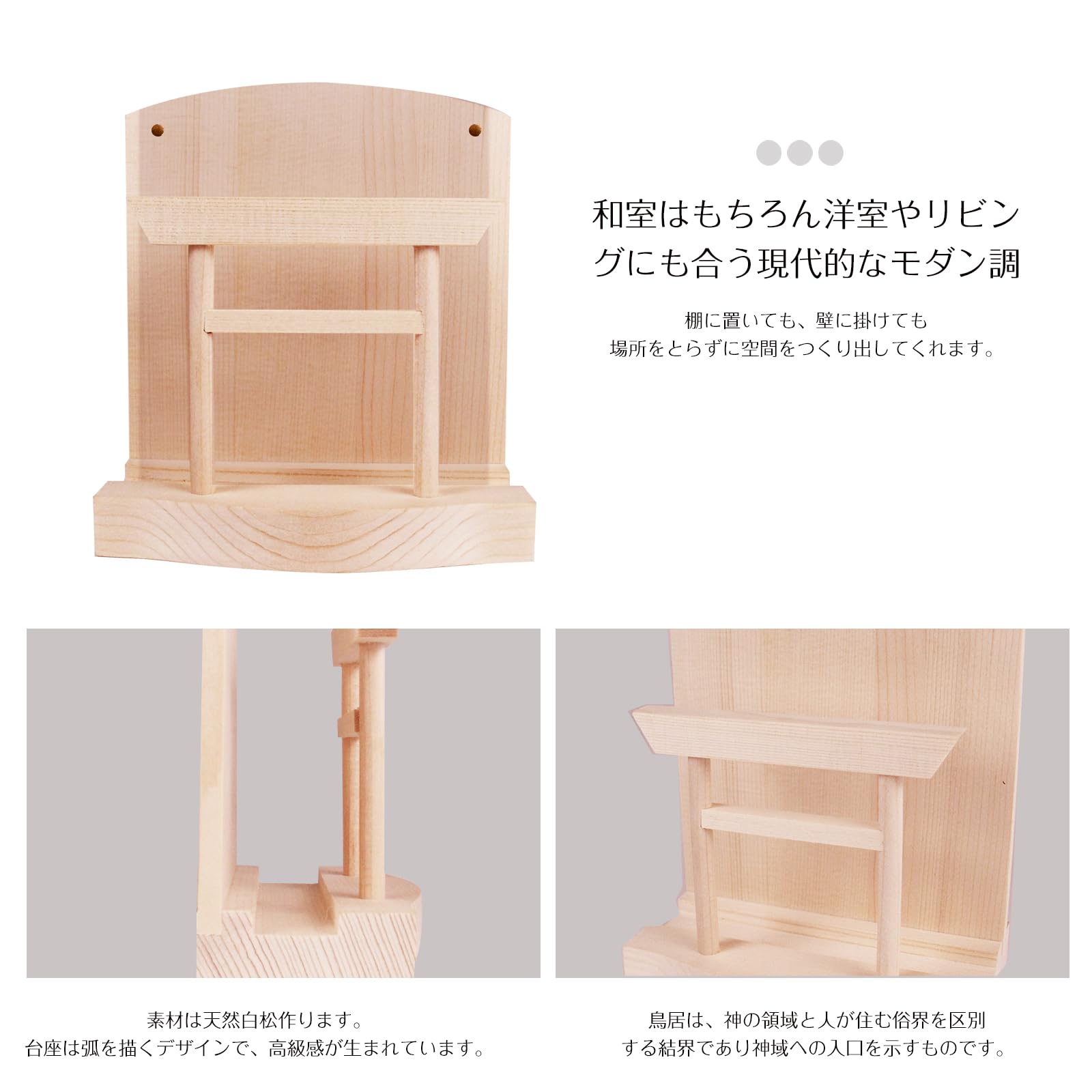 神聖な祈りを捧げる神棚【鳥居+雲板付きお札立て】白松製 壁掛け・置き兼用 穴開け不要