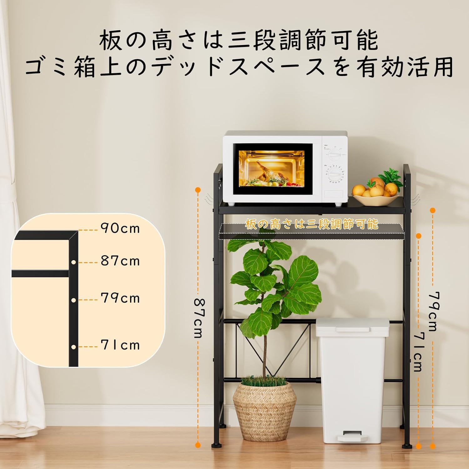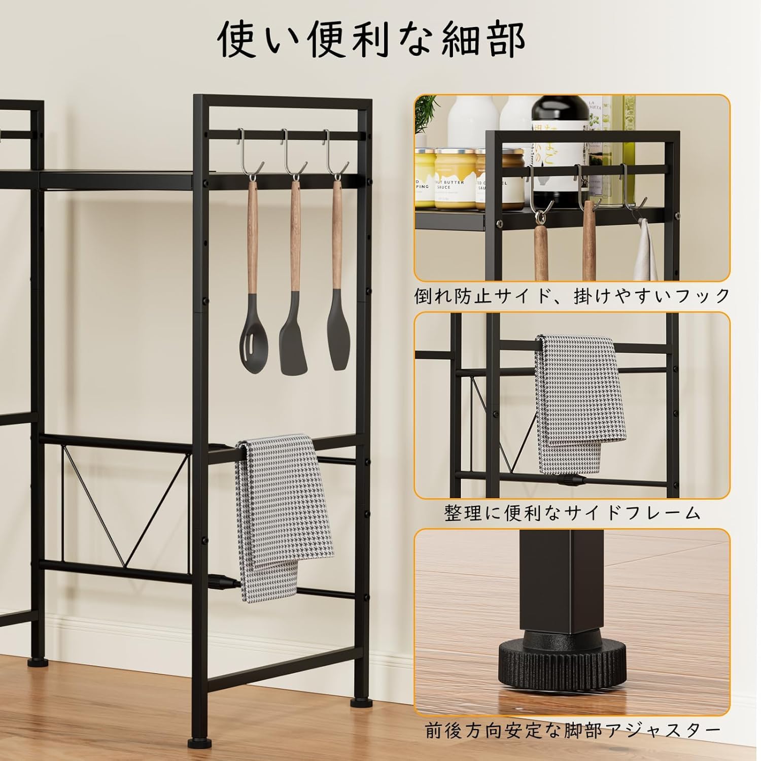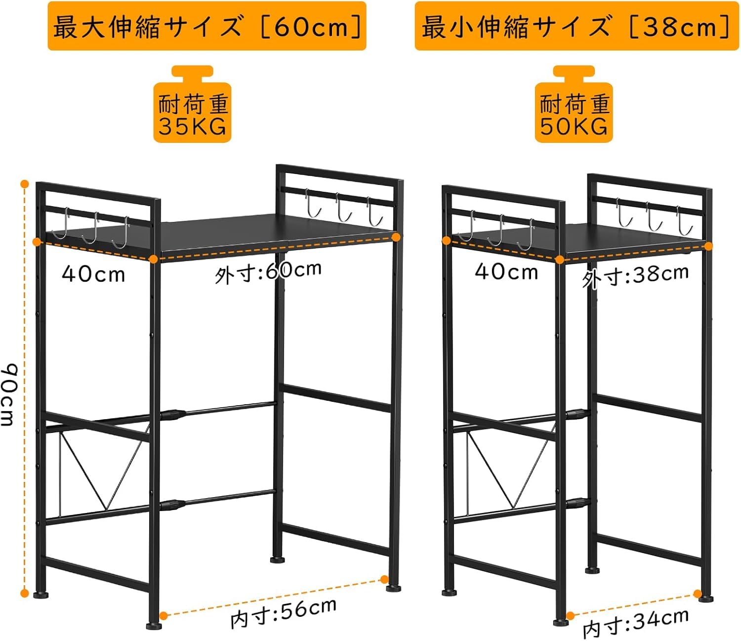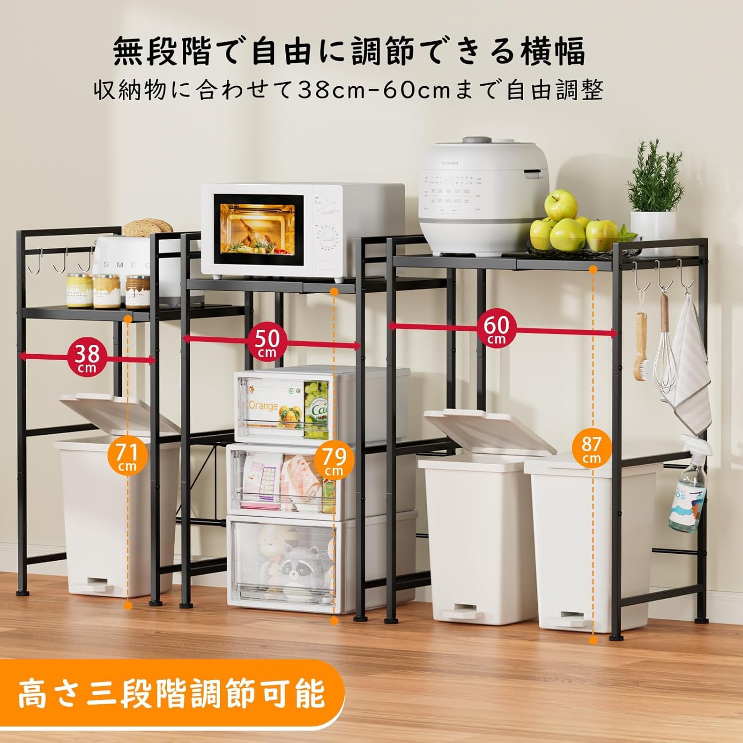 キッチンラック レンジラック 幅38-60cm ゴミ箱上ラック スチール製 伸縮式 冷蔵庫上収納 キッチン多機能収納棚 炊飯器置き場 塵箱上 kitchen rack 組み立て式 (黒)