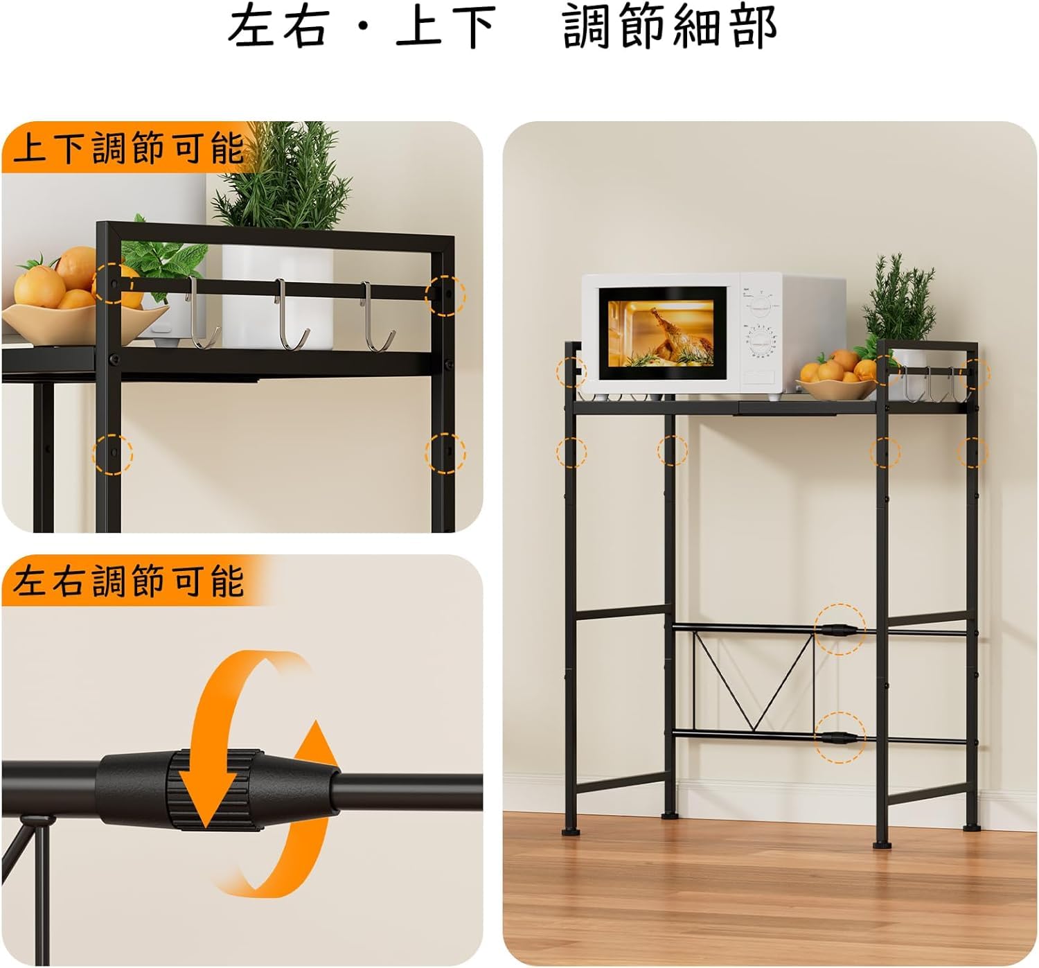 レンジ上ラック キッチンレンジ 伸縮式 幅(40-60cm)トースター 棚板高さ調節可 電子レンジ 台 収納 耐荷重50kg フック6つ付き お洒落 収納ラック (白)