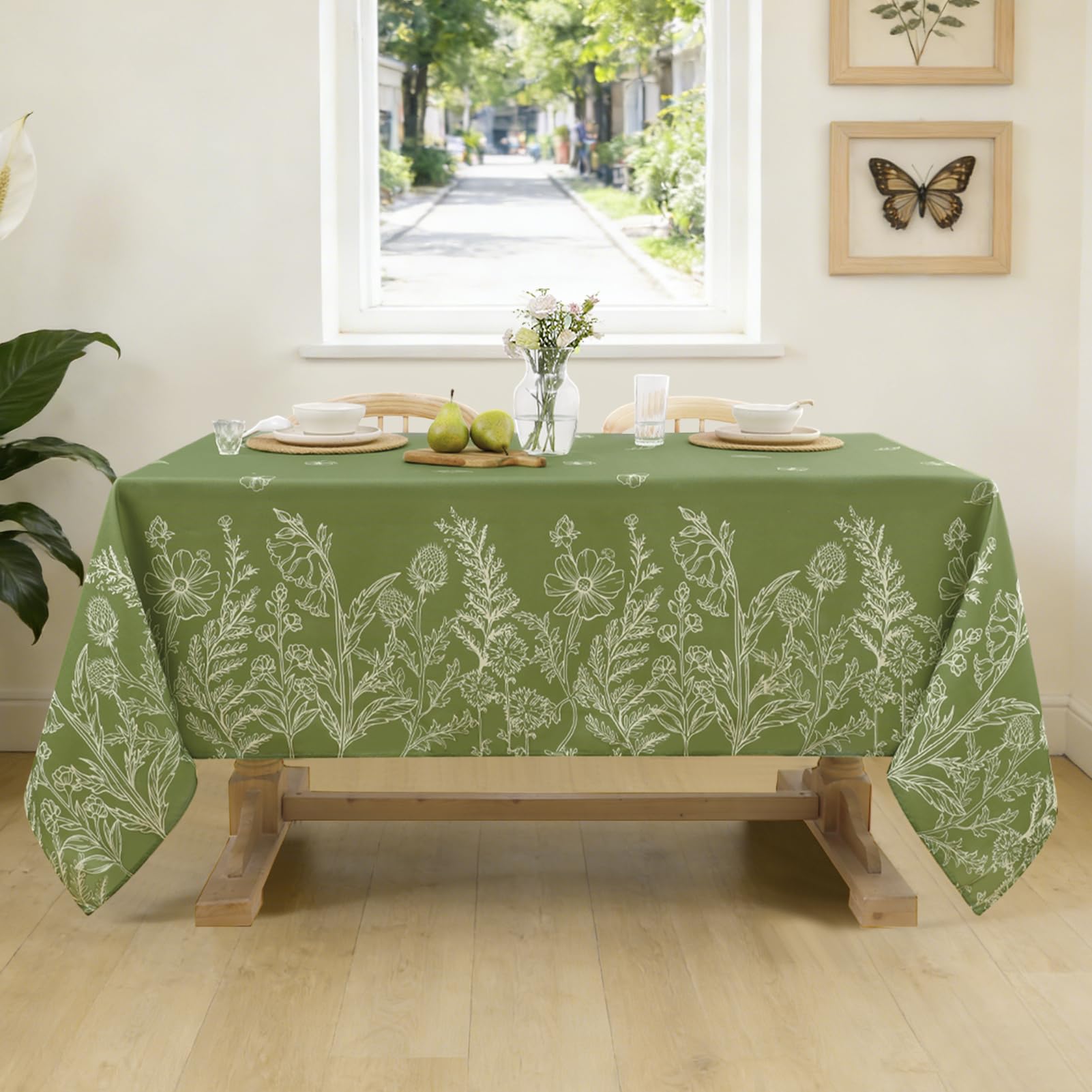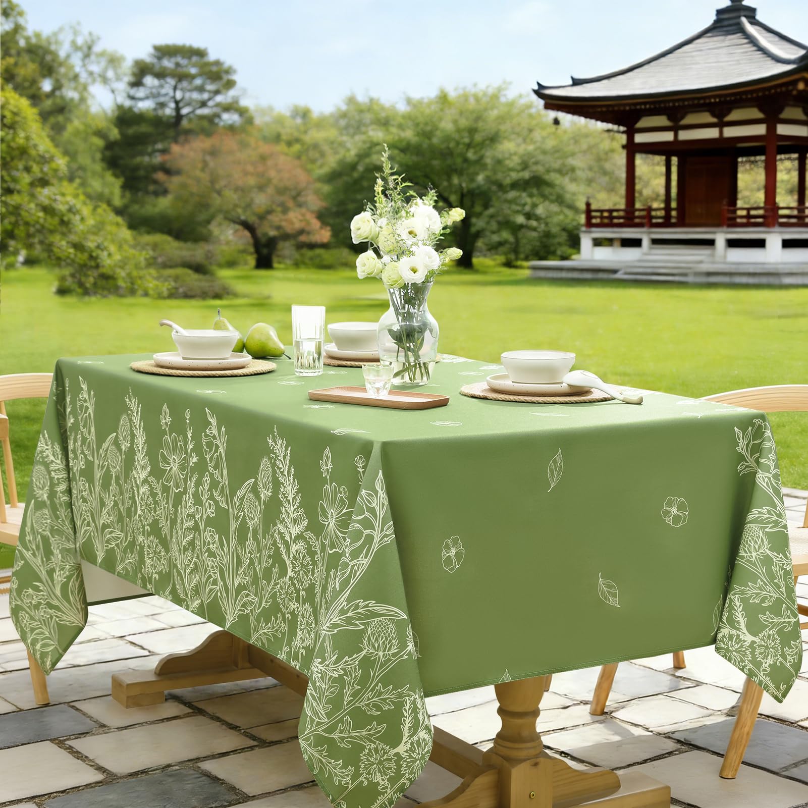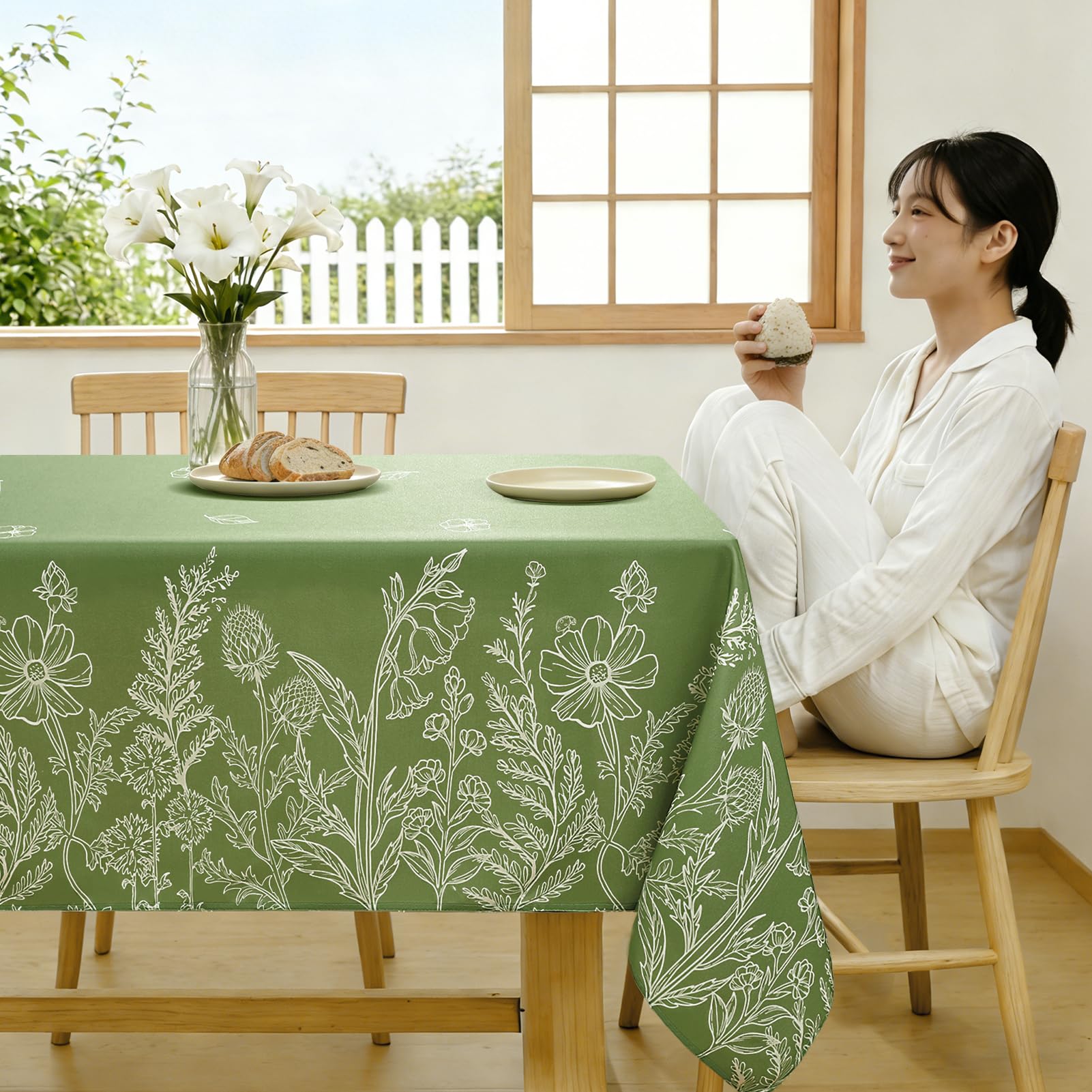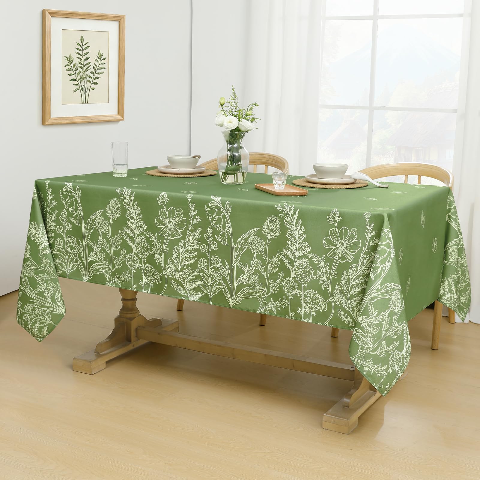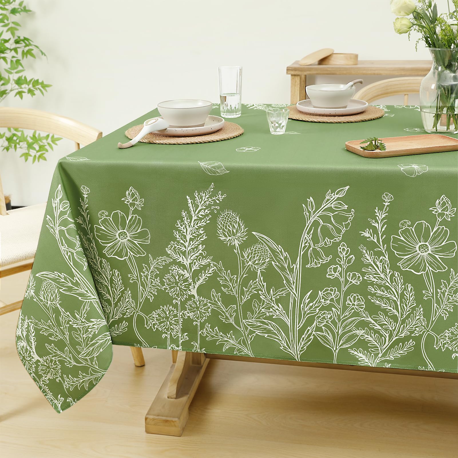 Softalker テーブルクロス おしゃれ 花柄 リネン 布製 お手入れ簡単 長方形 135x180cm 桌布 白描草木花柄 和風 テーブルくろす 緑 可愛い グリーン spring table cloth 春夏 小学生 ピクニック デザイン ダイニング キッチン キャンプ レストラン用 パーティー バレンタインデー 長机用 祭り 屋外 室内場合