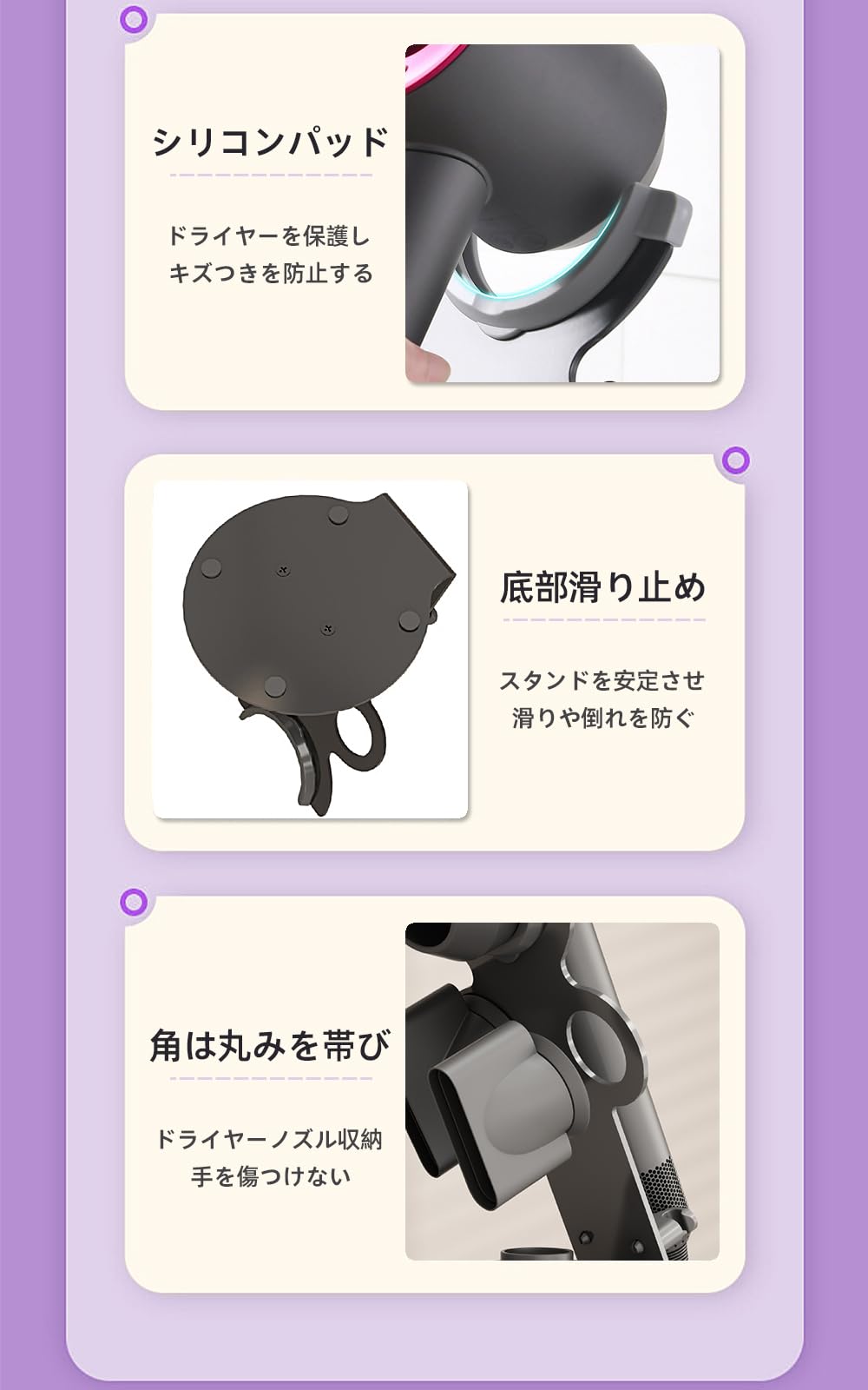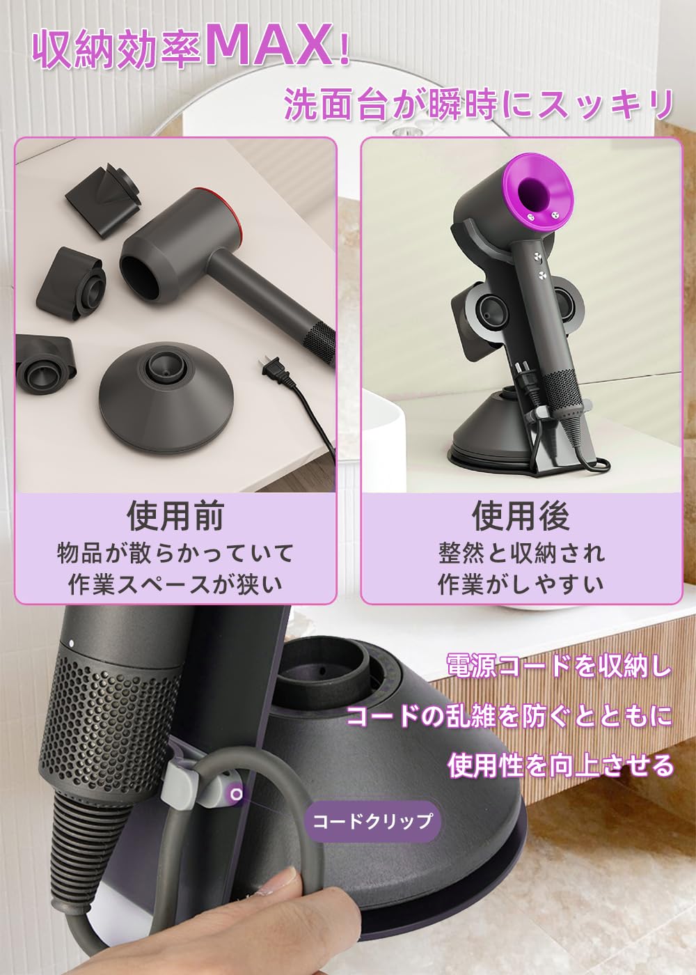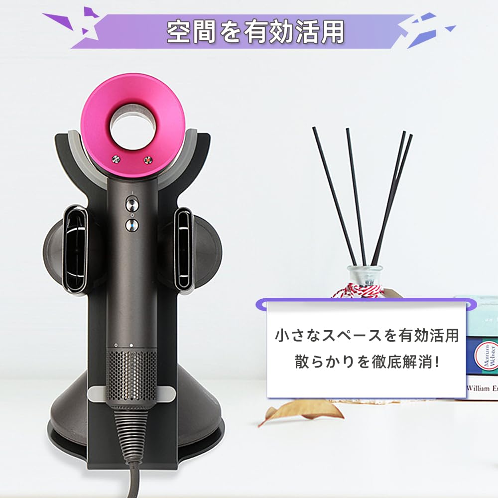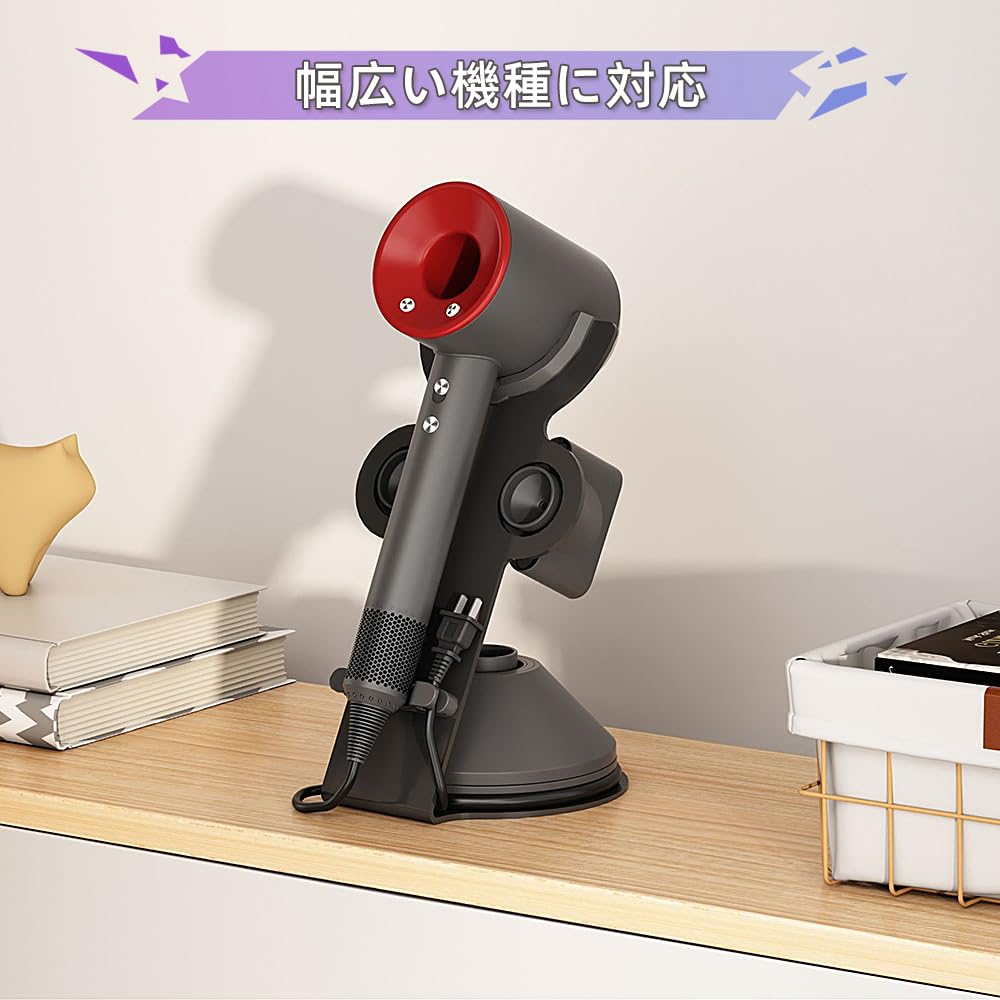 Renjzle ドライヤーホルダー スタンド 収納スタンド 電源プラグ・コード整理機能付き 小物置き アタッチメント収納可能 滑り止め設計 省スペース 浴室・洗面所・寝室用 多機種対応