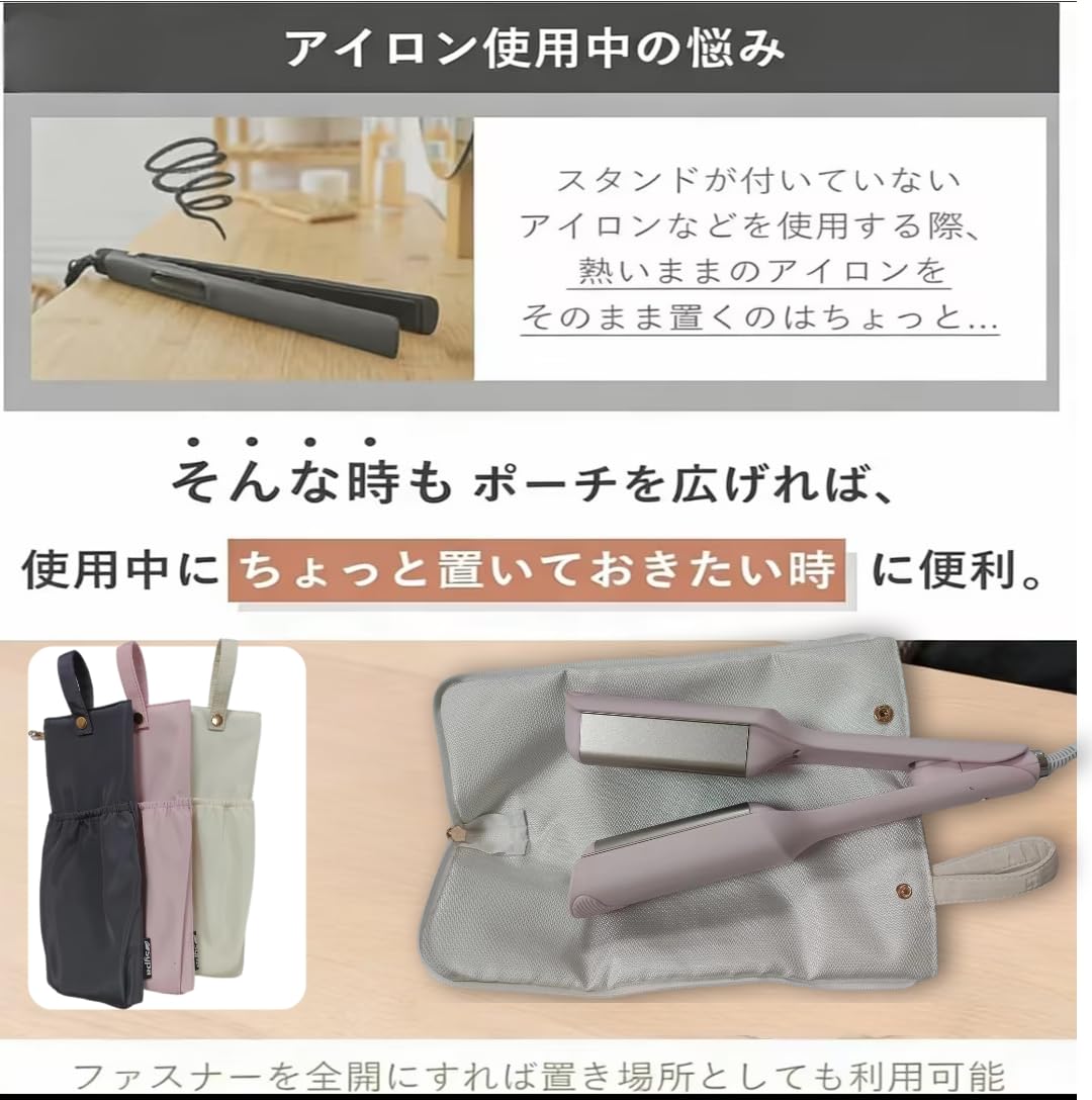 ヘアアイロン ケース 耐熱 吊り下げ収納 アイロンケース 耐熱 300℃熱いまま収納 180°全開可能 PUレザー 防水 ヘアアイロン 収納 ポケット付き 旅行 自宅用 (Charcoal gray)