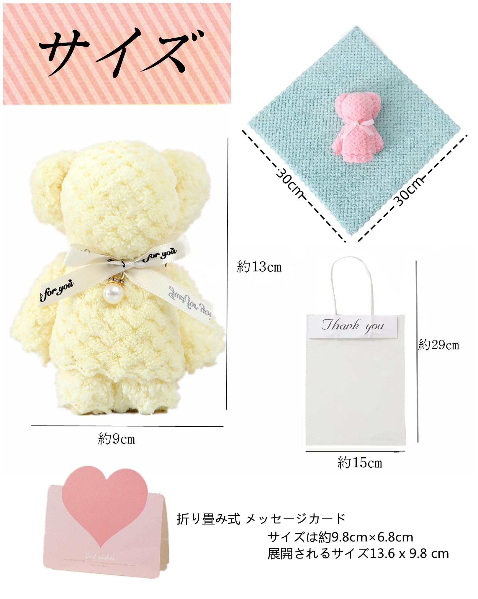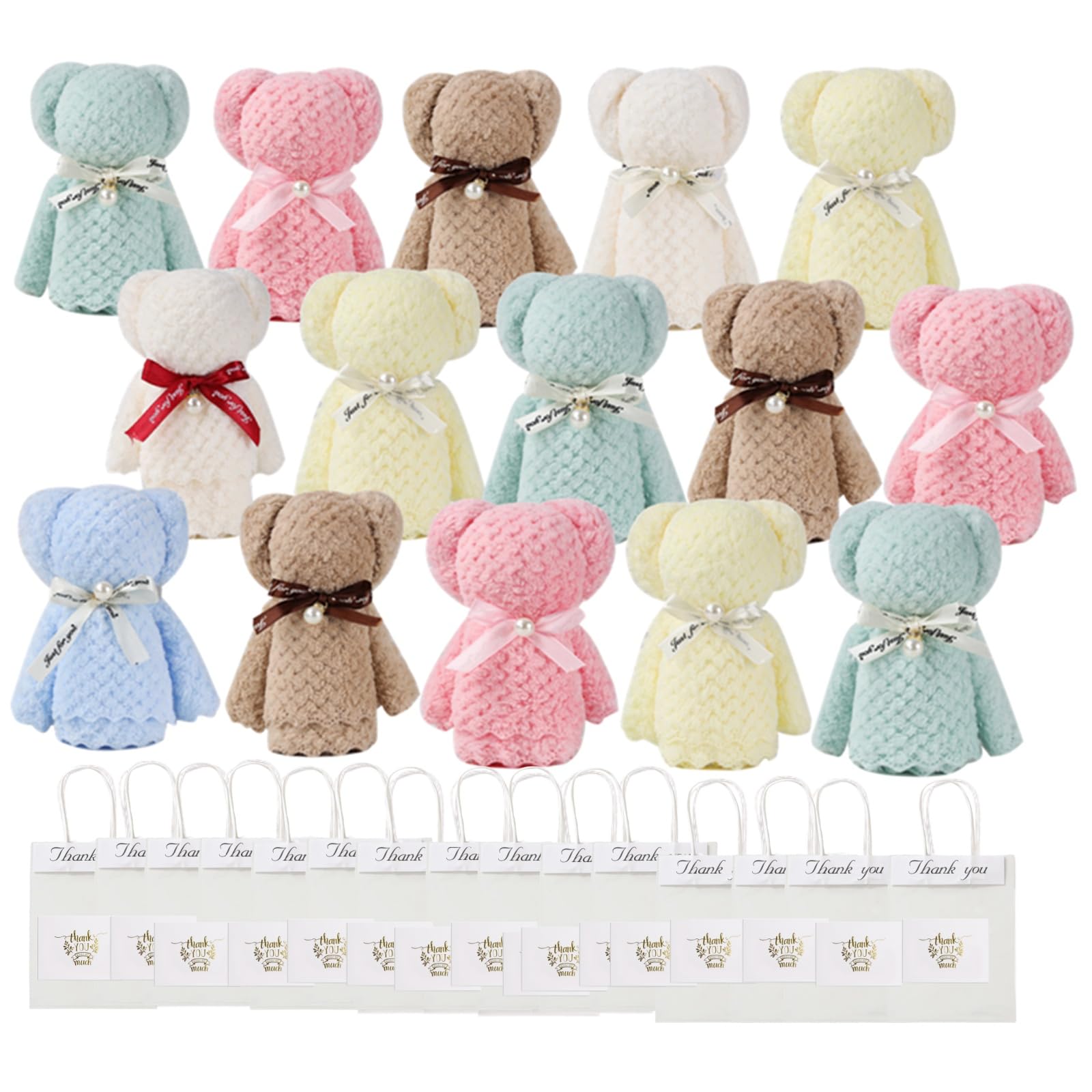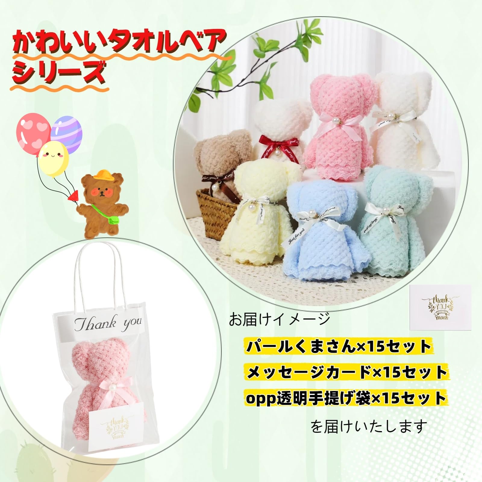 Alutaio タオル15個セット ハンカチ プチギフト ハンドタオル プレゼントプチギフト 個包装 かわいい パールくまさん ベアー ギフト 景品 退職 退院 引っ越しの挨拶 結婚式 お返し粗品 メッセージカード ラッピングバック付き (パールくまさん+メッセージカード+opp透明手提げ袋 15セット)