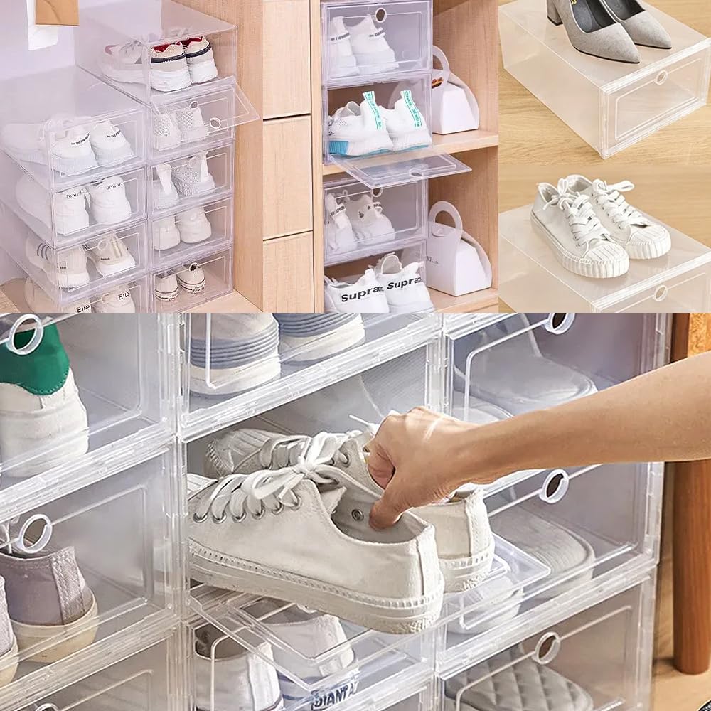 GUDEMAY 透明 シューズボックス シューズ収納 折りたたみ式シューズオーガナイザー スニーカー ストレージビン 積み重ね可能なストレージトート コンテナ 靴ケース 靴 箱 棚 収納ボックス (ホワイト, 6層)