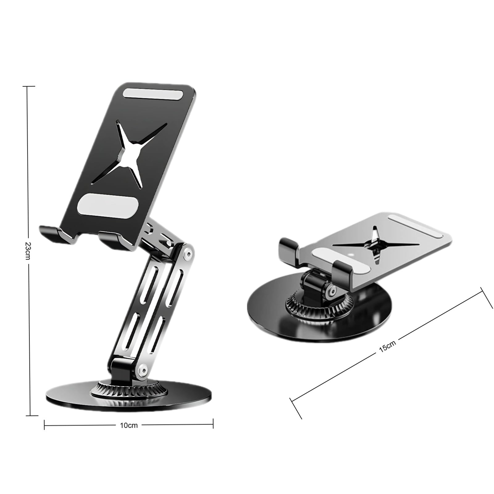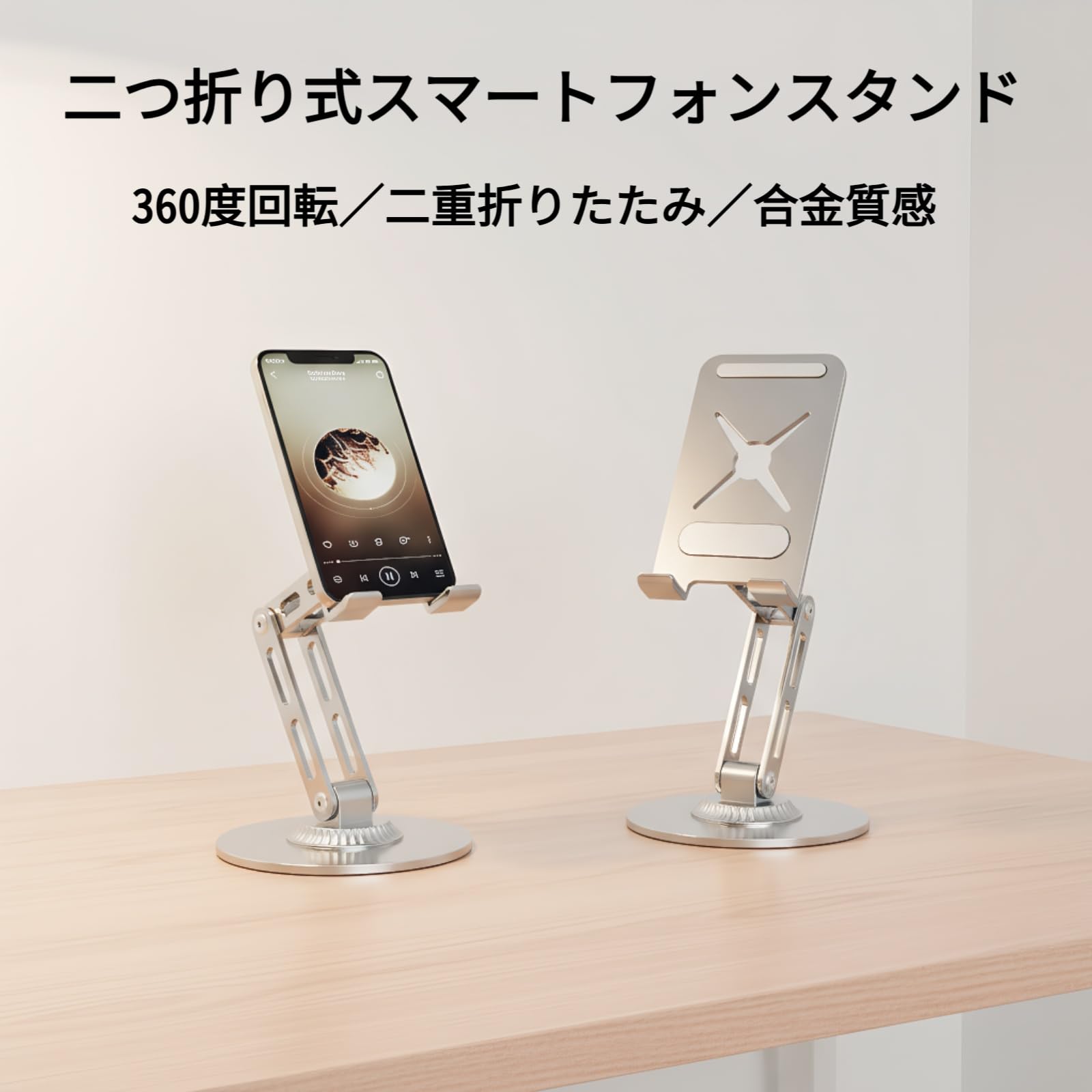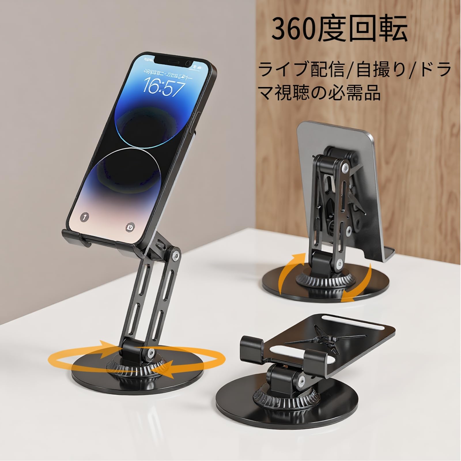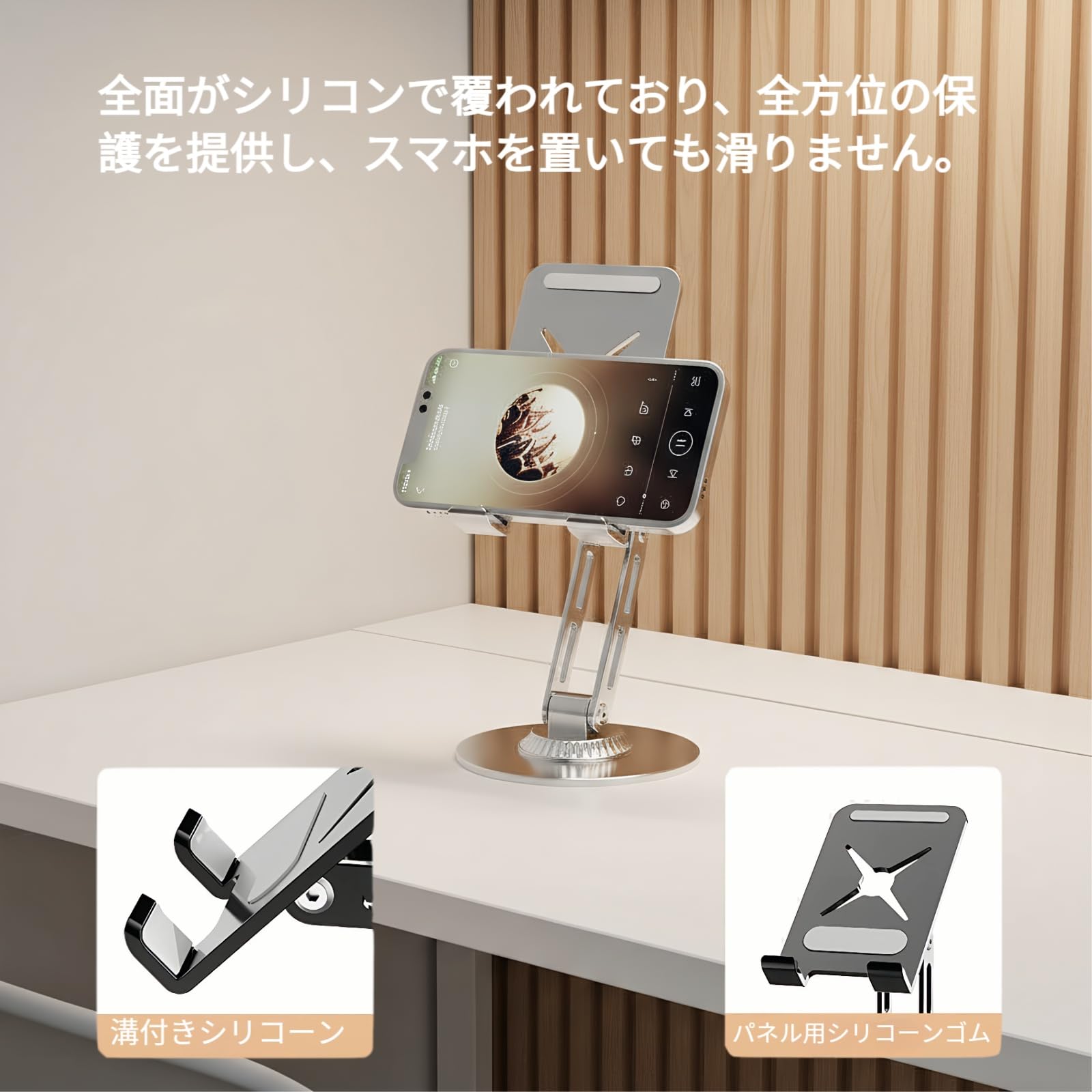 YEFONREALM スマホスタンド 卓上 360度回転 高さ調整 折り畳み可能 スマートフォンホルダー デスクスタンド iPhone 17/16/15/14/13/12/11/SE/Pro Max/Plus Huawei Android 対応 オフィス 自宅 映画視聴 ライブ配信 自撮り 旅行用 コンパクト 収納 簡単設置 防滑硅胶 碳素鋼素材(展開尺寸10×10×23cm) (シルバー)