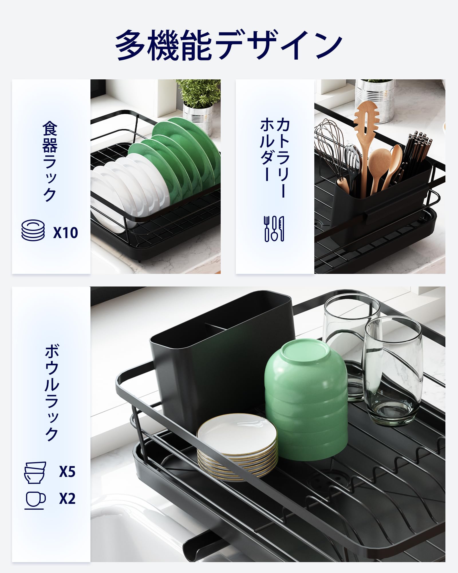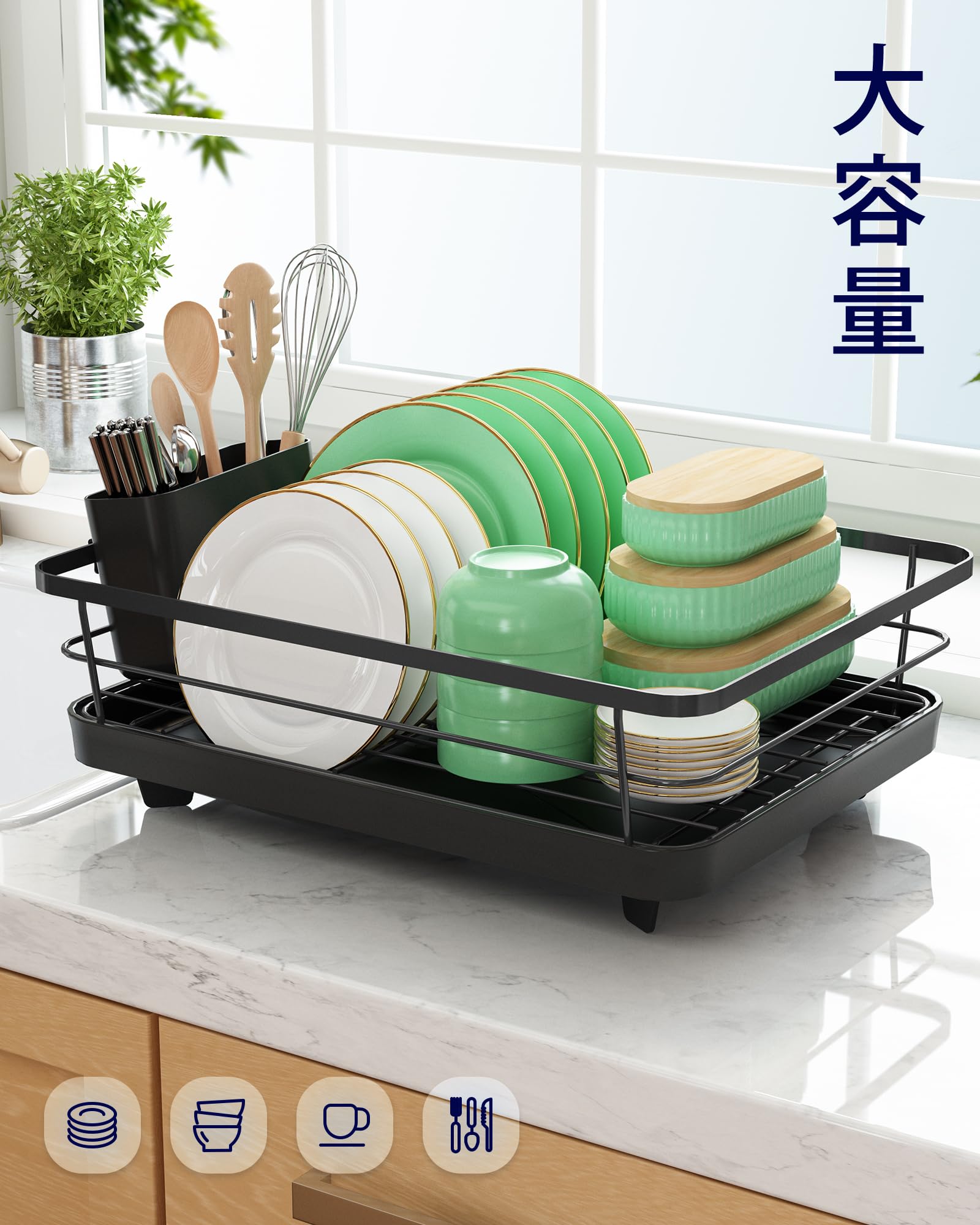 水切りラック 水切りかご 錆びない金属 大容量 ディッシュラック キッチン収納 皿立て ブラック