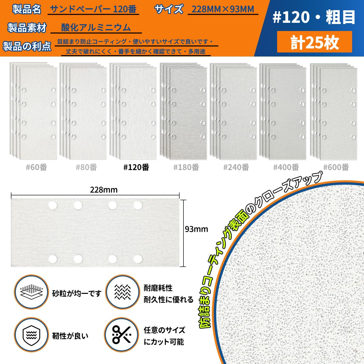 MORLARCO オービルサンダー ペーパー 120番 25枚セット サンディングペーパー 93X228mm サンダー ペーパー クランプ式 電動サンダー用サンドペーパー 吸塵8穴付 塗装仕上げのサンディング 金属磨き 木工DIY作業に 詰まり防止紙やすり