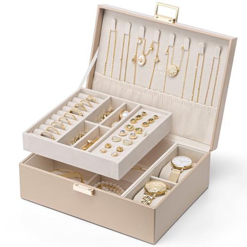 Vlando アクセサリーケース 2層 大容量 ジュエリーボックス 取り外し可能なジュエリートレー ネックレス ピアス 指輪 ブレスレット 女性 プレゼント 誕生日 ギフト (茶色-L)