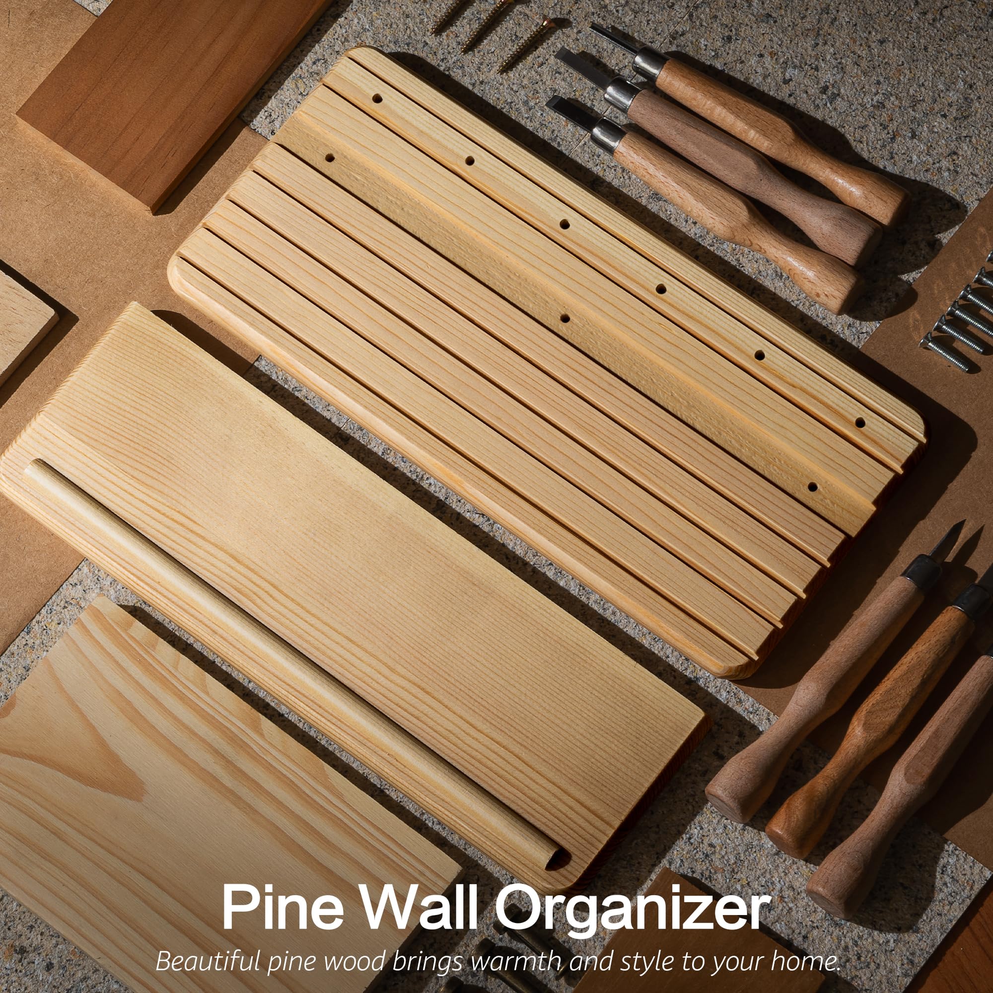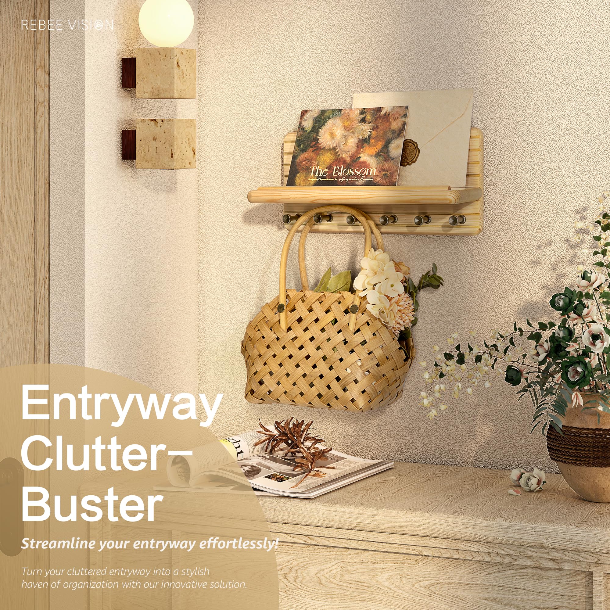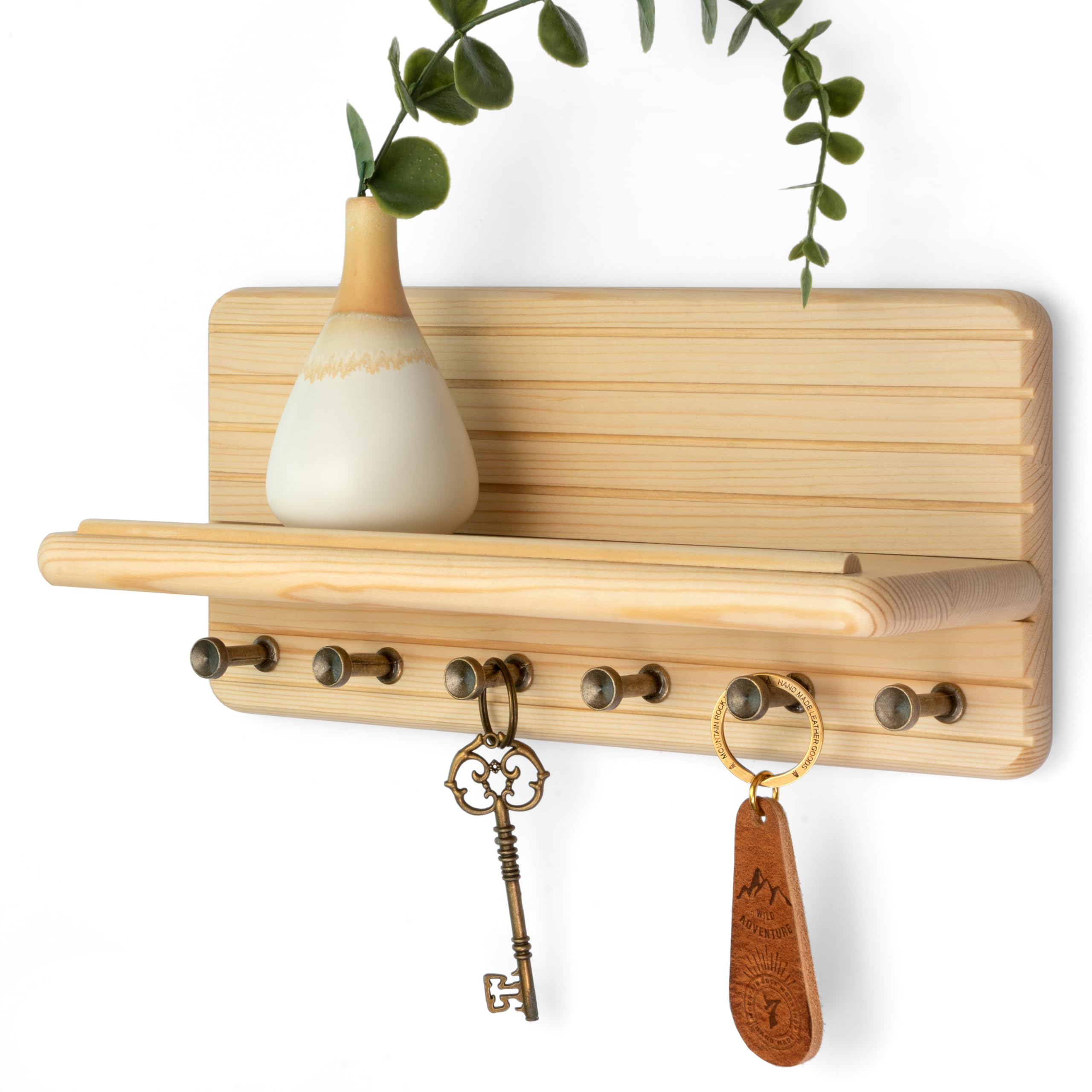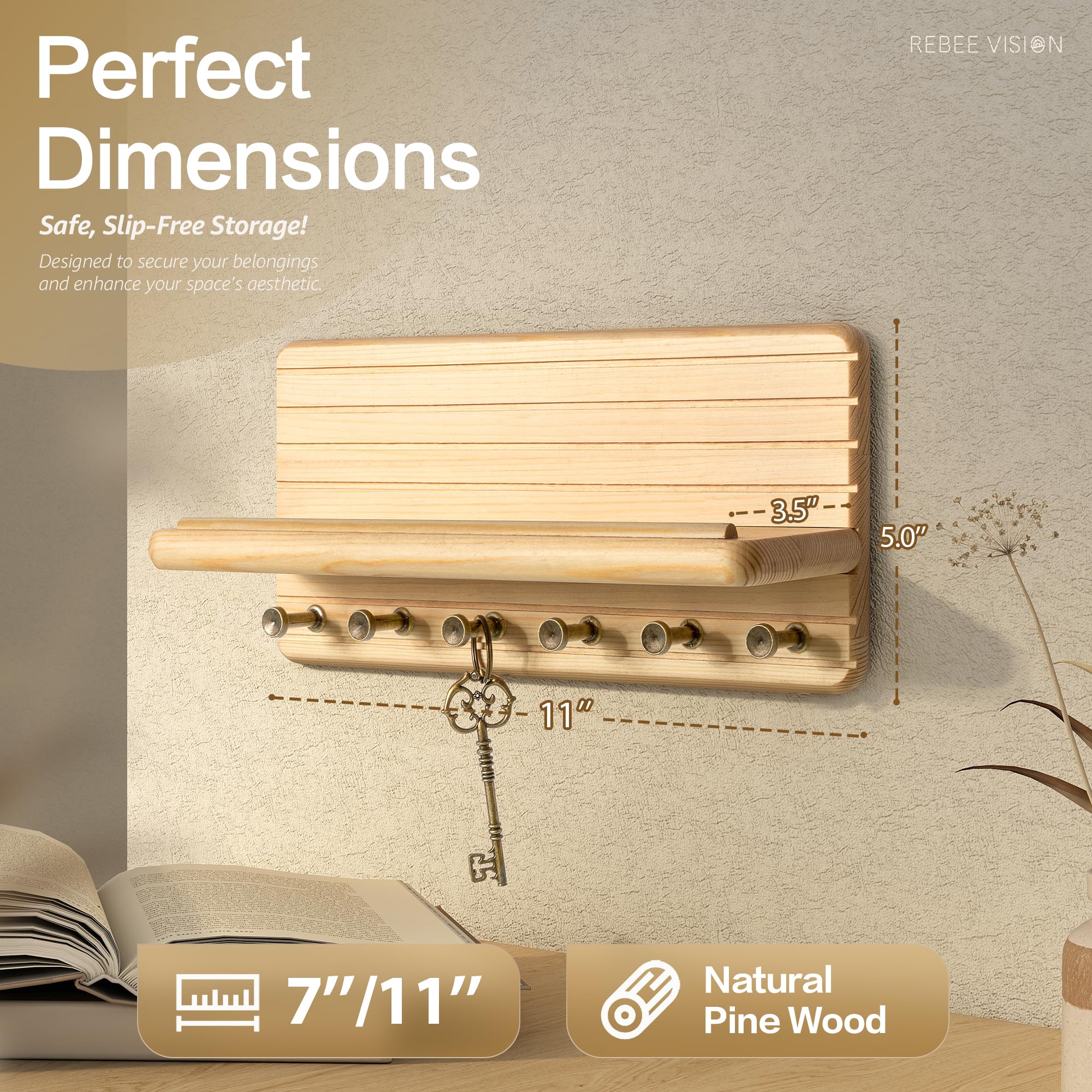 Rebee Vision装飾キーホルダー壁マウント – ファームハウス 11インチ パイン木製キーホルダー 壁用 フック6個&フローティングシェルフ付き - シックで機能的なホームデコレーションソリューション (天然木)
