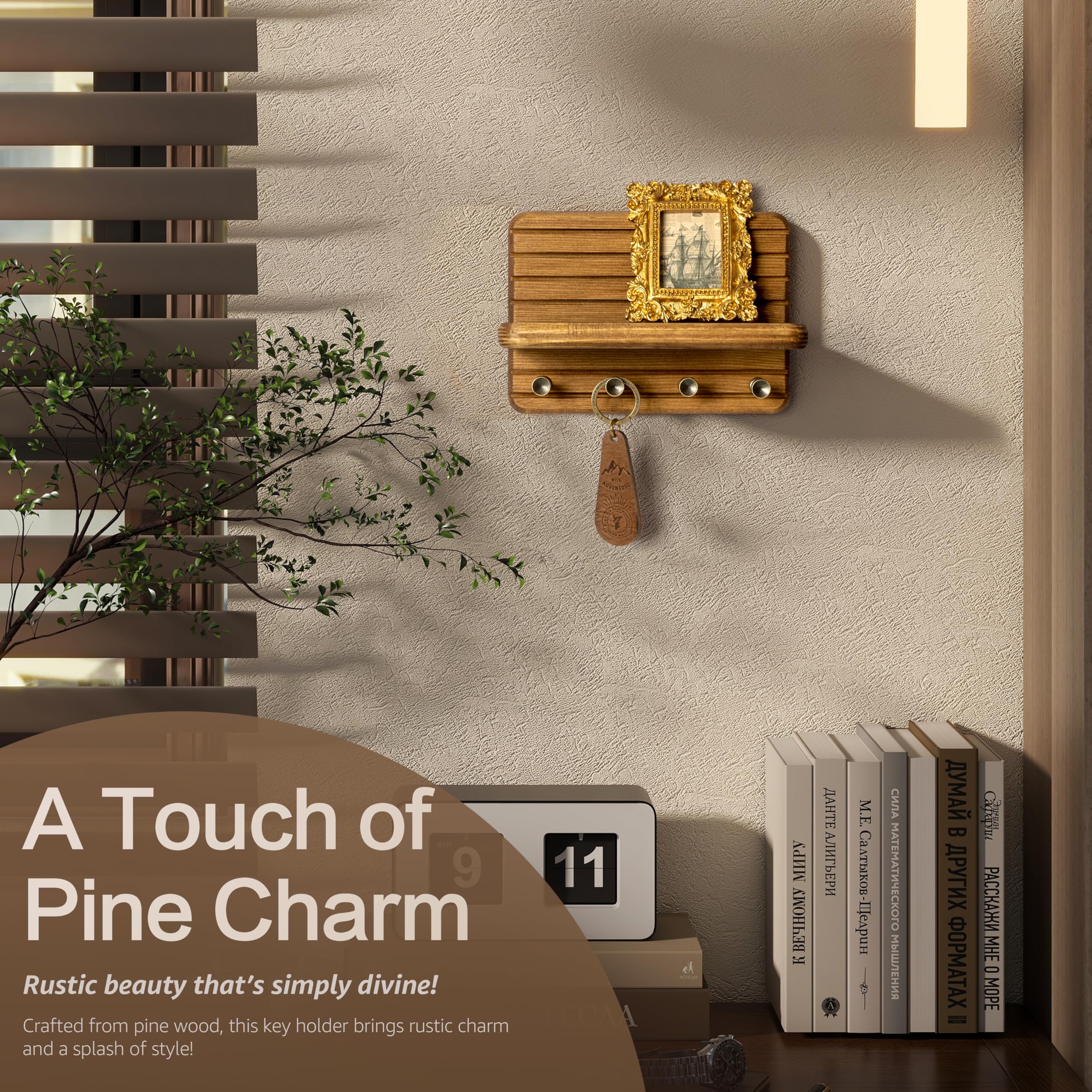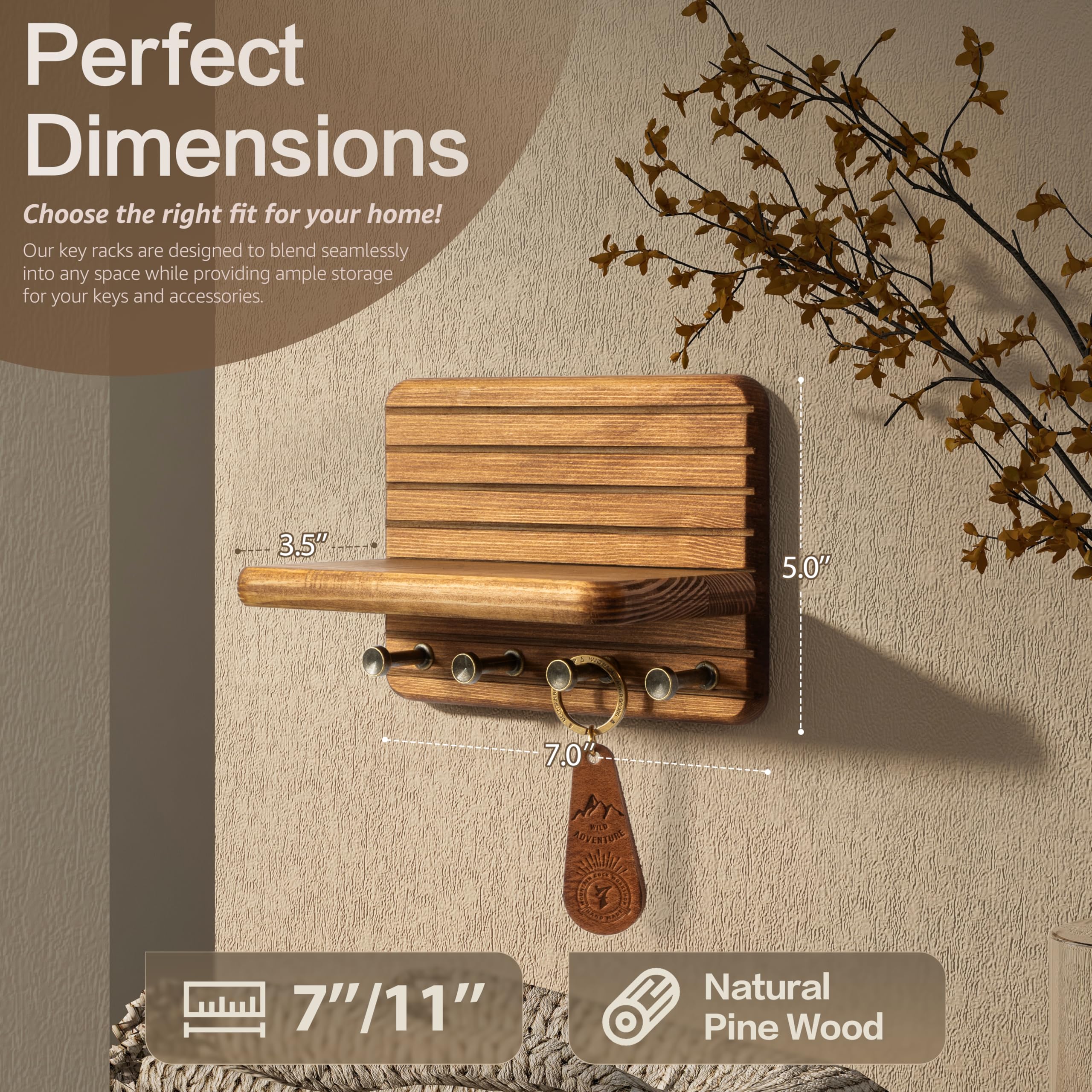 Rebee Vision(リービービジョン) 小型キーホルダー 壁掛け式 ホームデコレーション用 – 装飾用7インチパイン木製キーホルダー 壁用 フック4個&ミニフローティングシェルフ付き - モダンなファームハウスホームオーガナイザー (ライトブラウン)