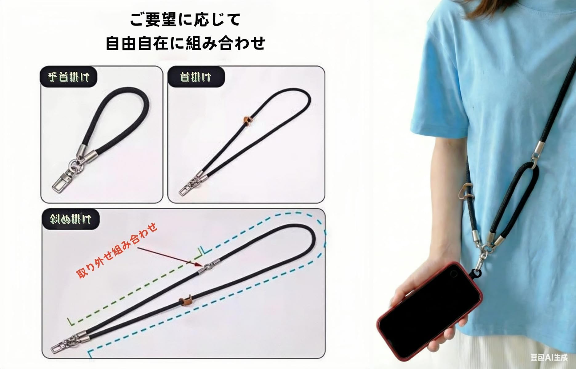 このスマートフォン用ストラップセットは、日常生活をより快適にする便利なアクセサリーです。首掛けタイプのショルダーストラップと手首用ストラップの両方が含まれており、シーンに応じて使い分けることができます。軽量設計で長時間の使用でも負担が少なく、斜めがけや肩掛けスタイルで両手を自由に使えるため、買い物や通勤、旅行時に大変便利です。調節可能なストラップは体型や好みに合わせて長さを変えられます。丈夫な素材と金属パーツを使用しており、大切なスマートフォンの落下を防止します。iPhone、Android問わず、全機種に対応可能な汎用性の高いデザインです。取り付けも簡単で、スマートフォンケースのストラップホールに装着するだけ。多様カラーはどんなファッションにも合わせやすく、ビジネスシーンからカジュアルまで幅広く活用できます