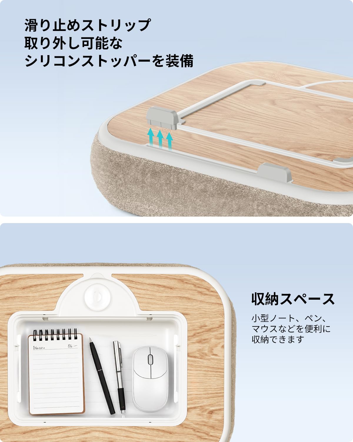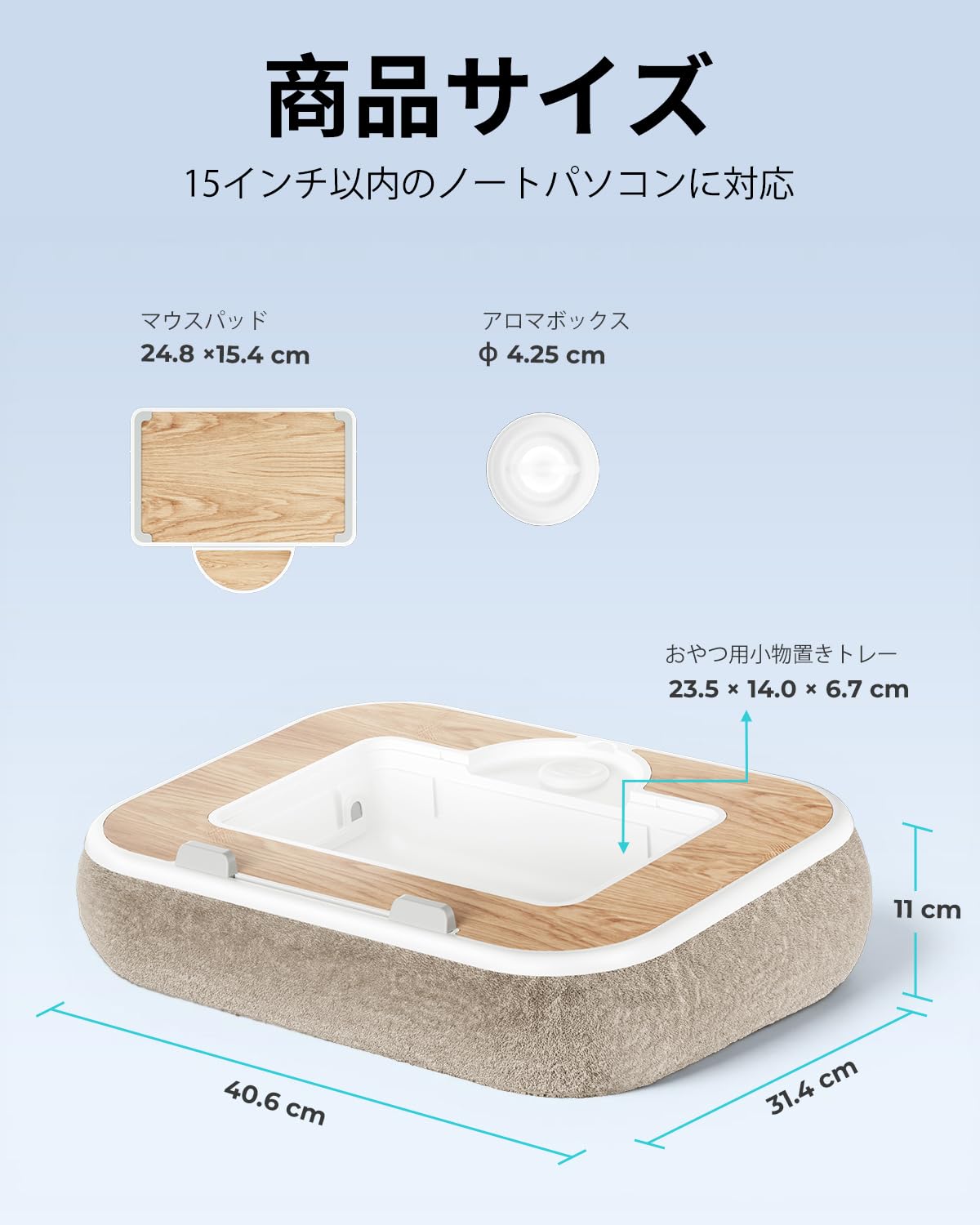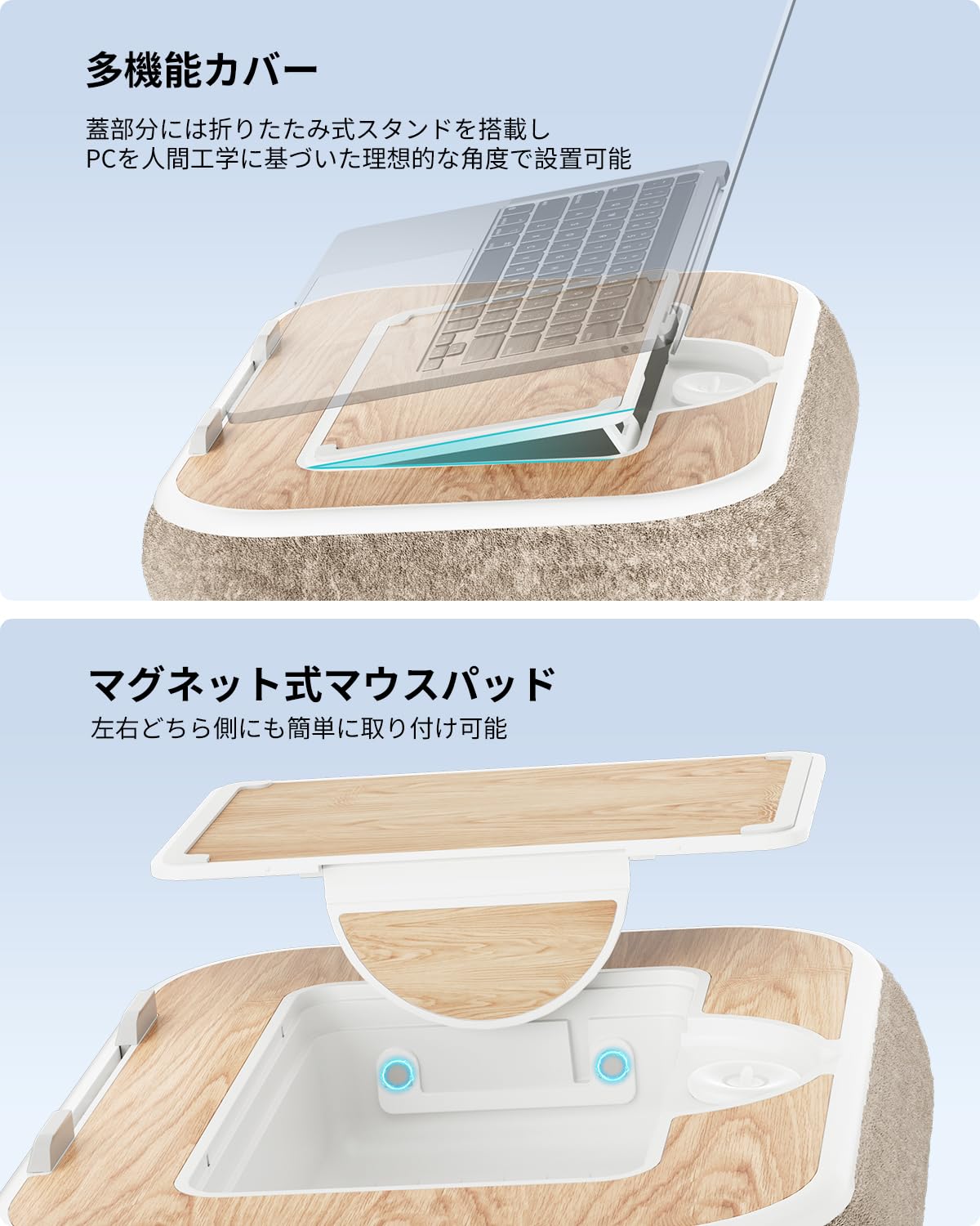 viozon 膝上テーブル PCクッション ノートパソコンスタンド 在宅ワーク用 15インチ以内対応 収納付き マグネット式マウスパッド アロマオイル対応 ナチュラル木目調 ベージュ