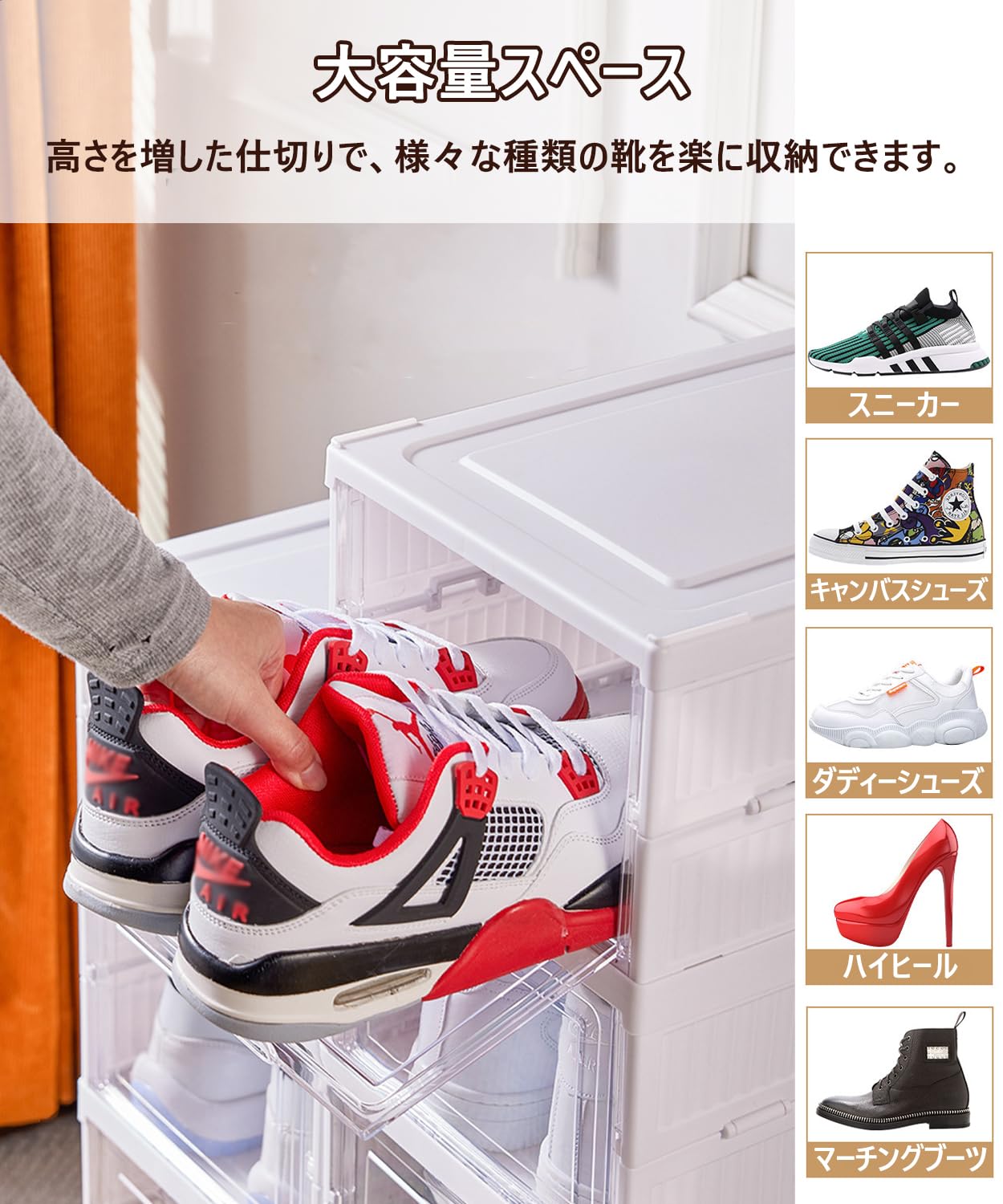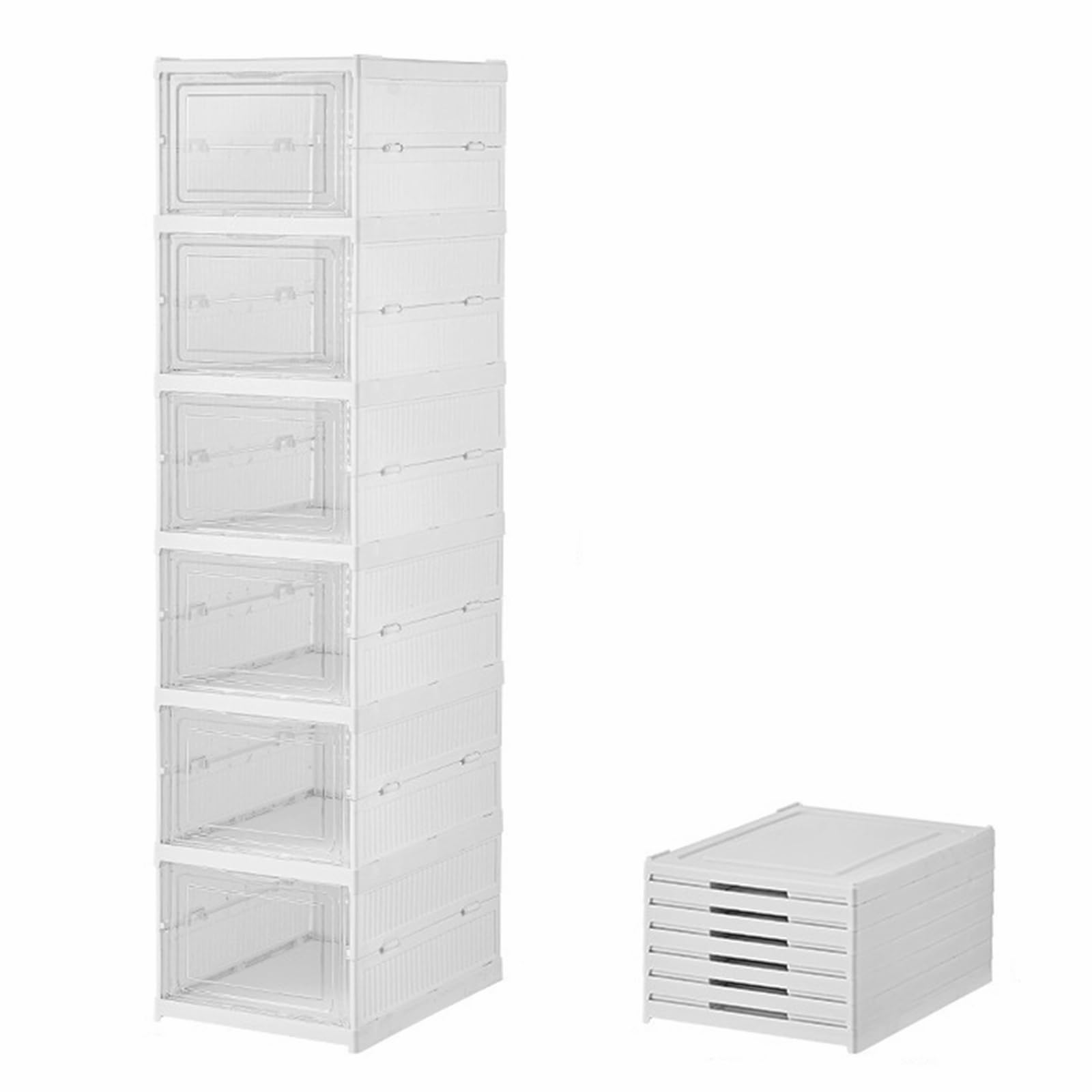 GUDEMAY 透明 シューズボックス シューズ収納 折りたたみ式シューズオーガナイザー スニーカー ストレージビン 積み重ね可能なストレージトート コンテナ 靴ケース 靴 箱 棚 収納ボックス (ホワイト, 6層)