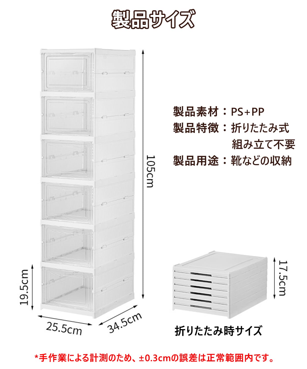 【モジュラー垂直積層システム】標準モジュールサイズ(単体34.5×25.5×19.5cm)のPP素材を採用し、無限垂直積層をサポート。6段積みで総高105cmを実現。玄関・クローゼット等の狭小空間に完璧適合。