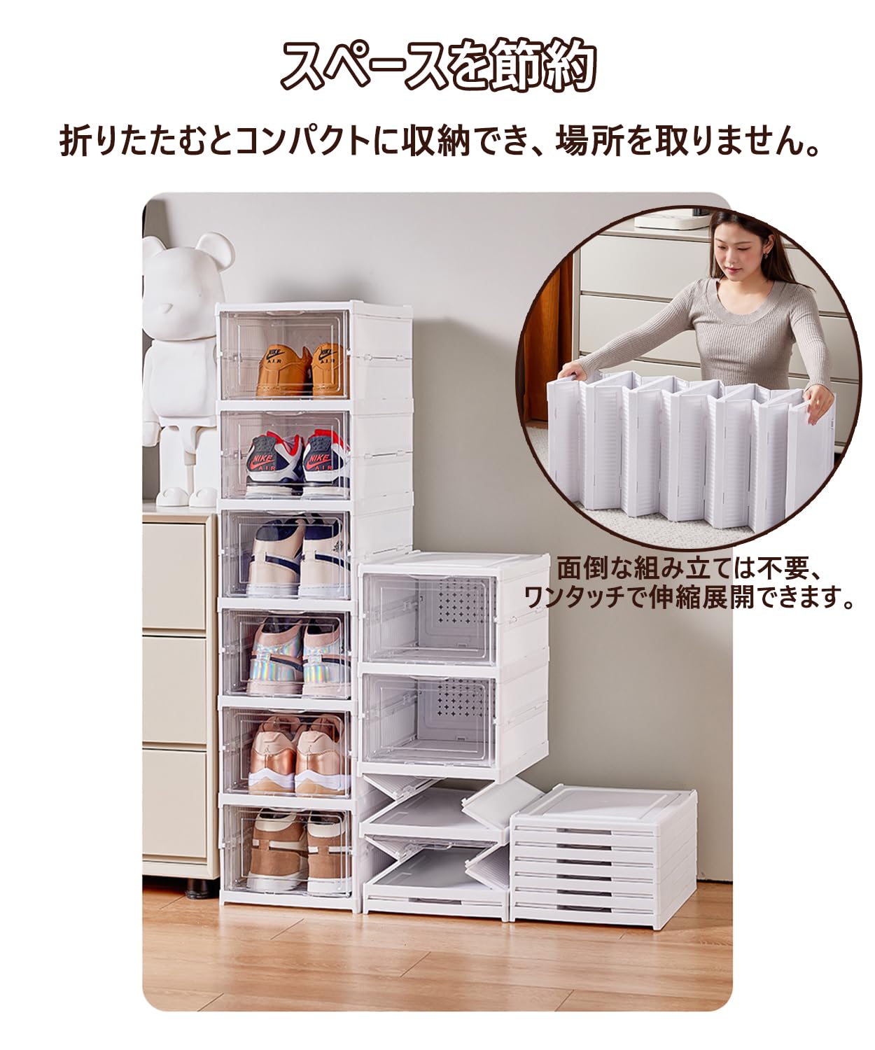 Aquafix シューズボックス 6段 折りたたみ 透明 シューズケース 大容量収納ボックス 下駄箱 靴箱 省スペース 高耐久 工具不要 防塵 通気(ホワイト)