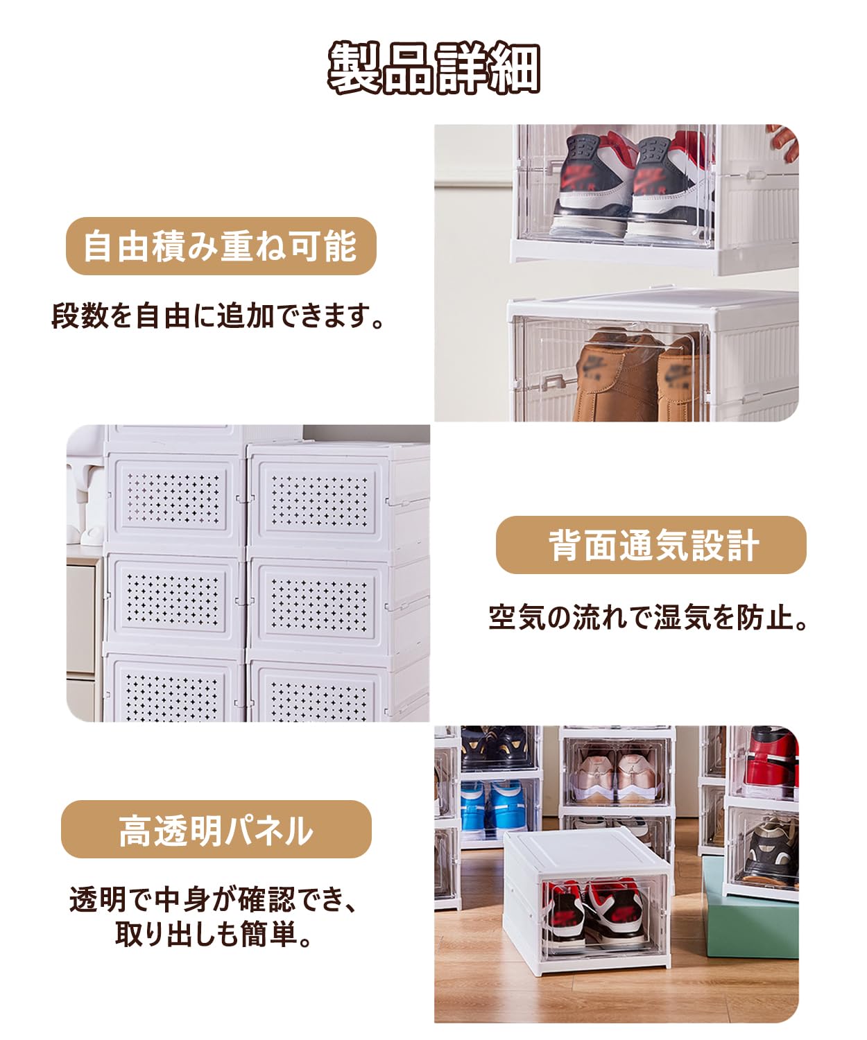 GUDEMAY 透明 シューズボックス シューズ収納 折りたたみ式シューズオーガナイザー スニーカー ストレージビン 積み重ね可能なストレージトート コンテナ 靴ケース 靴 箱 棚 収納ボックス (ホワイト, 3層)