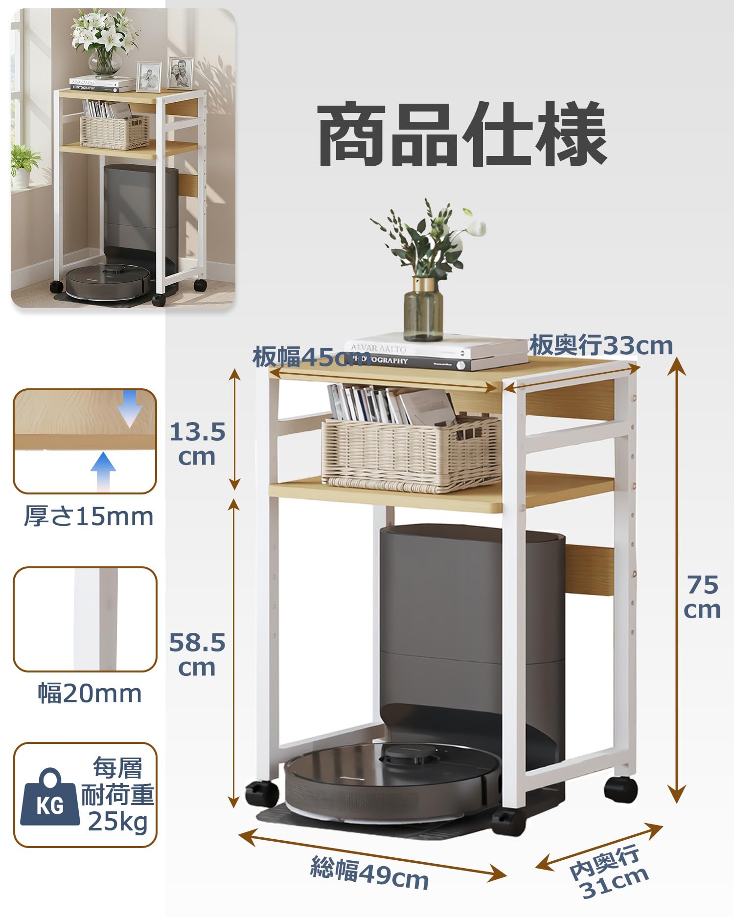 SUOWUKS ロボット掃除機収納ラック お掃除ロボット置き台 高さ調節可能収納ラック サイドテーブル 多サイズ対応 落下防止 ベッドサイドテーブル キャスター付き 移動便利 空間活用ラック 寝室 リビングルーム ソファ ベッドサイド 室内収納 (ウッド色, 幅49CM) [並行輸入品]