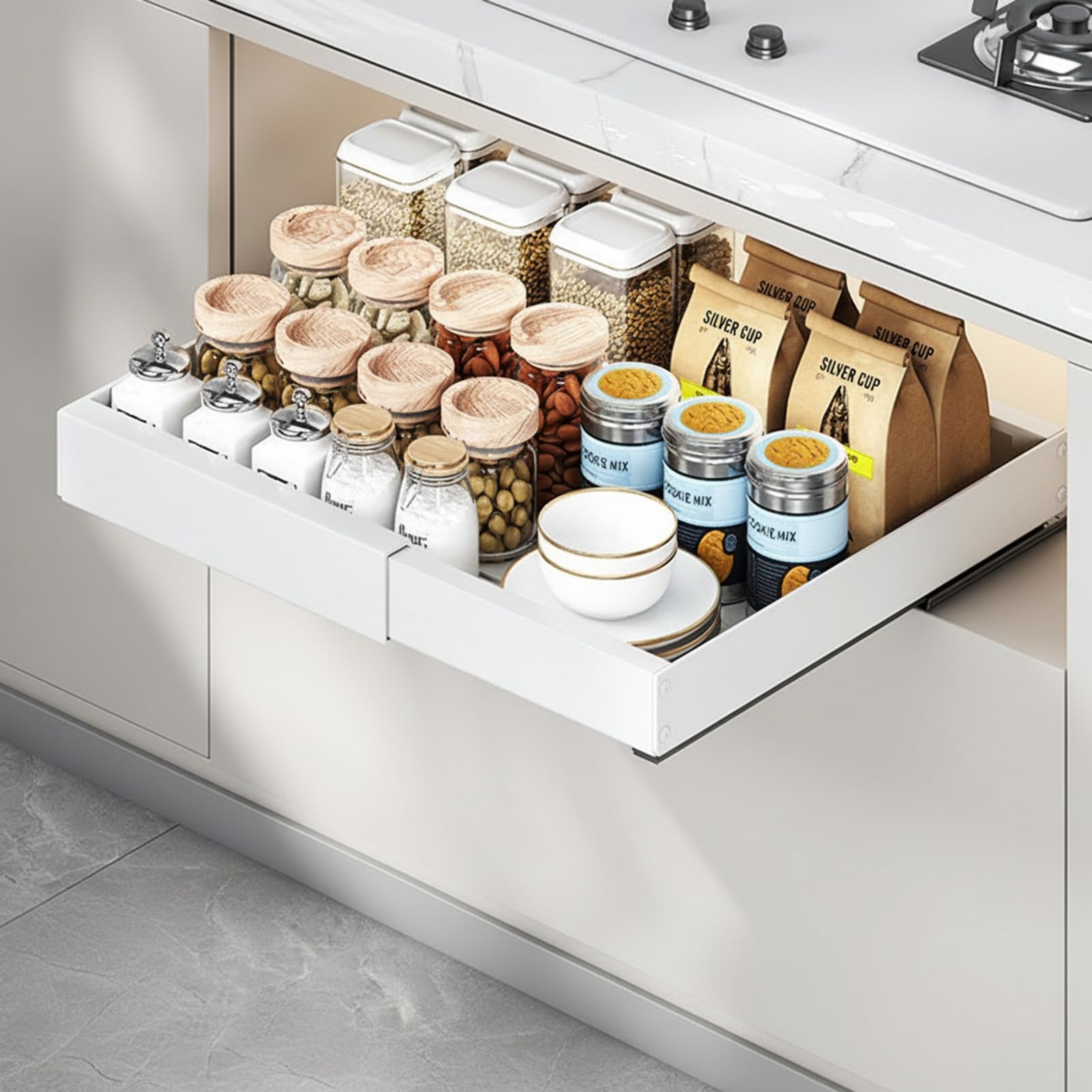 ESJNNK シンク下 収納 L字型 スライド式 2段 金属製 防錆 高さ調節可能 洗面台下 引き出し 収納ラック キッチン収納 シンク下収納ラック 調味料 組立簡単 大容量 省スペース (1)