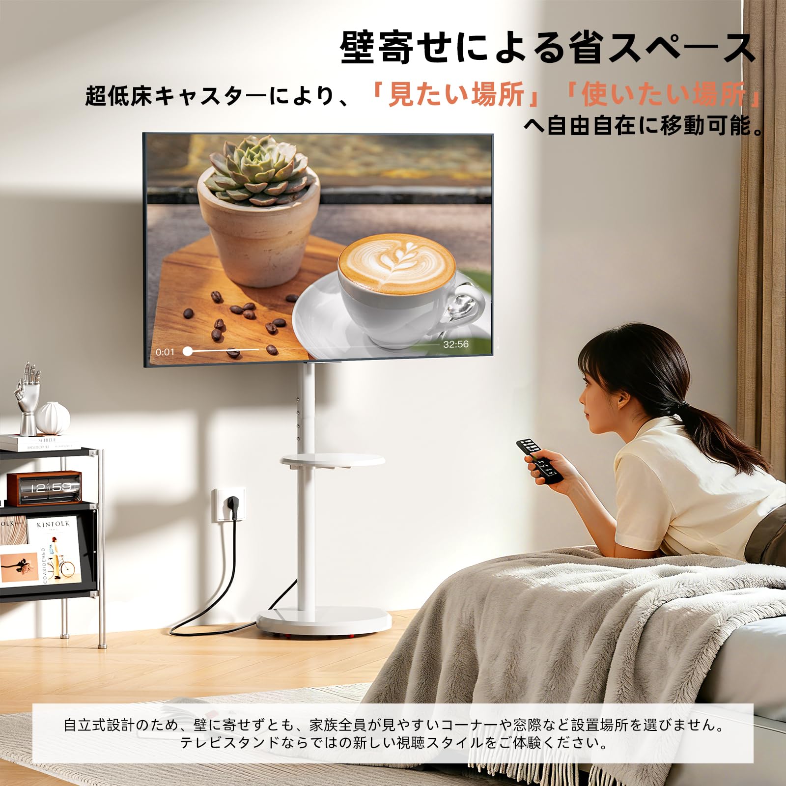 AOKCOS テレビスタンド 壁寄せテレビスタンド 移動式 テレビ台 32-65インチ対応 キャスター付き 高さ調整可能 首振り可 チルト 木製ベース ホワイト FTC1406AWN-J