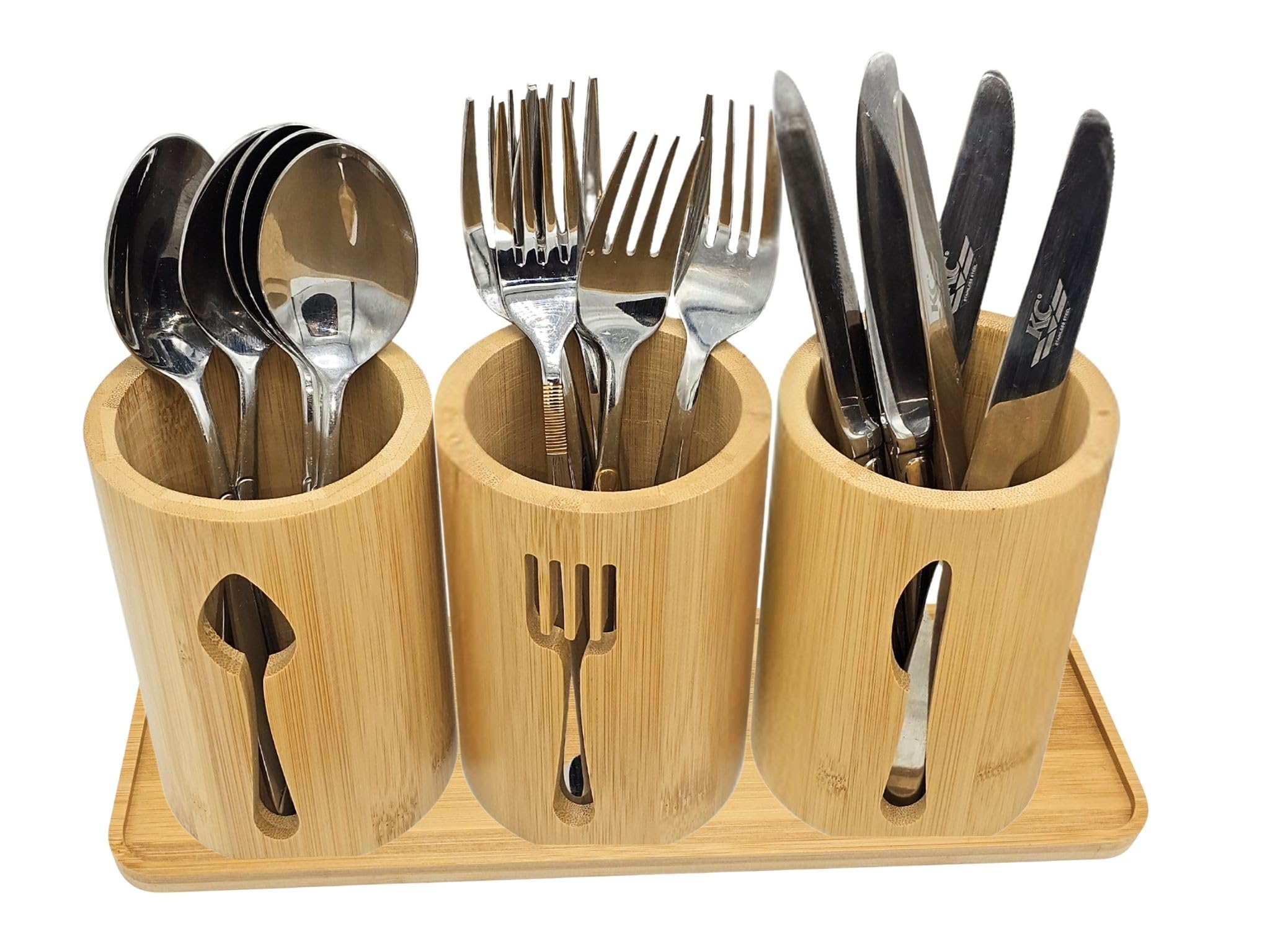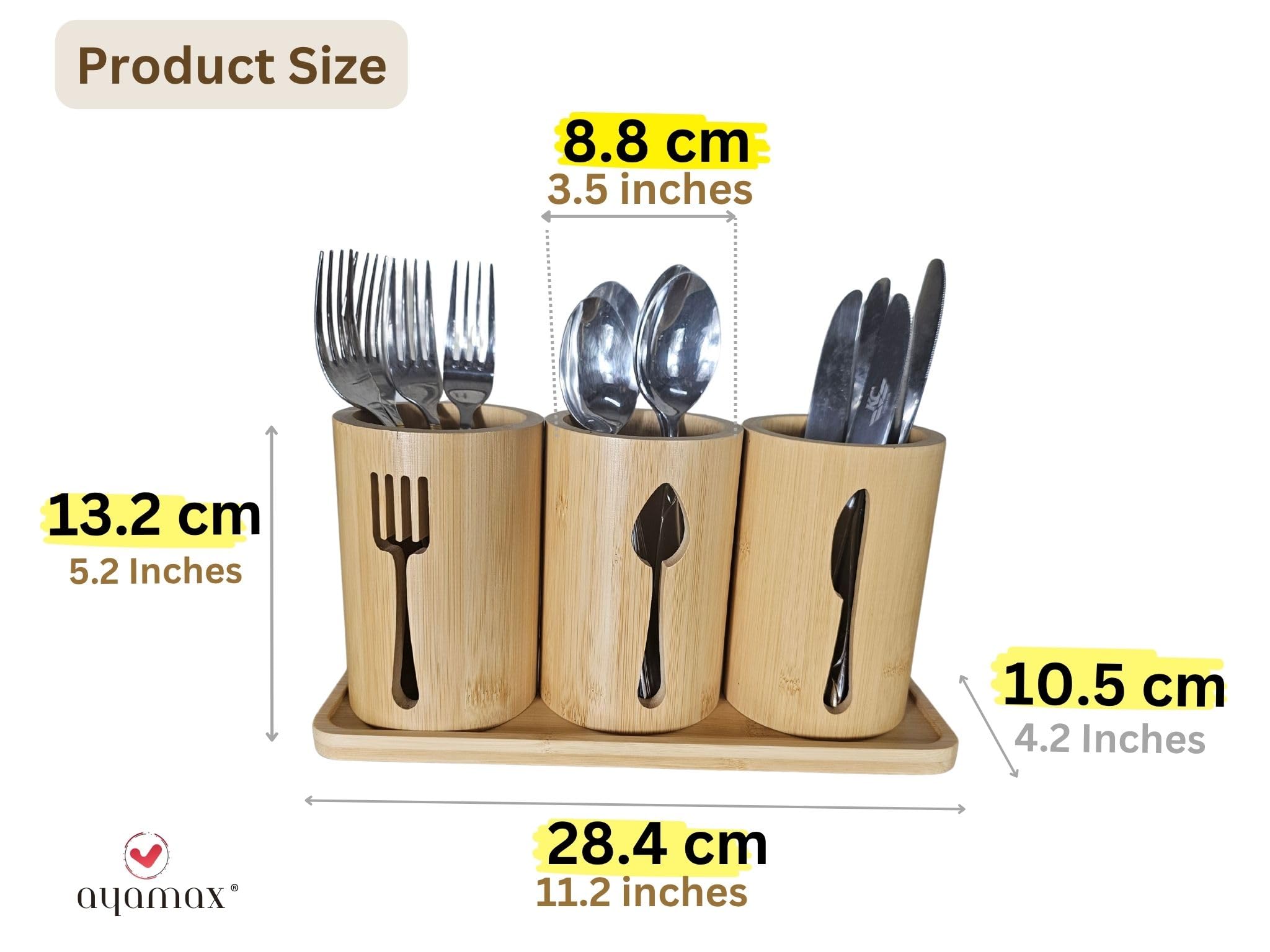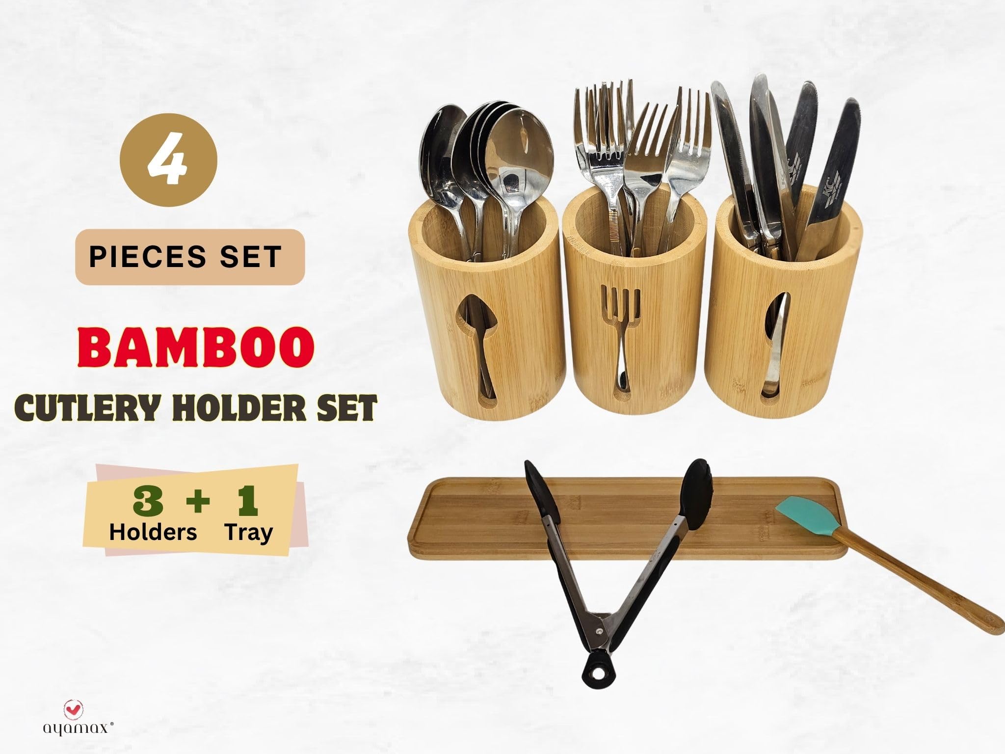 AYAMAX 竹製カトラリーホルダー 3点セット 竹製トレイ付き|キッチン用品ホルダー カトラリーオーガナイザー|調理器具・箸・ナイフ・フォーク・スプーン収納