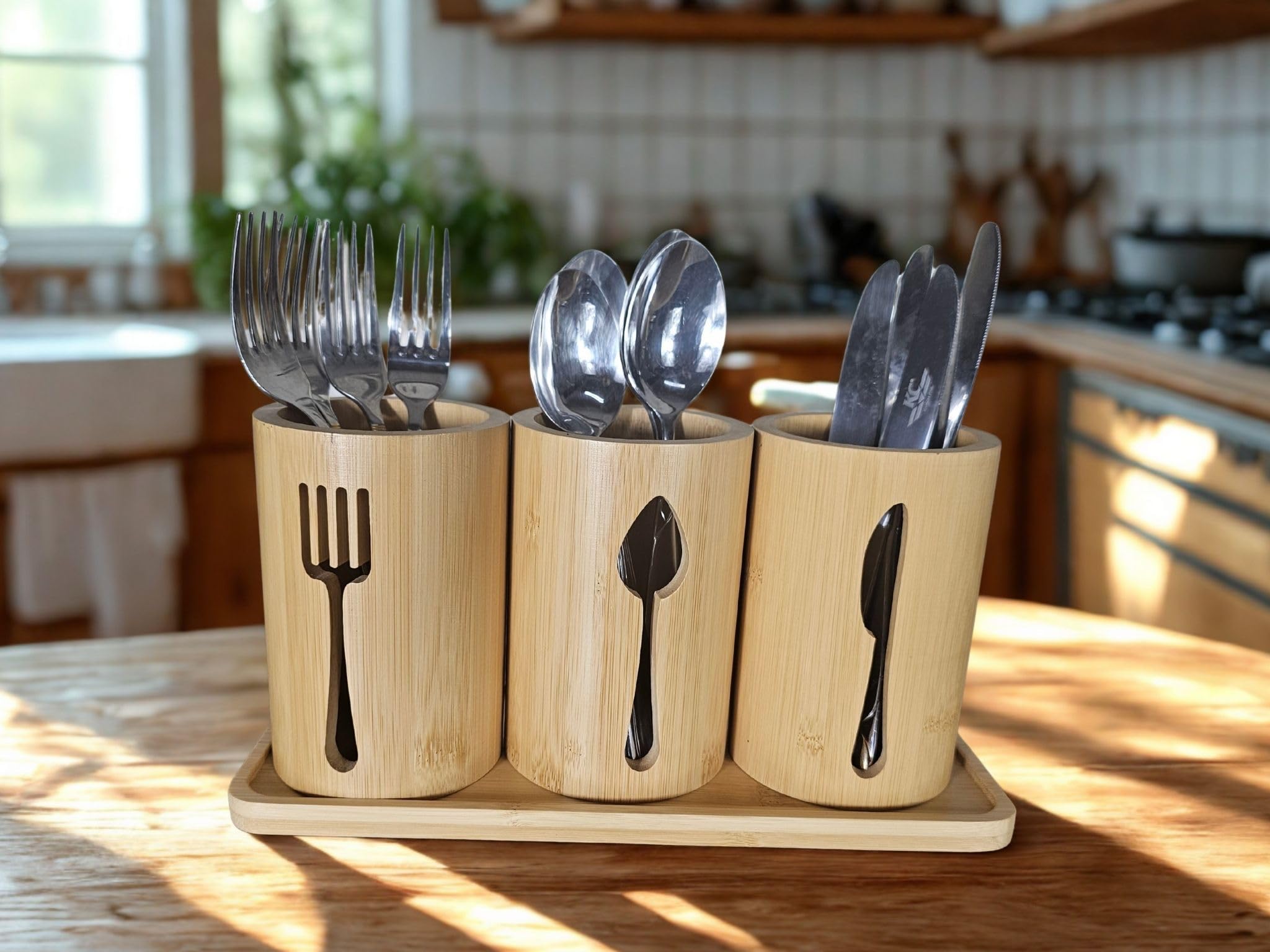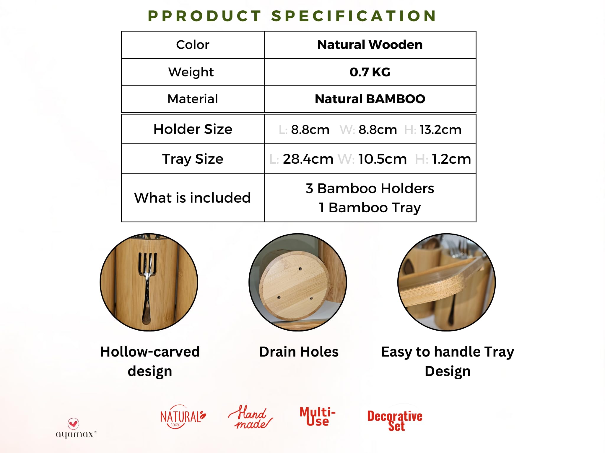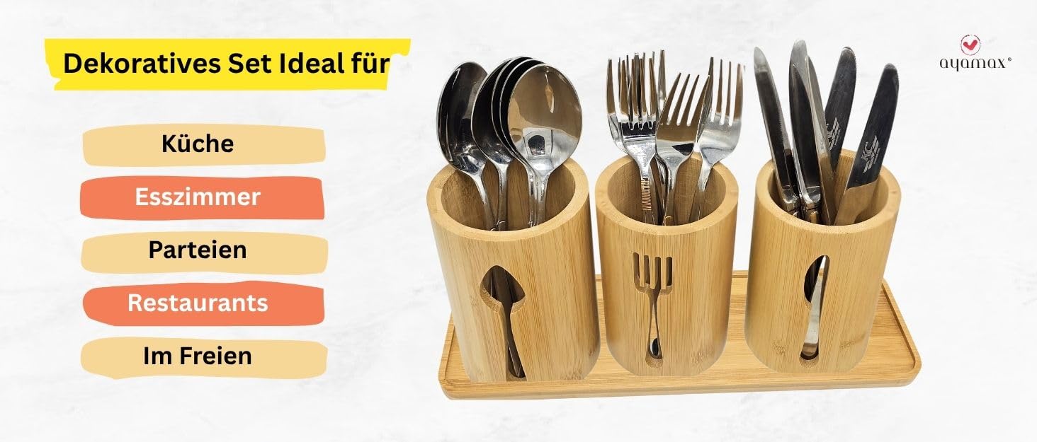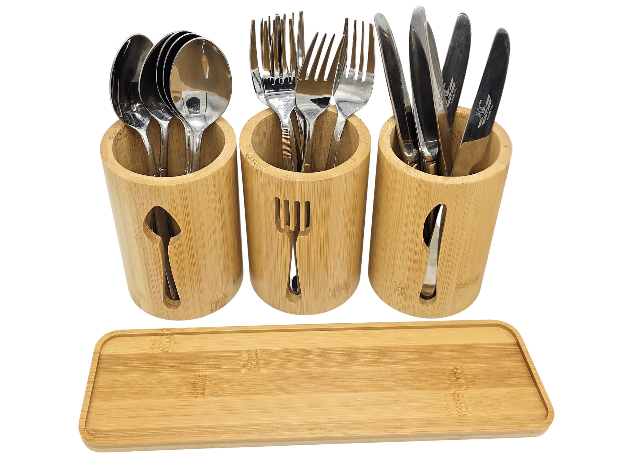 AYAMAX 竹製カトラリーホルダー 3点セット 竹製トレイ付き|キッチン用品ホルダー カトラリーオーガナイザー|調理器具・箸・ナイフ・フォーク・スプーン収納