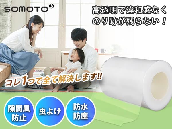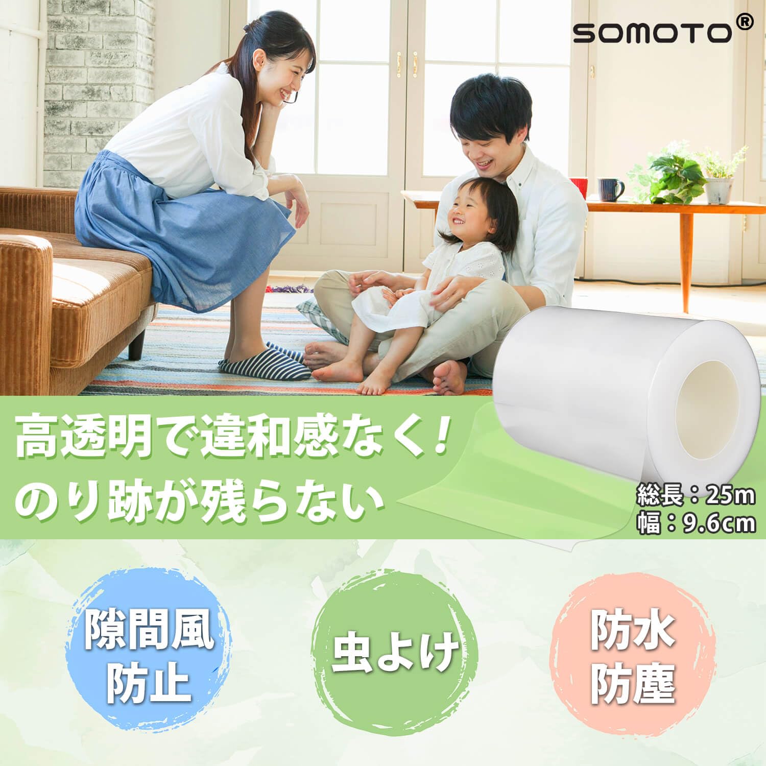 SOMOTO 隙間テープ 窓 隙間風対策 隙間風防止テープ クリアで違和感なく ノリが残らず 防水 防寒 防風 防音 防虫 冷暖房効率アップ 冷気遮断 網戸/ドア/玄関/サッシ/台所(クリア、幅9.6cm×25m)