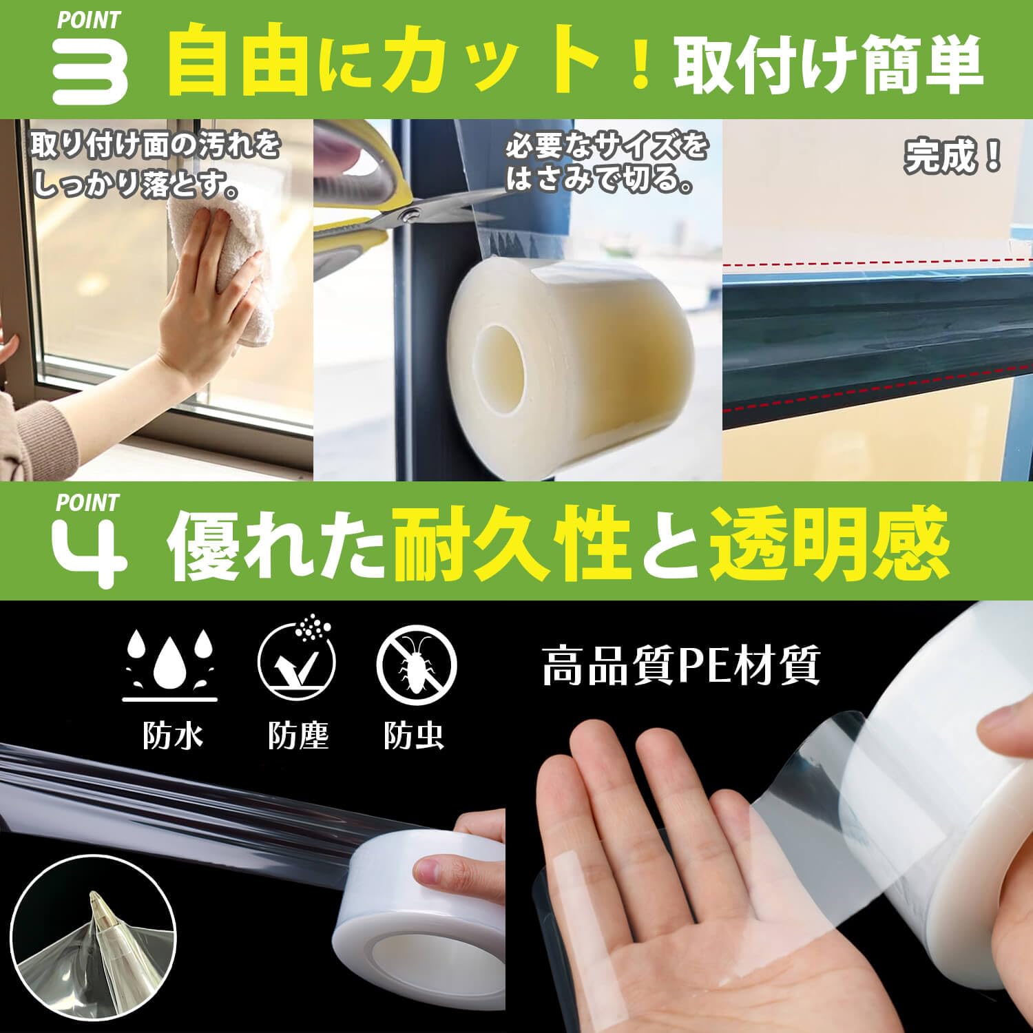隙間テープ 隙間風防止テープ リアで違和感なく ノリが残らず 隙間風対策 防水防カビ 隙間塞ぎ 虫よけすき間断熱テ-プ 防水 防塵 防油 防蝕 防カビ 防寒 防風 防音 防虫 冷暖房効率アップ 結露抑制 夏涼しく 冬暖かく 寒風を防ぐ 冷気遮断 網戸用 玄関 ドア用 窓用 サッシ用 隙間対策 色:クリア サイズ:幅50MM×21M