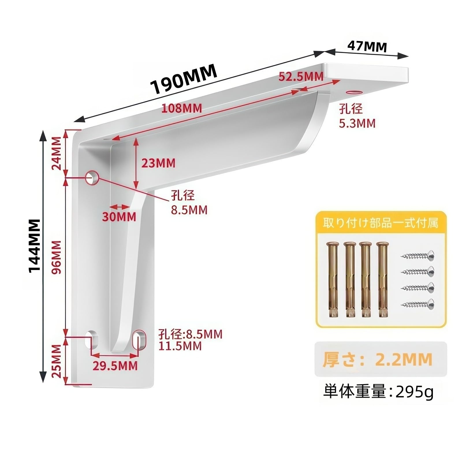 AILEWE 棚受け金具 頑丈 耐荷重200kg 厚さ2.2mm 幅さ47mm 長さ190mm,l字アングル スチール製 防水 防錆,壁 金具 l型 幅広 DIY 省スペース,ネジ付き 2本セット (白 190mm)