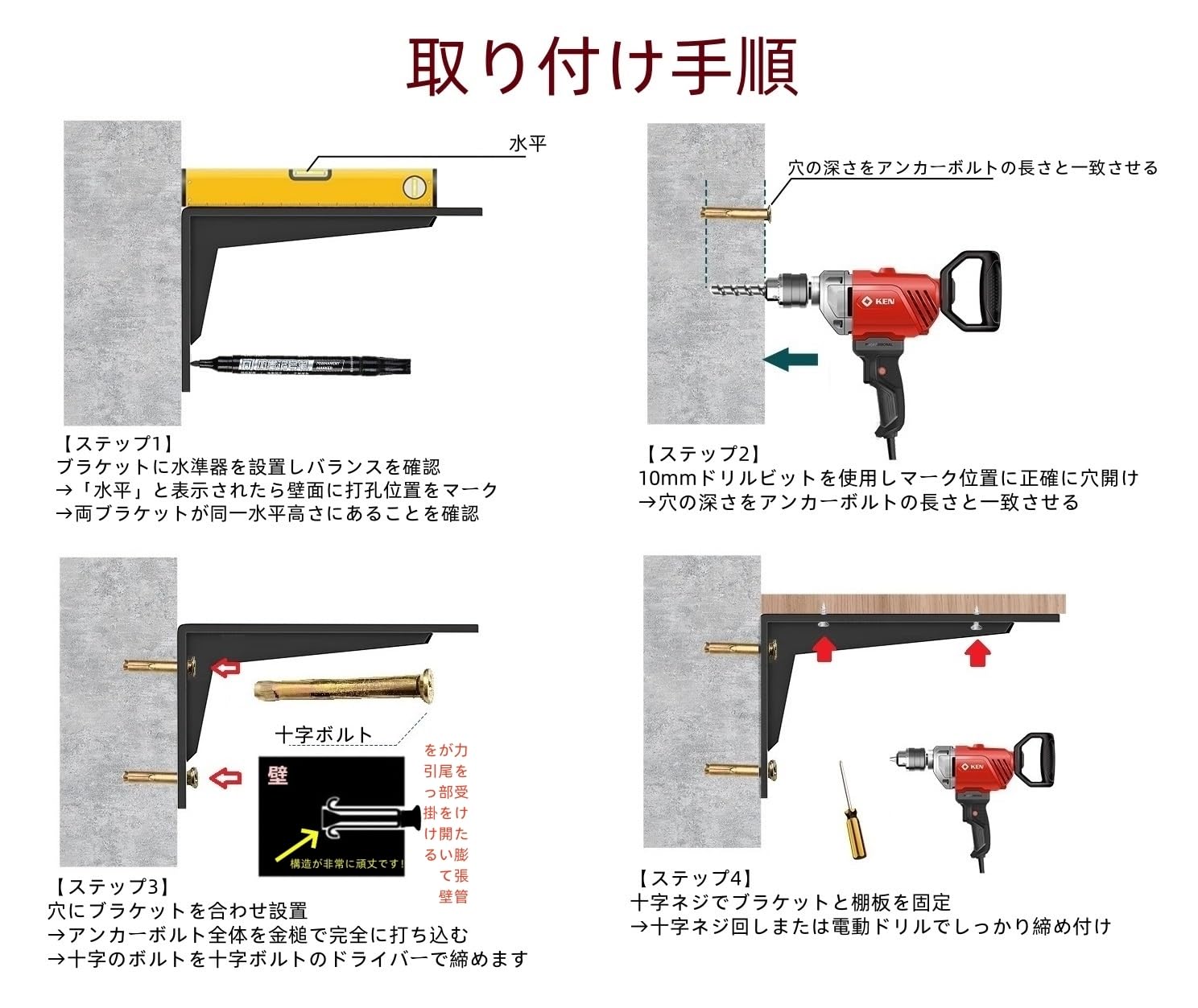 BUYIJIUGE棚受け金具L字型 アイアンブラケット 4本セット ビス付き (300x190x16mm, ブラック)