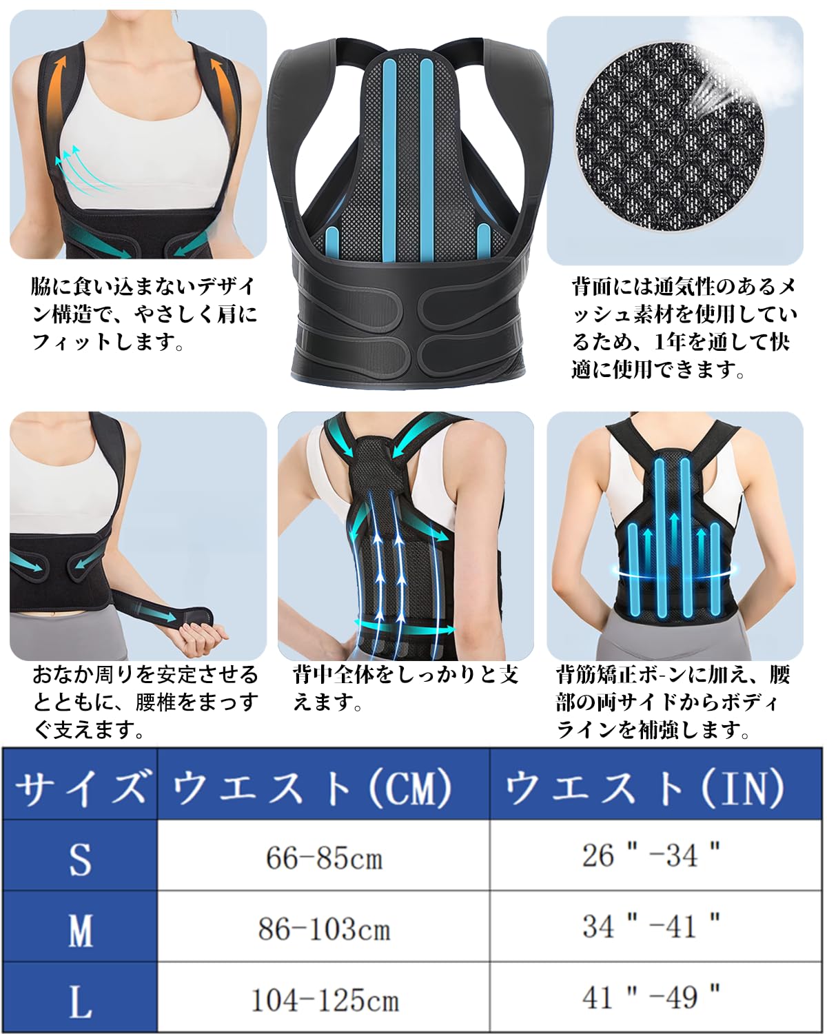 猫背ベルト 姿勢サポーター 背筋ベルト 大きいサイズ 男性用 女性用 目立たない 巻き肩対応 背中とお腹周り 腰 背筋 肩 男女兼用 通気性 脱着簡単 サイズ調整可 日本語取扱説明書付き (M)