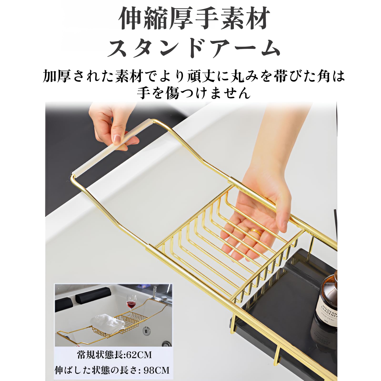 [AOKOWN]バスタブトレー お風呂【格納可能なデザイン62-98cm】ステンレス バスタブスタンド バステーブル 錆びにくい カビない 滑り止め 伸縮式 浴槽ラック 浴室収納 お風呂雑貨置き台