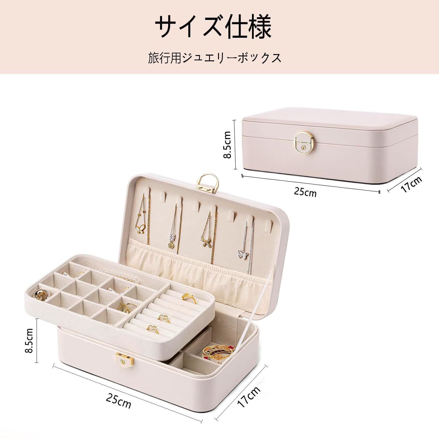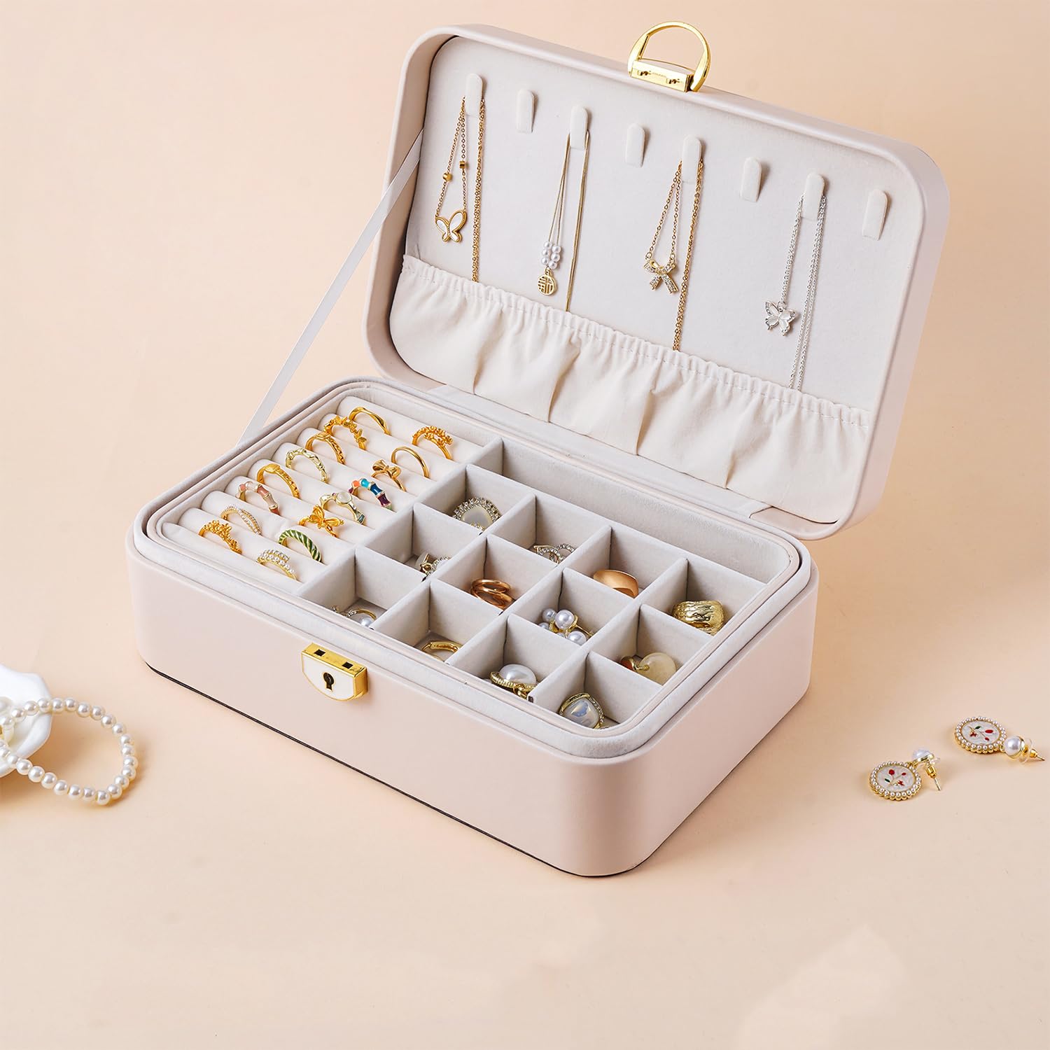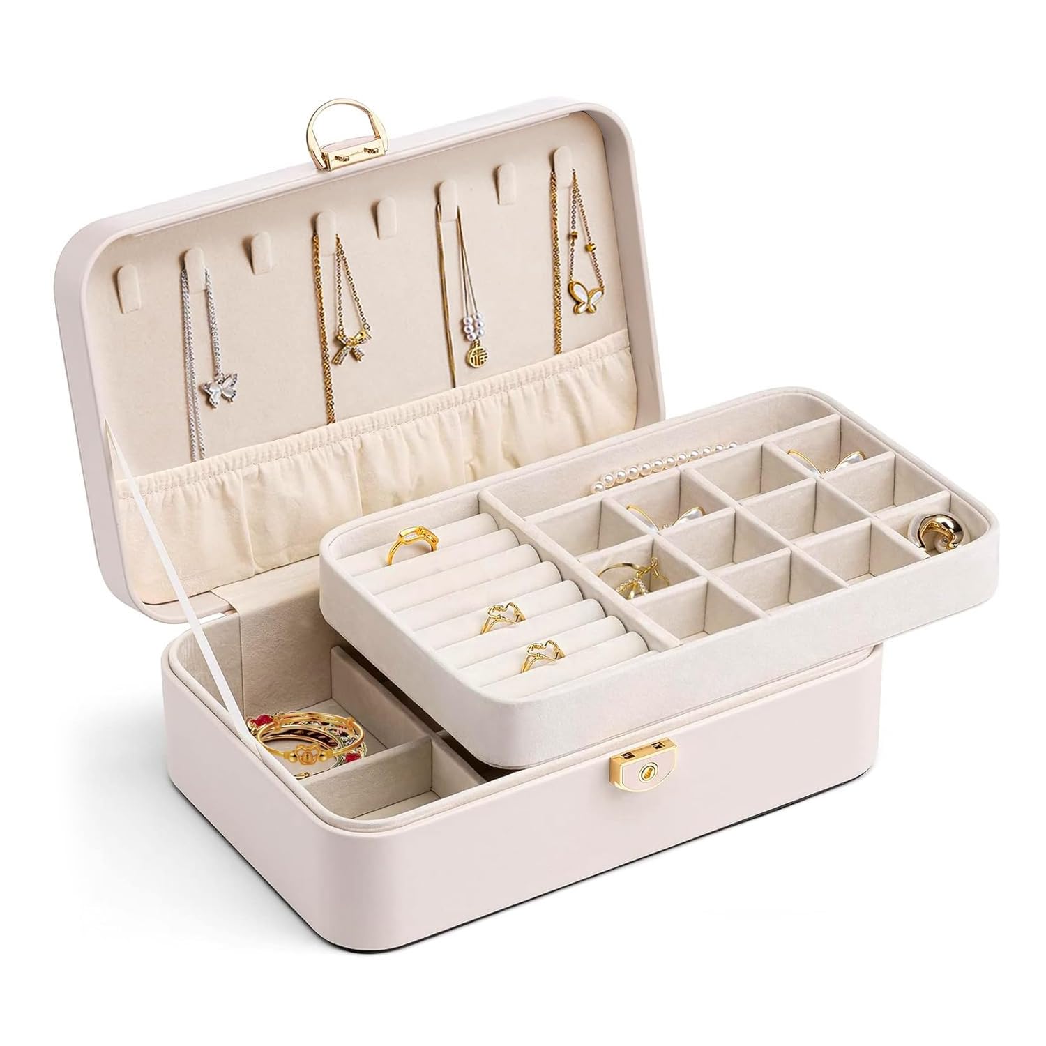 Vlando アクセサリーケース PUレザー ジュエリーボックス 3層大容量 引き出し アクセサリー 収納 仕切り付き携帯用 宝石箱 ジュエリーケース ネックレス ブレスレット イヤリング 指輪用 女の子 女性 アクセサリーボックス ティーン向けギフト(アプリコットホワイト)