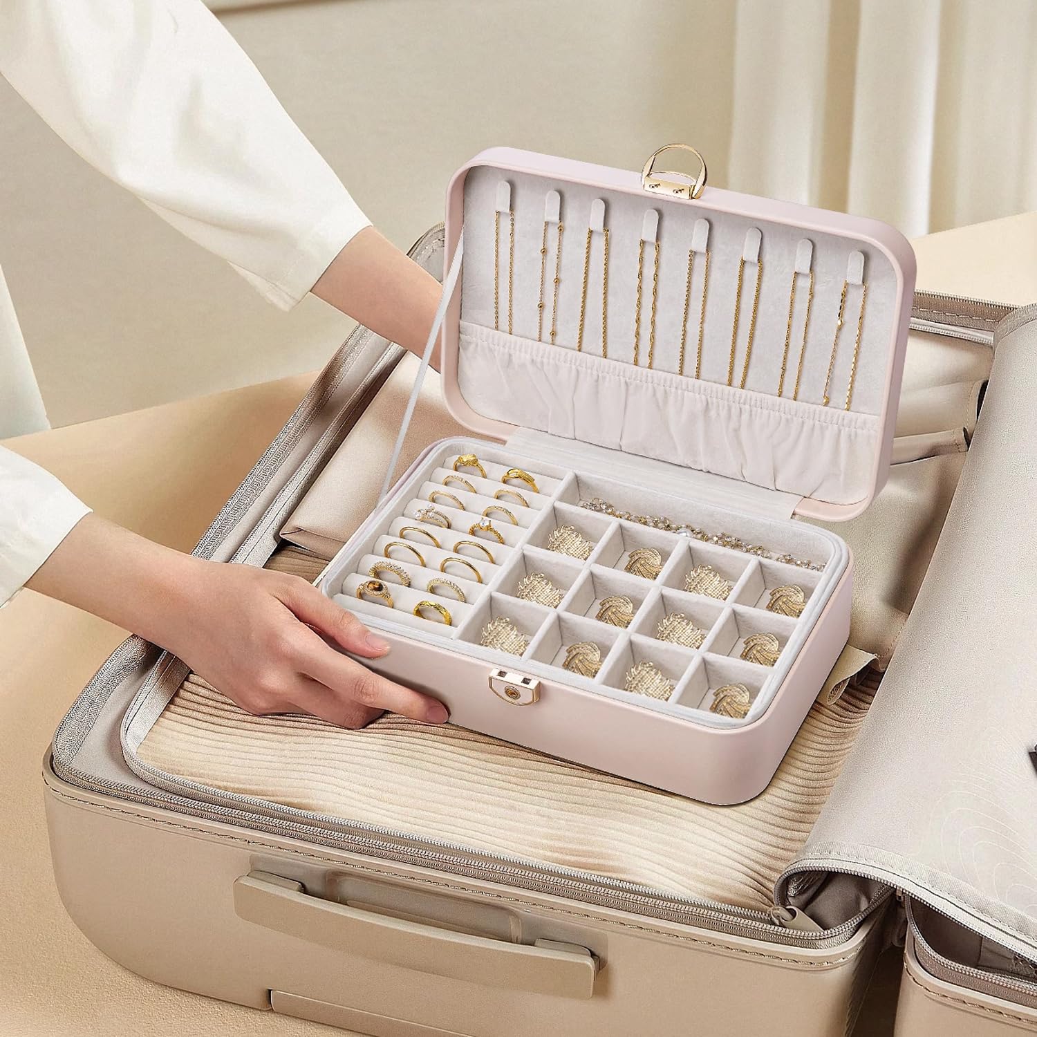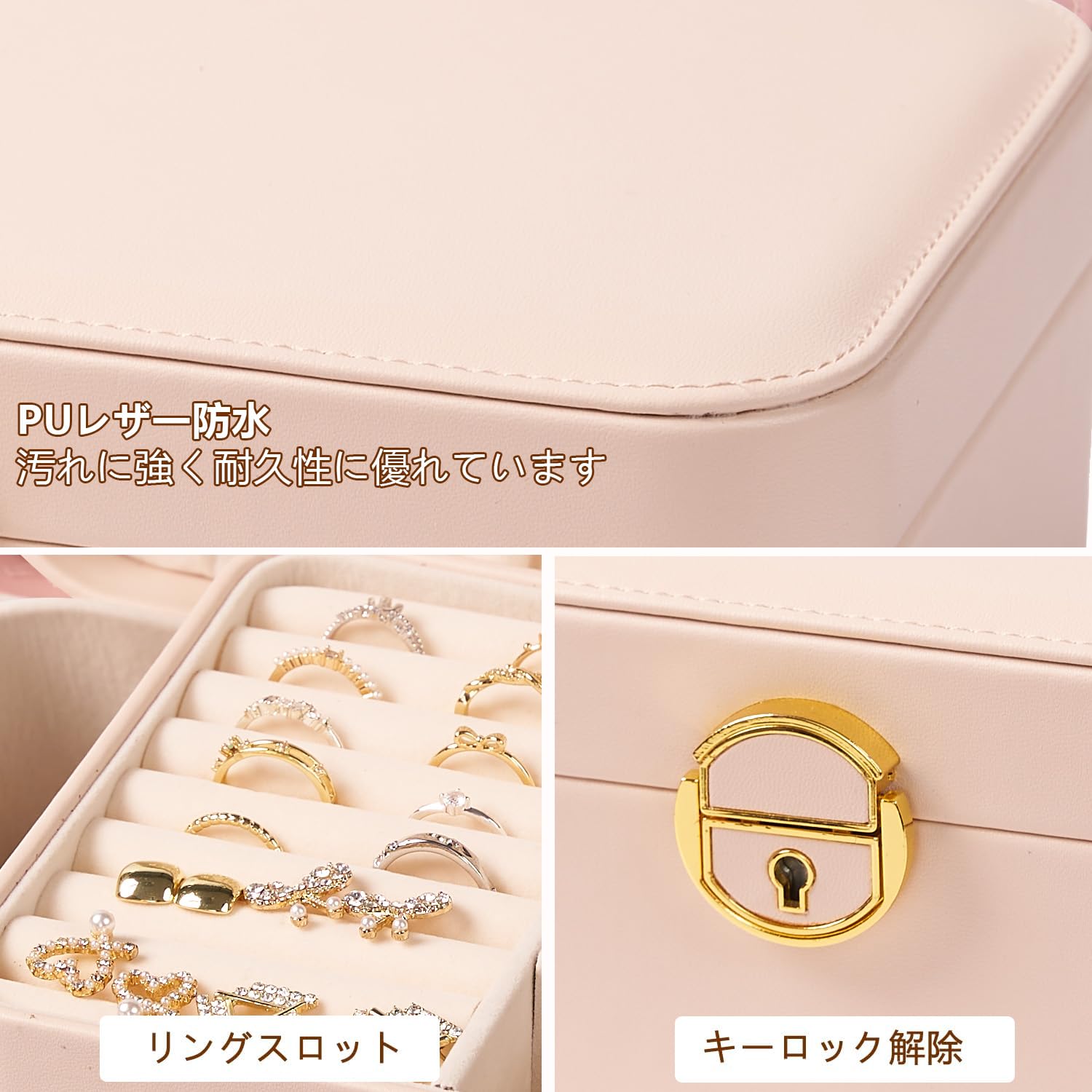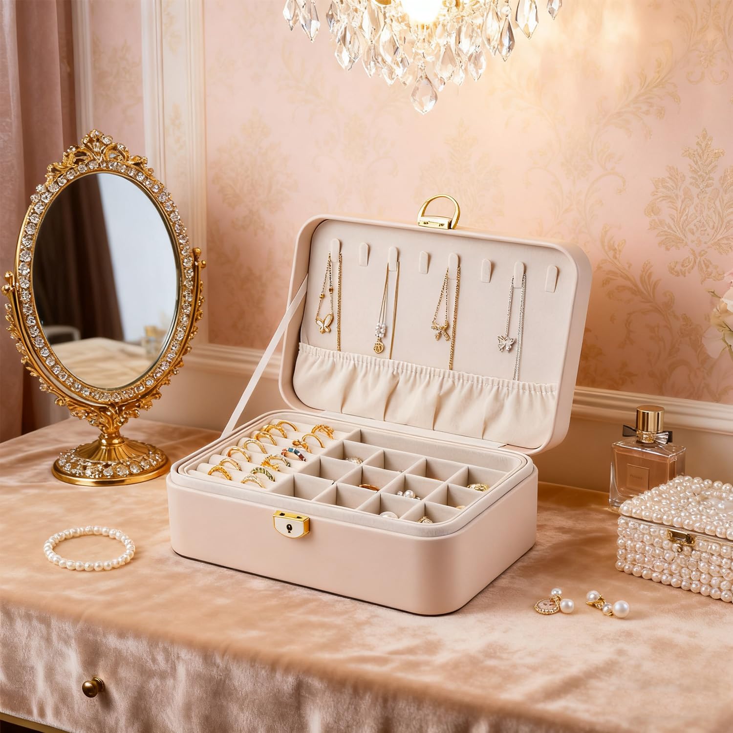 Vlando アクセサリーケース PUレザー ジュエリーボックス 3層大容量 引き出し アクセサリー 収納 仕切り付き携帯用 宝石箱 ジュエリーケース ネックレス ブレスレット イヤリング 指輪用 女の子 女性 アクセサリーボックス ティーン向けギフト(アプリコットホワイト)