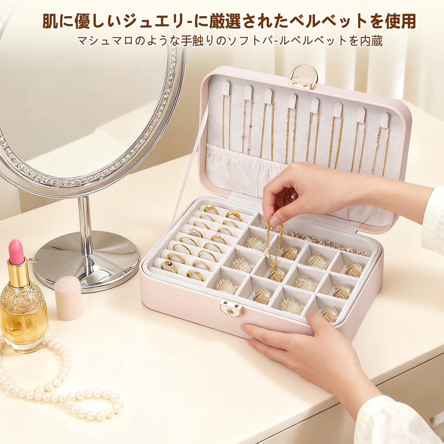 Vlando アクセサリーケース 持ち運び 携帯用 鏡付き フランネル ジュエリーボックス トラベル ピアス 指輪 アクセサリー 収納 かわいい プレゼント(ピンクT)