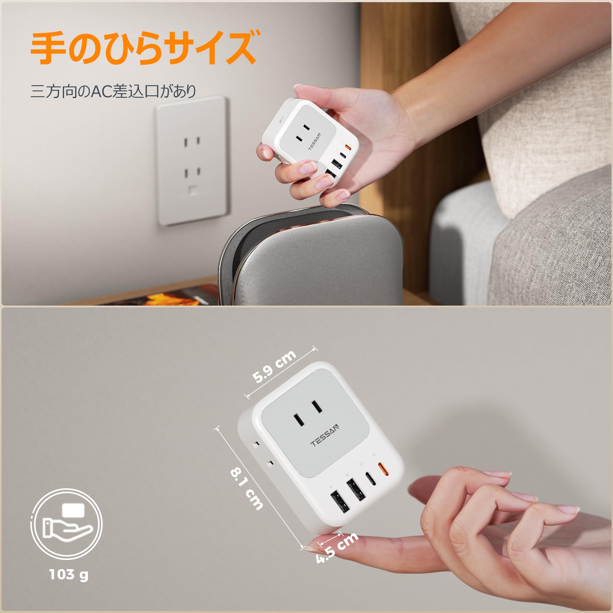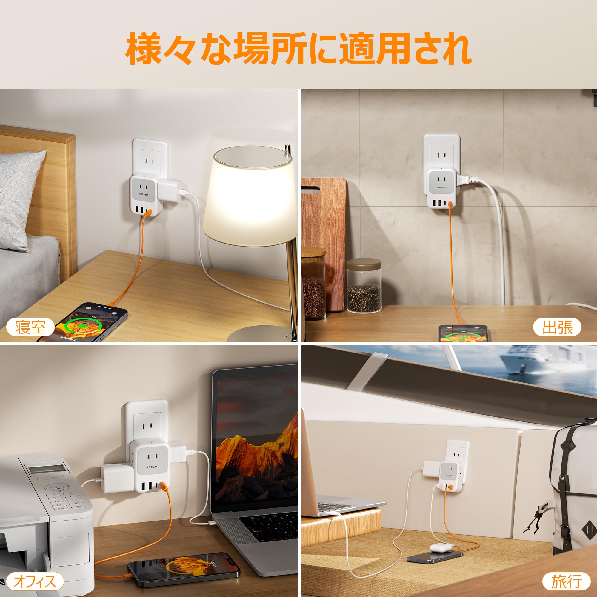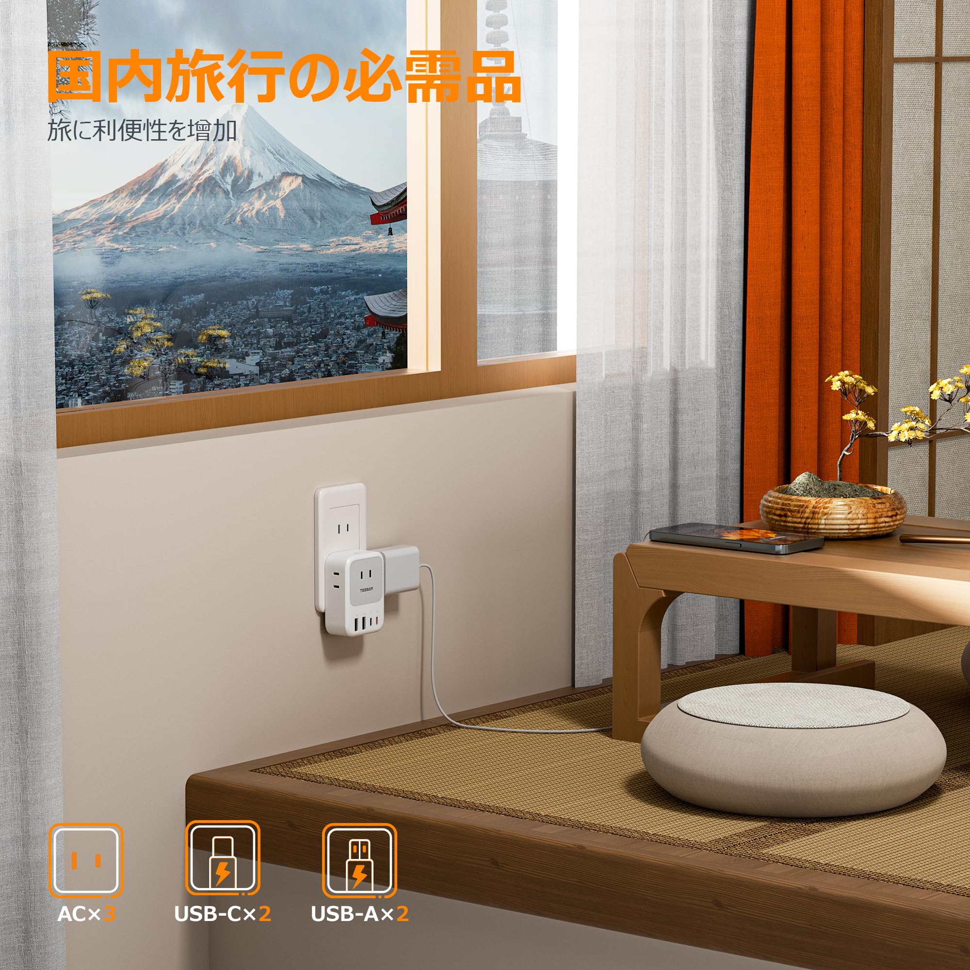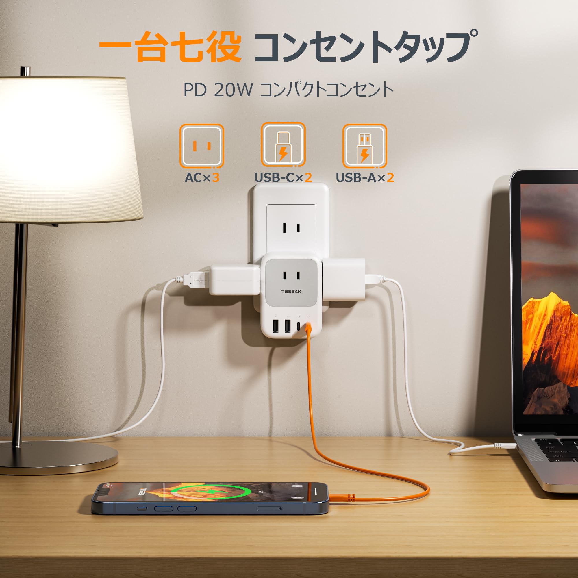 USB コンセントタップ 電源タップ usb-c付き PD 20W対応 TESSAN たこあしコンセント 3個AC口 2個Type-Aと2個Type-Cポート マルチタップ 3口 小型軽量 タコ足配線 雷ガード 日本国内でのみ可能