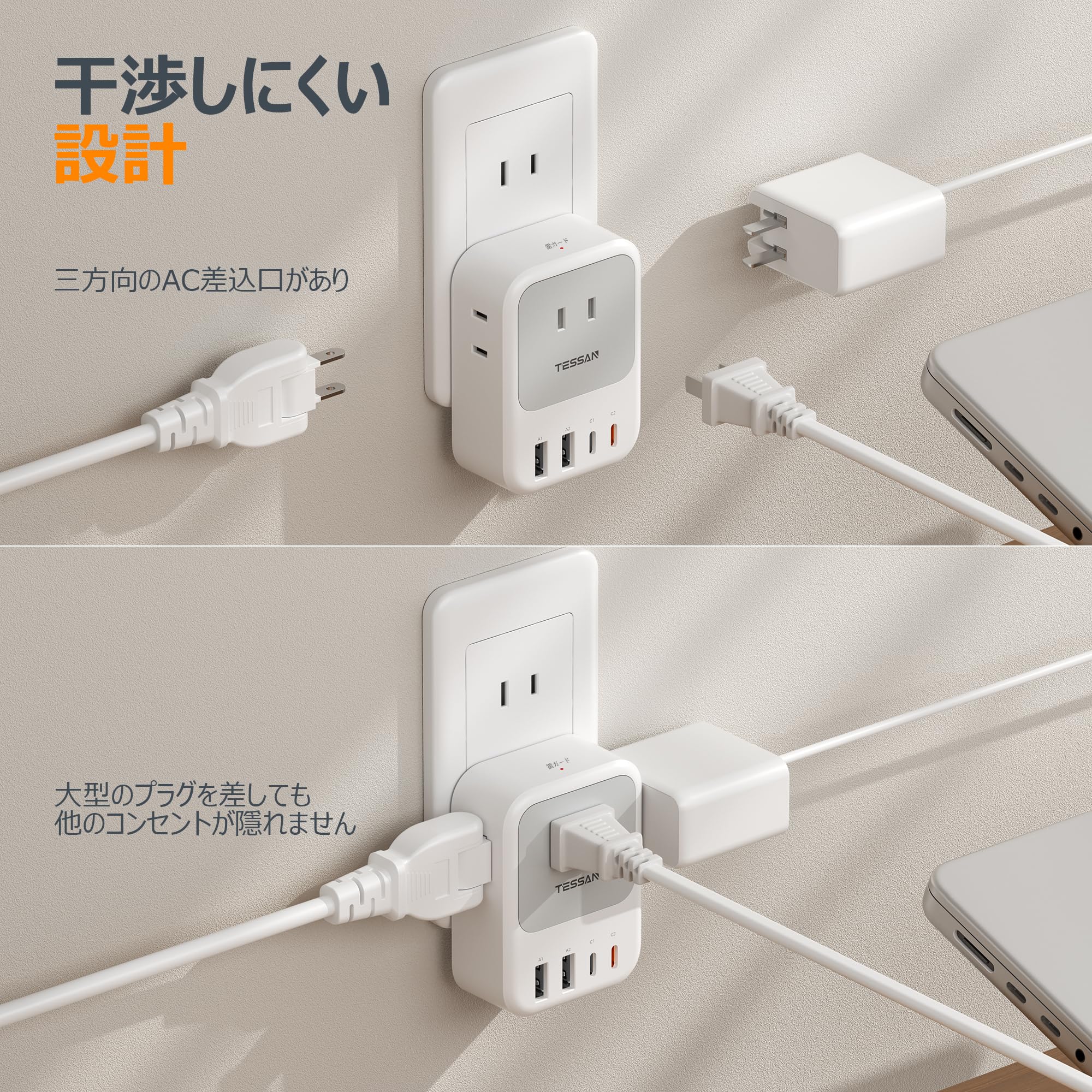 延長コード 2m 電源タップ 折り畳みプラグ usb たこあしコンセント 個別スイッチ付き テーブルタップ TESSAN 8個AC口 2個type-Aポート 2個type-Cポート 雷ガード 壁掛け マルチ oa たこ足配線 節電 省エネ