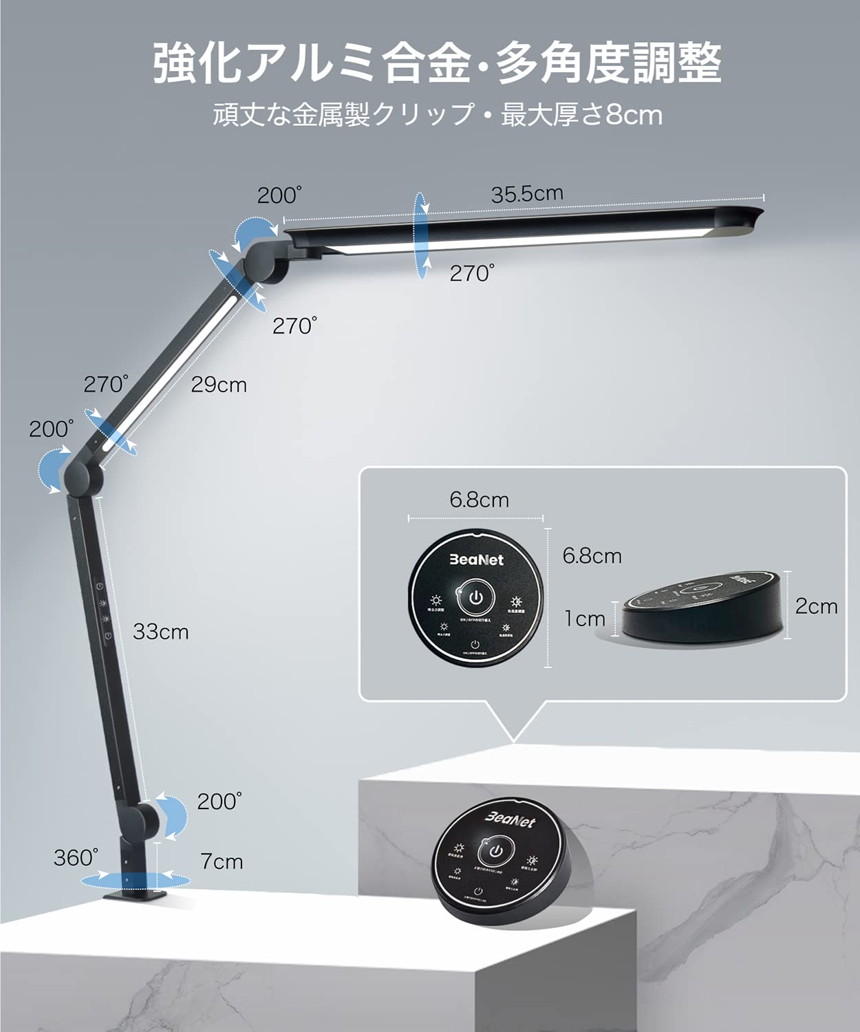 BeaNet デスクライト LED 「無線リモコン・ダブル光源・環境補助光・独立制御」 4段階調光調色 電気スタンド 「15W・PSE認証済」 クランプ スタンドライト 強化アルミ合金 折り畳み 多角度調節 卓上 目に優しい 読書/勉強/仕事 ブラック BNT-DEL02(L型 ・Pro版)